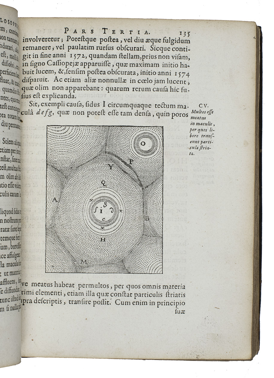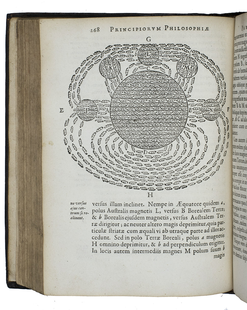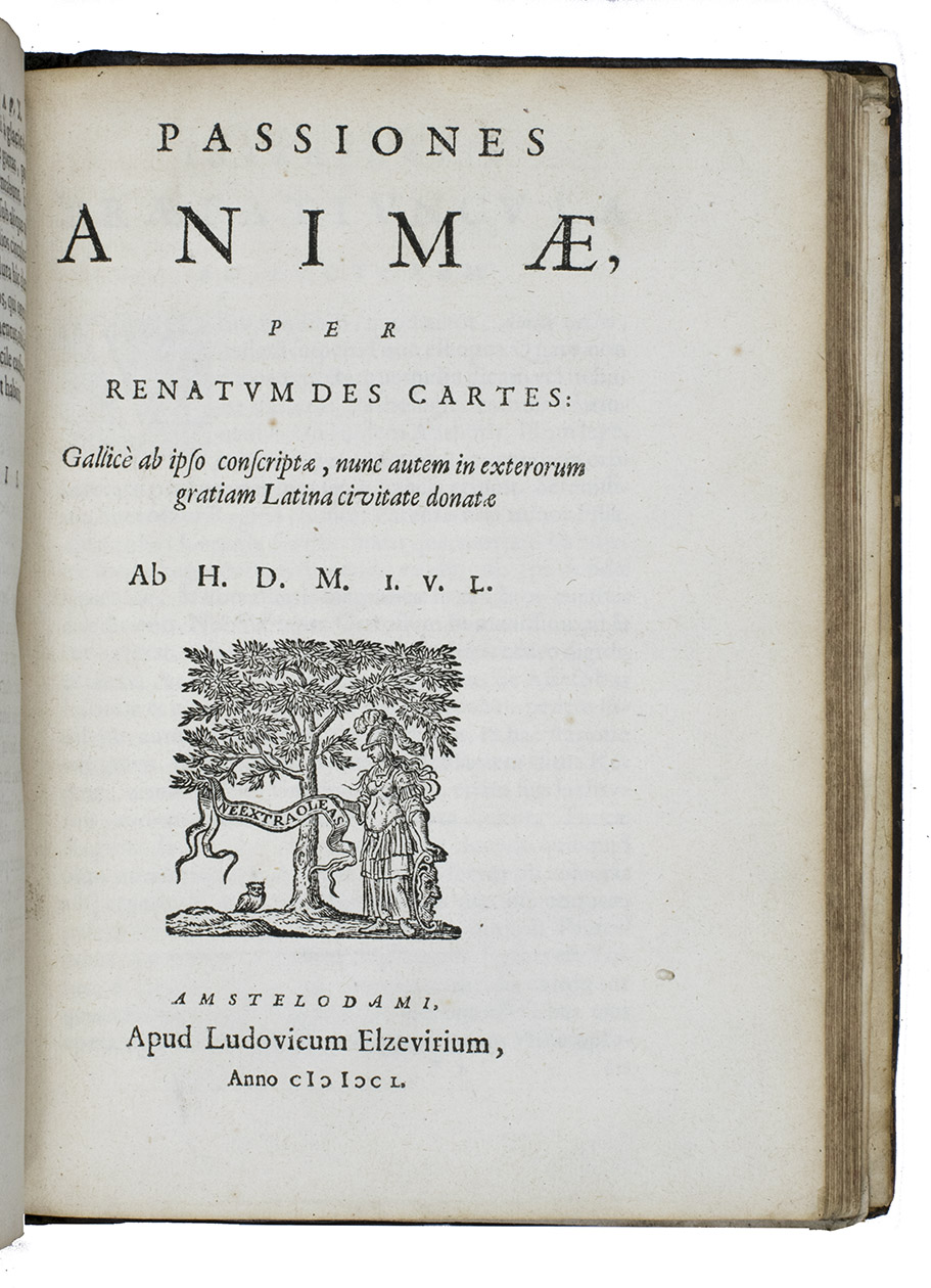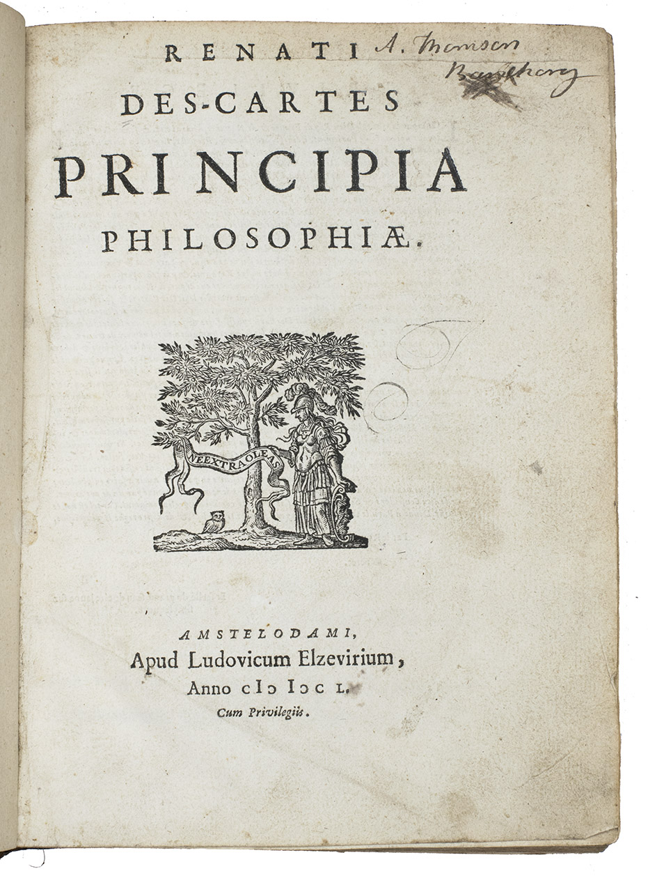 Third edition of the Principia in the original Latin, bound with the associated third Latin editions of the two supplementary works, the three published in matching format and layout in the year of the authors death by Louis Elzevier, who published all of the earlier Latin editions in 1644 and 1650. Together these three books form the collected principal works of René Descartes (1596-1650), arguably the most influential philosopher of early modern Europe. Louis Elzevier first published Descartess Principia philosopiae in 1644. It contains the philosopher's thoughts on the structure of the universe, including his highly influential vortex theory, illustrated with woodcuts after drawings by Franciscus van Schooten. Although Descartes wrote the Principia in Latin, he had earlier written two books in French that he now revised and corrected for publication in Latin by Louis Elzevier, matching the format and layout of the Principia so that they could be issued together. They originally appeared in French as Discourse de la methode pour bien conduire sa raison (1637) and Les passions de lame (1649). Elzevier published the Latin edition of the Discourse ..., with the present title Specimina ... together with the first edition of the Principia in 1644. In 1650 he published new editions of both as well as the first Latin edition of the French Passion ..., under the present title Passiones animae. Later in 1650 he published new editions of all three works, the present set, but their layout and typography matches the earlier 1650 4to editions so closely that the classic bibliographies, including Willems, Rahir and Berghman do not distinguish them.