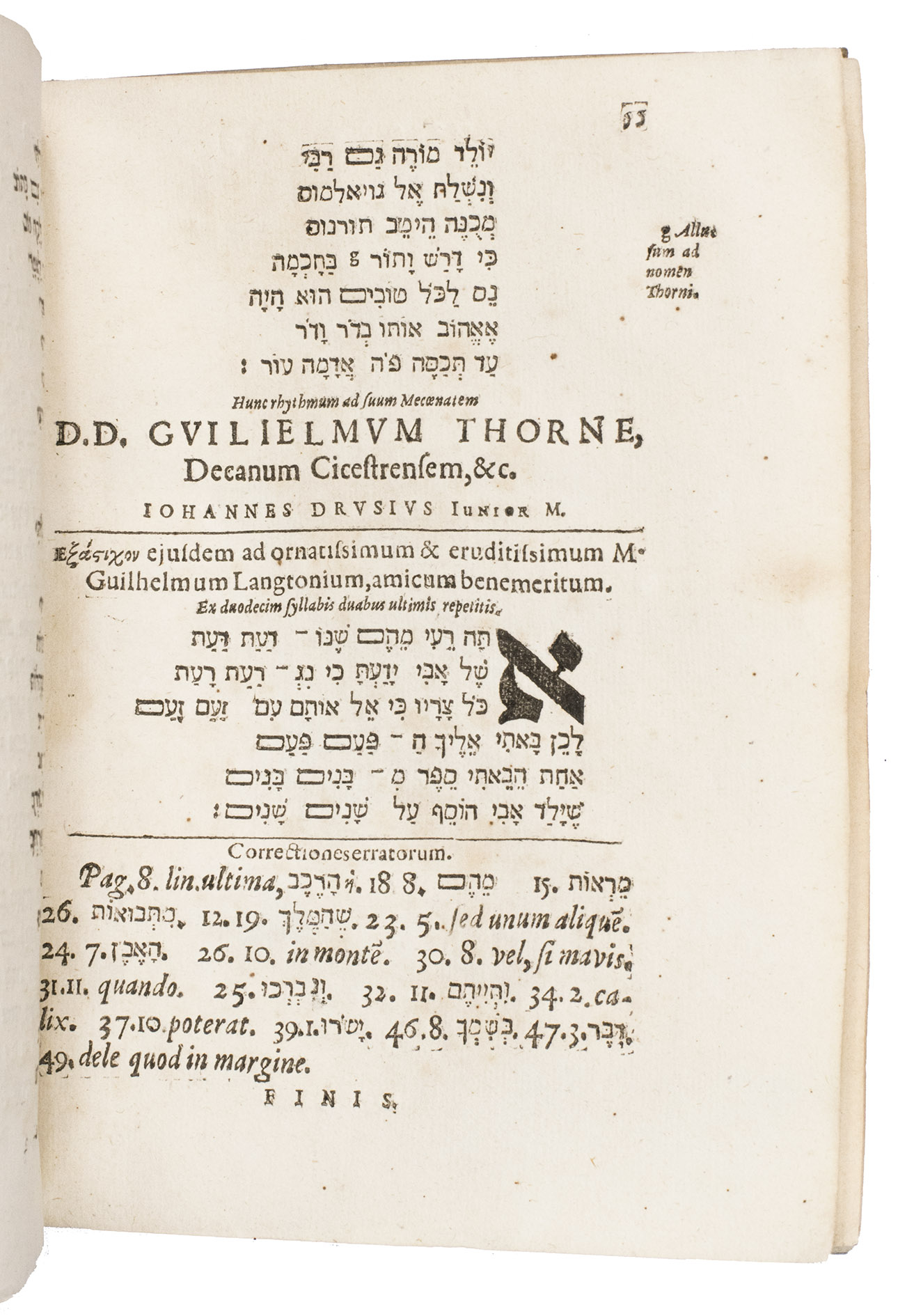 Ad 2: Third, much enlarged, edition by Johannes Drusius on Hebrew orthography, edited by his son Johannes Junior (1588-1609), who died in the year of the work's publication at an early age. The work is dedicated to Guilielmus Thornus - better known as William Turner (1509/10-1568), an English "divine" (early clergy of the Church of England), reformer, physician, and natural historian.