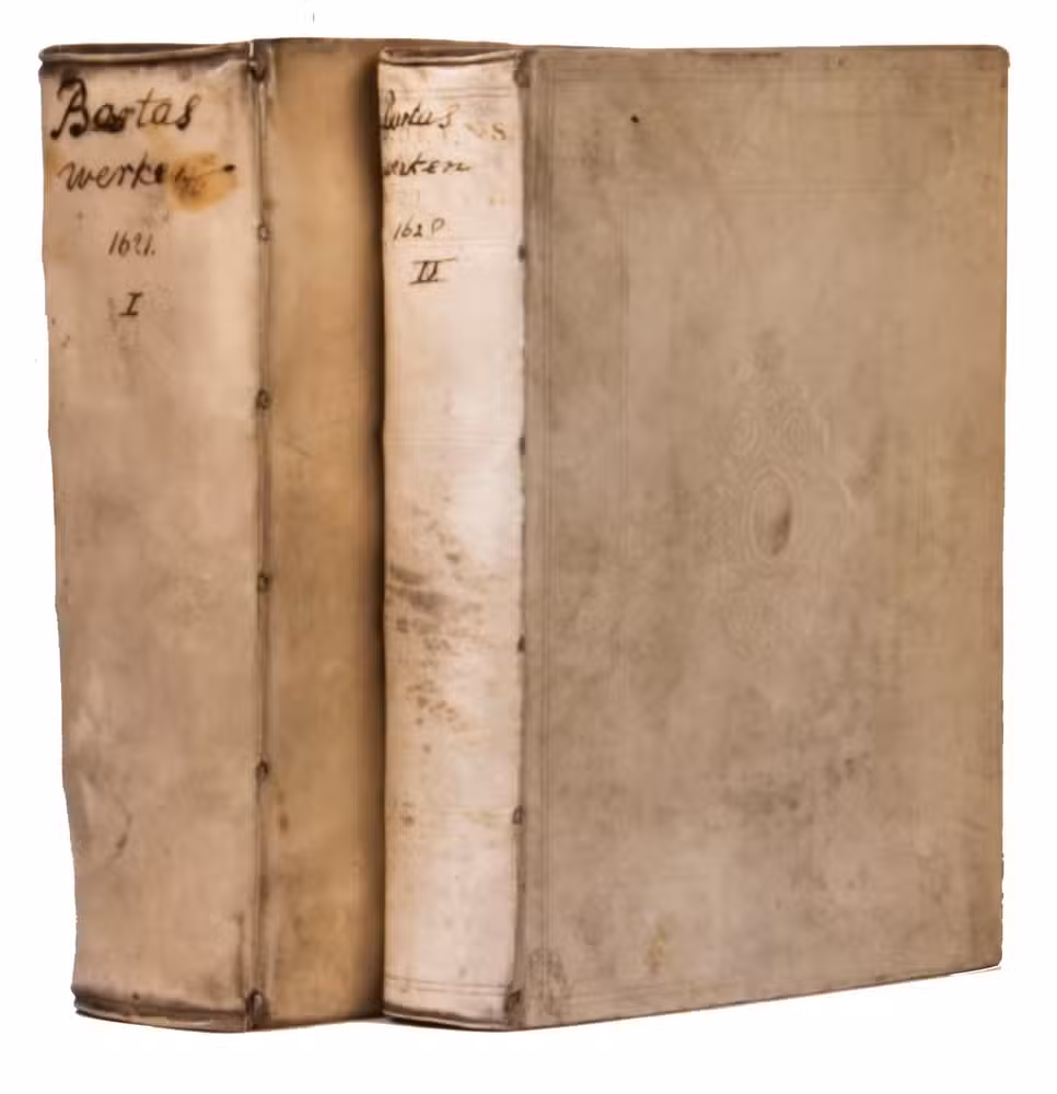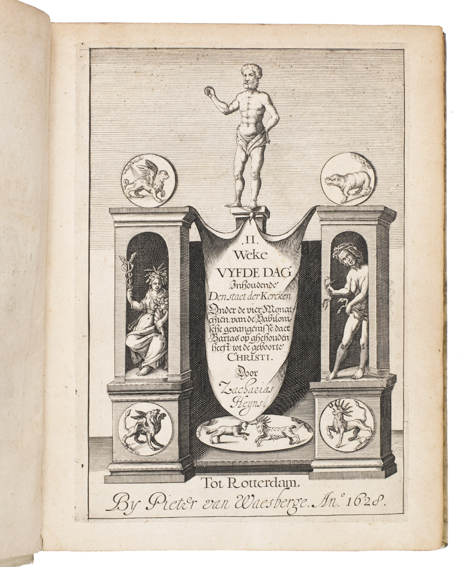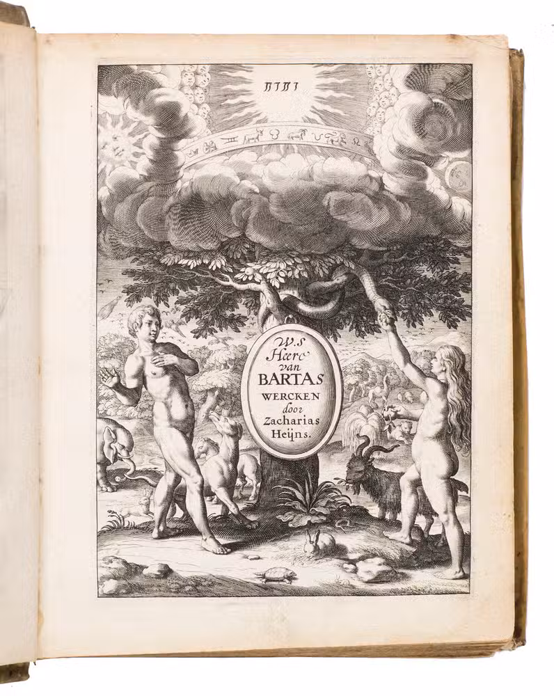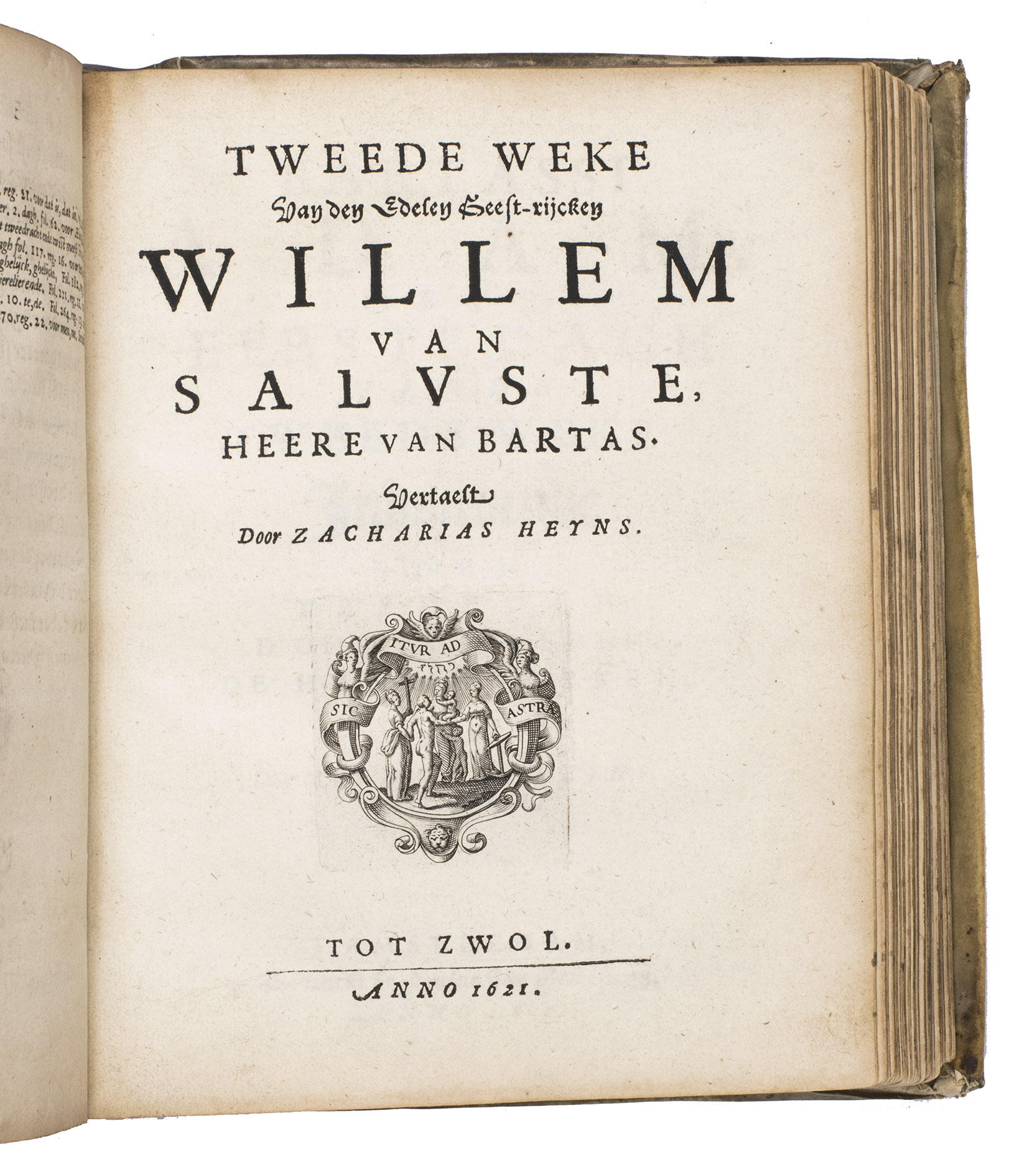 [Zwolle, Zacharias Heyns], [1621]-1628. 3 parts in 2 volumes. 4to. With 2 engraved title pages, the engraved publisher's device on the title page of part 2, the engraved portrait of Zacharias Heyns in the text of part 1 and 34 full-page engravings (incl. 1 large folding plate and 1 plate outside the collation) illustrating the days of the two weeks and the other texts by Du Bartas. Woodcut initials, head- and tailpieces. Both volumes bound in almost matching 17th-century vellum, both spines with manuscript title in black ink. Volume 1: part 1: [12], 1-168, 168-183, [1], 184-313, [1] pp.; part 2: [8], 634, [6] pp. Volume 2: part 3: [8], 150, [2], 231, [1] pp.