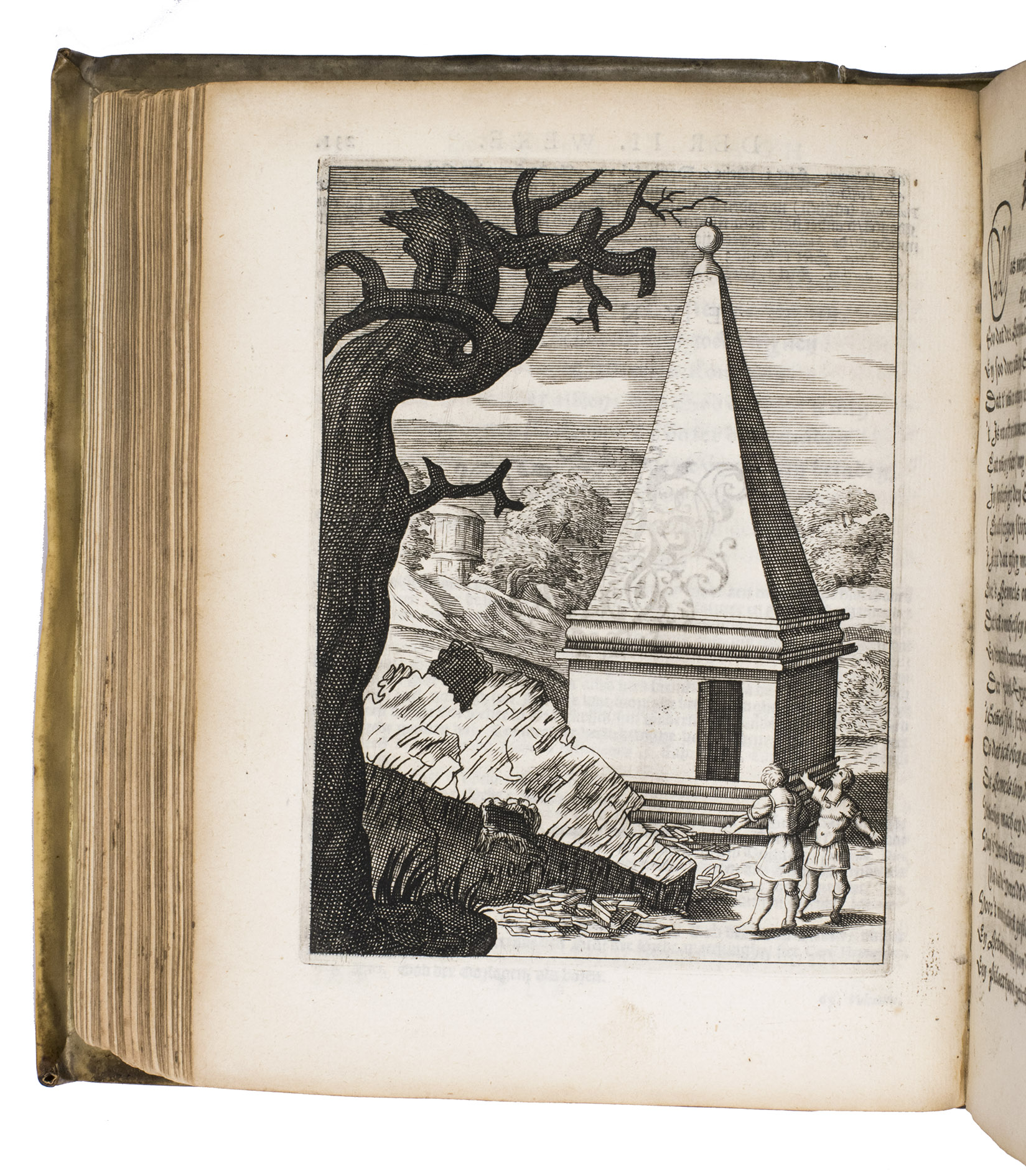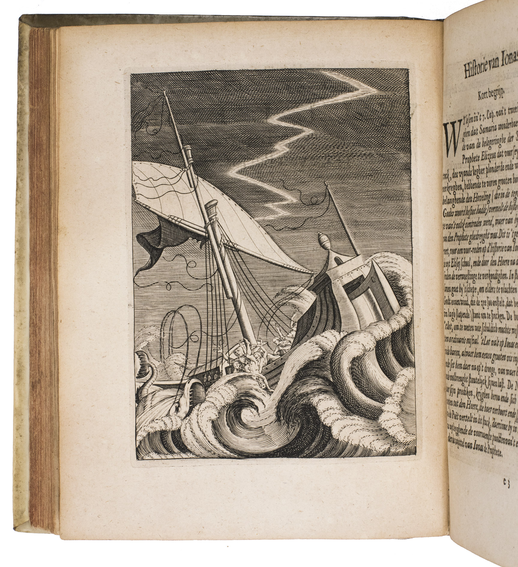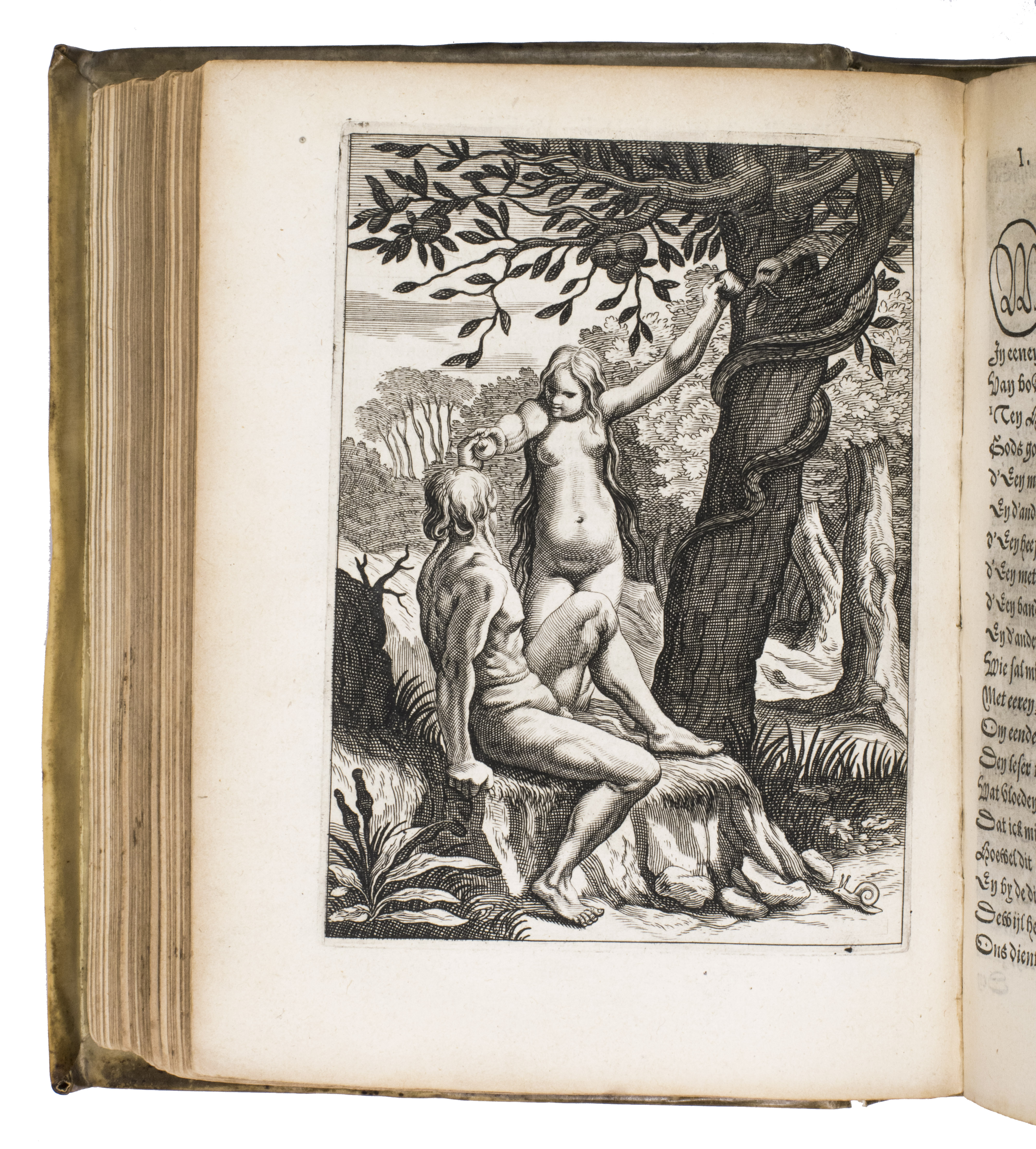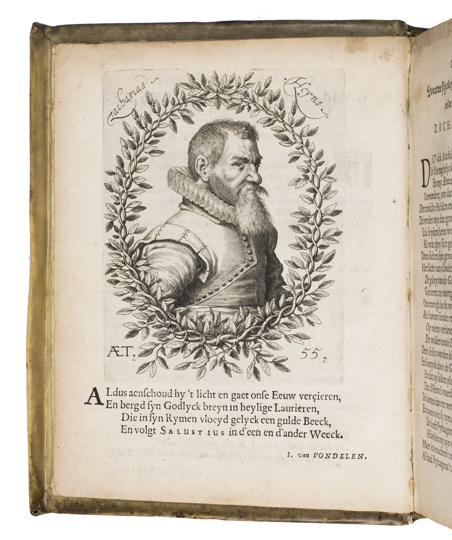 [Zwolle, Zacharias Heyns], [1621]-1628. 3 parts in 2 volumes. 4to. With 2 engraved title pages, the engraved publisher's device on the title page of part 2, the engraved portrait of Zacharias Heyns in the text of part 1 and 34 full-page engravings (incl. 1 large folding plate and 1 plate outside the collation) illustrating the days of the two weeks and the other texts by Du Bartas. Woodcut initials, head- and tailpieces. Both volumes bound in almost matching 17th-century vellum, both spines with manuscript title in black ink. Volume 1: part 1: [12], 1-168, 168-183, [1], 184-313, [1] pp.; part 2: [8], 634, [6] pp. Volume 2: part 3: [8], 150, [2], 231, [1] pp.