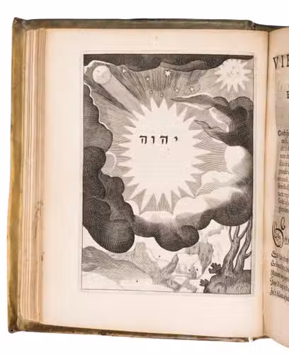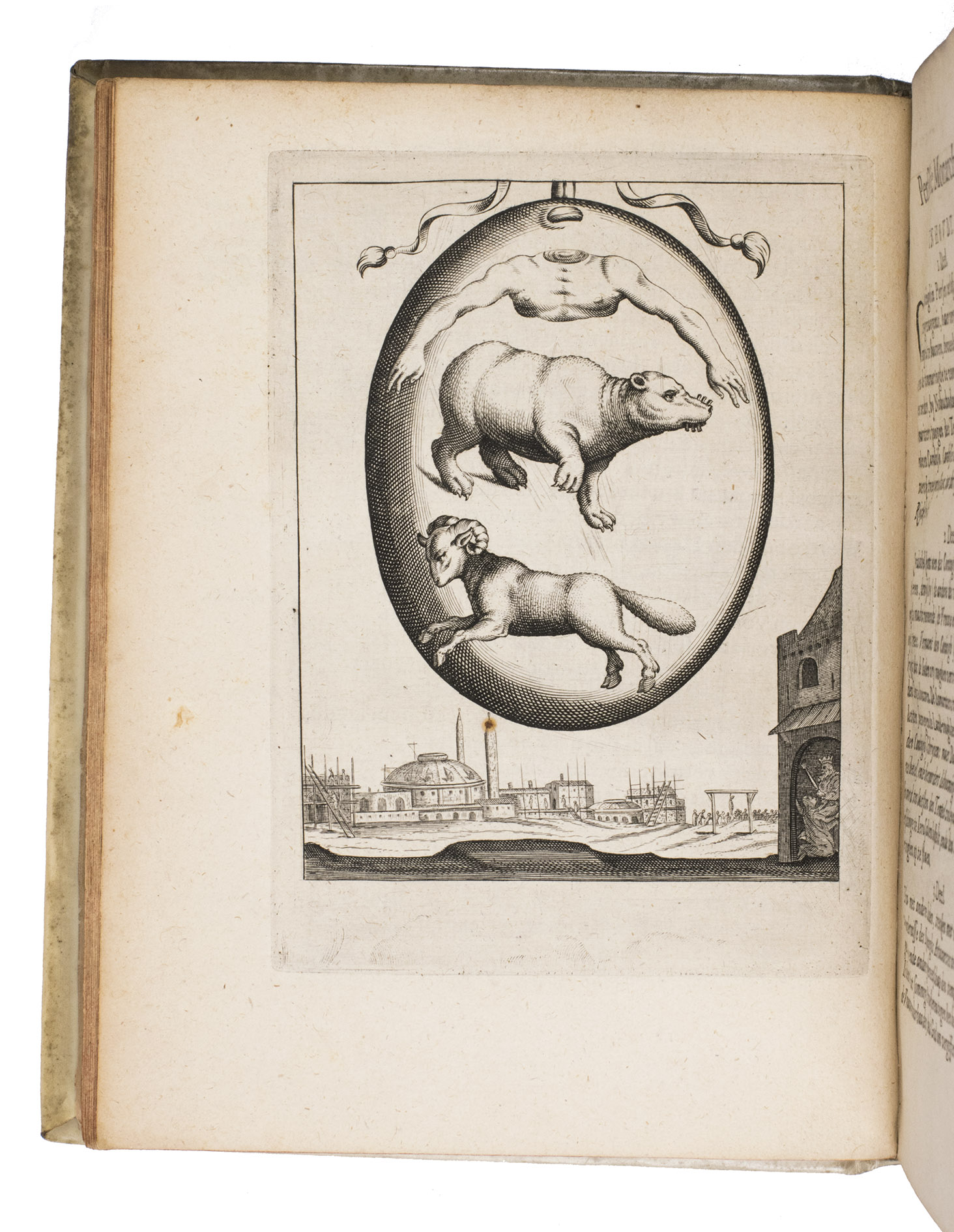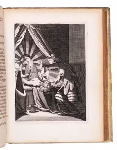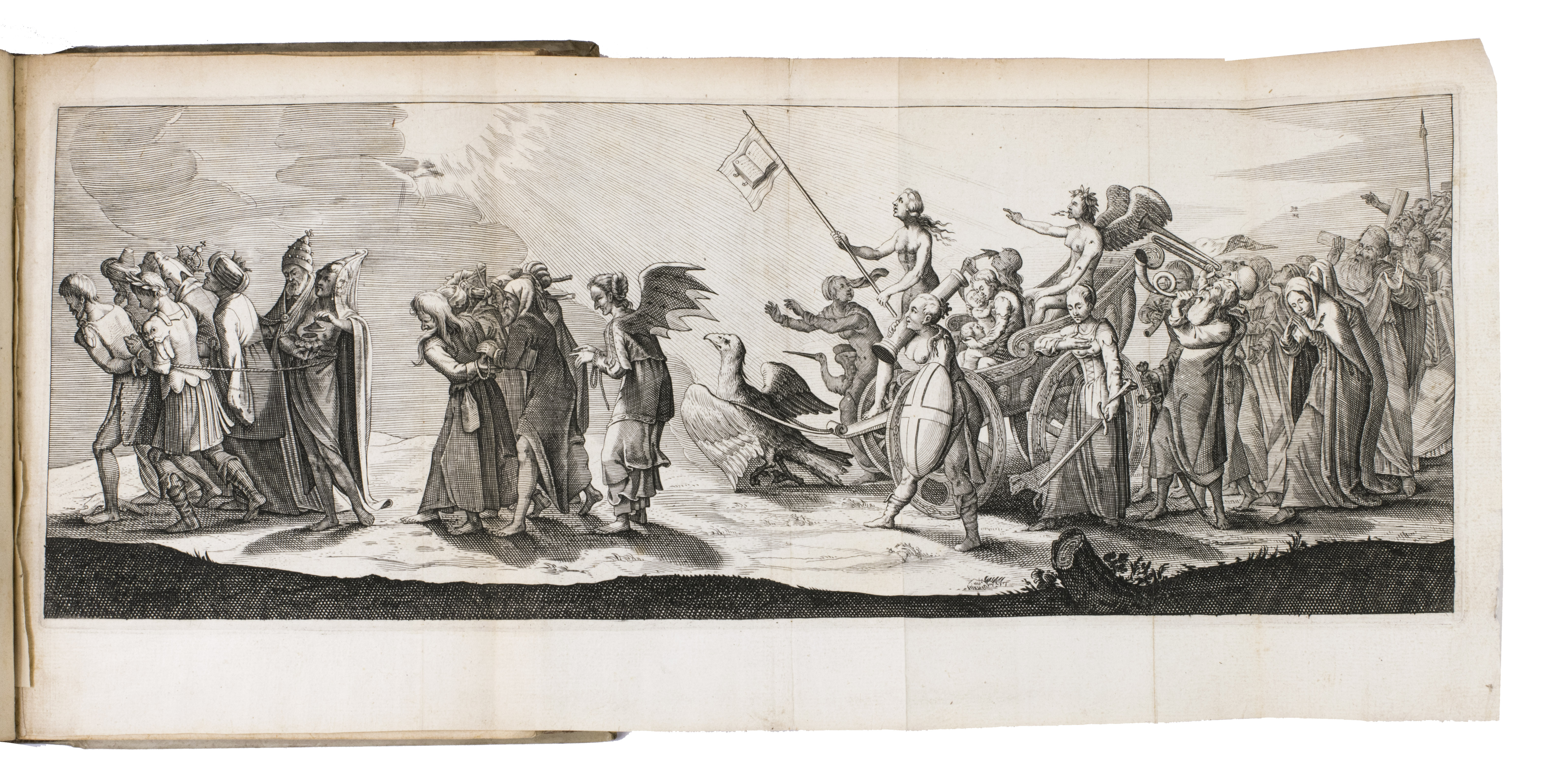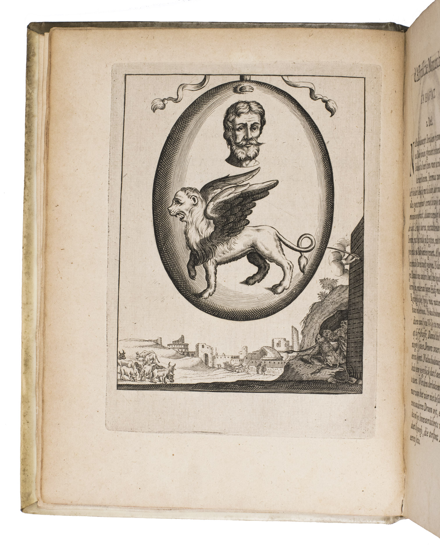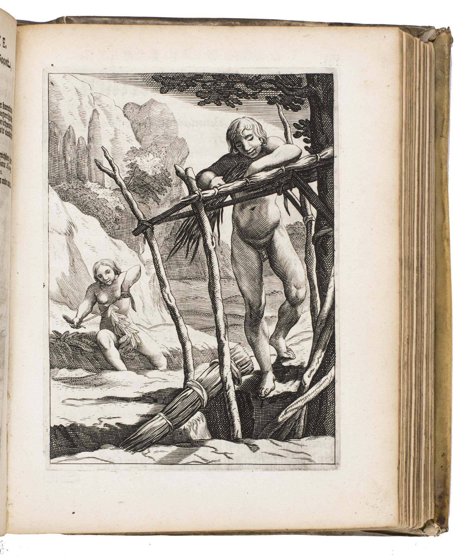 [Zwolle, Zacharias Heyns], [1621]-1628. 3 parts in 2 volumes. 4to. With 2 engraved title pages, the engraved publisher's device on the title page of part 2, the engraved portrait of Zacharias Heyns in the text of part 1 and 34 full-page engravings (incl. 1 large folding plate and 1 plate outside the collation) illustrating the days of the two weeks and the other texts by Du Bartas. Woodcut initials, head- and tailpieces. Both volumes bound in almost matching 17th-century vellum, both spines with manuscript title in black ink. Volume 1: part 1: [12], 1-168, 168-183, [1], 184-313, [1] pp.; part 2: [8], 634, [6] pp. Volume 2: part 3: [8], 150, [2], 231, [1] pp.