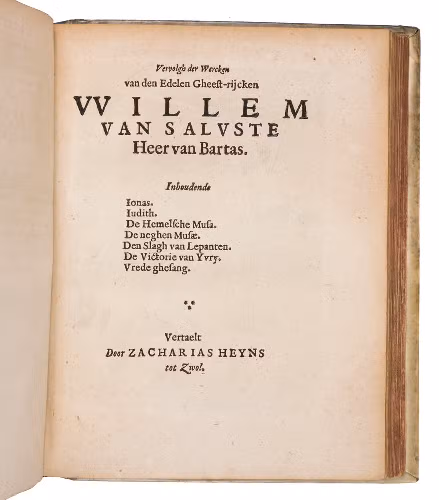 Very rare complete and first set (in 4to) of the works of the famous French Huguenot courtier and Renaissance poet Guillaume de Salluste Du Bartas (1544-1590), the celebrated author across 16th- and 17th-century Europe for his divine poetry which has been very influential for generations of European poets. Many times he was translated: thrice in Latin, in Spanish, English, German and also thrice in Dutch. Especially his two "Semaines" (Weeks) were popular both to Catholics and Protestants for their impartiality in religious questions and problems.