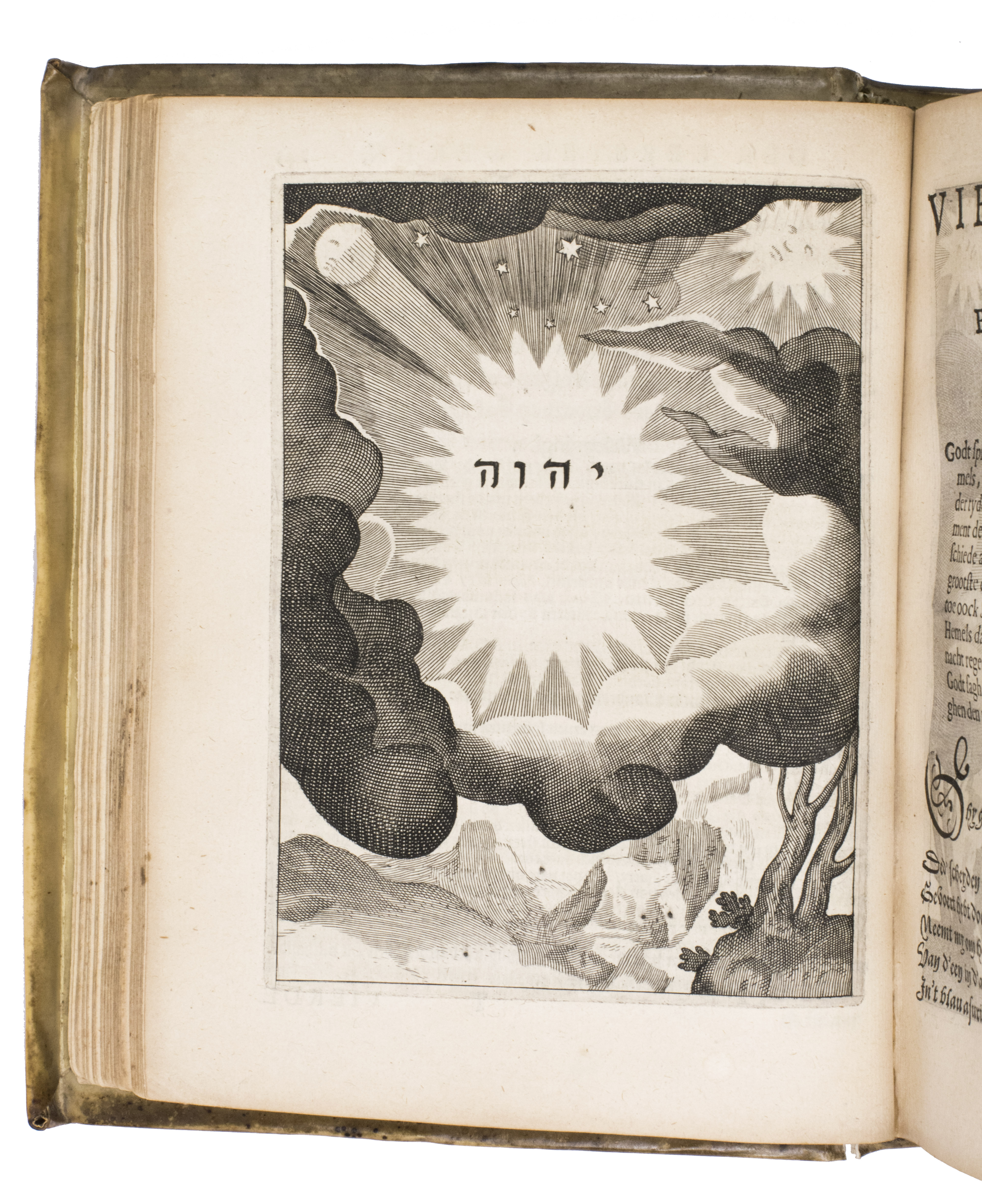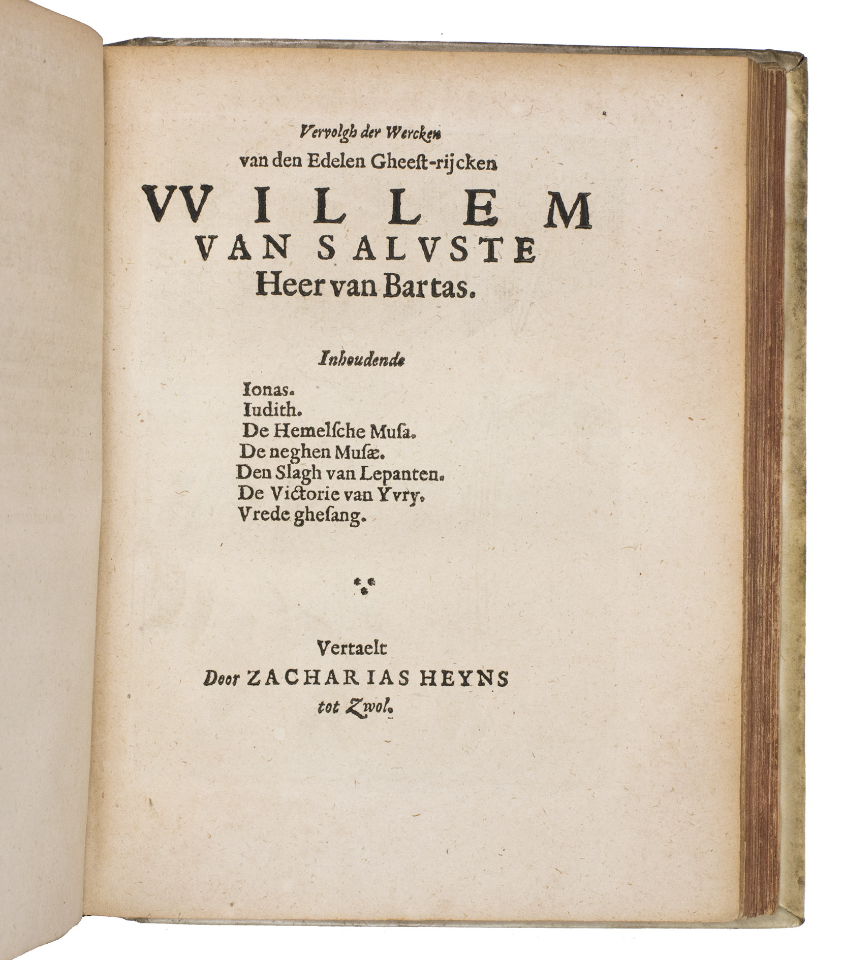 With the owner's stamp of the Dutch archivist and bibliographer J.H.W. Unger (1861-1904) on the front pastedown of volume 1. From the library of the famous Dutch book collector Michiel Buisman J.Fzn. (1891-1986) with his signature in black ink on the first free endpaper of both volumes. On p. 32 [erroneously numbered "30"] of volume 2 a slip of paper with two extra lines of poetry is mounted below the final two lines. Apart from some occasional browning and soiling a good set of this extraordinary and complicated edition. A. Beekman, Influence de Du Bartas sur la litt. néerlandaise (1912); H. Meeus, Zach. Heyns. Een drucker die nooit drukte, in: De Gulden Passer, 73 (1995), pp. 123-124; NNBW, II, cols. 576-577; Paul J. Smith, Du Bartas in vertaling: imitatie, emulatie, plagiaat, in: De Zeventiende Eeuw, 21 (2005), pp. 198-209.