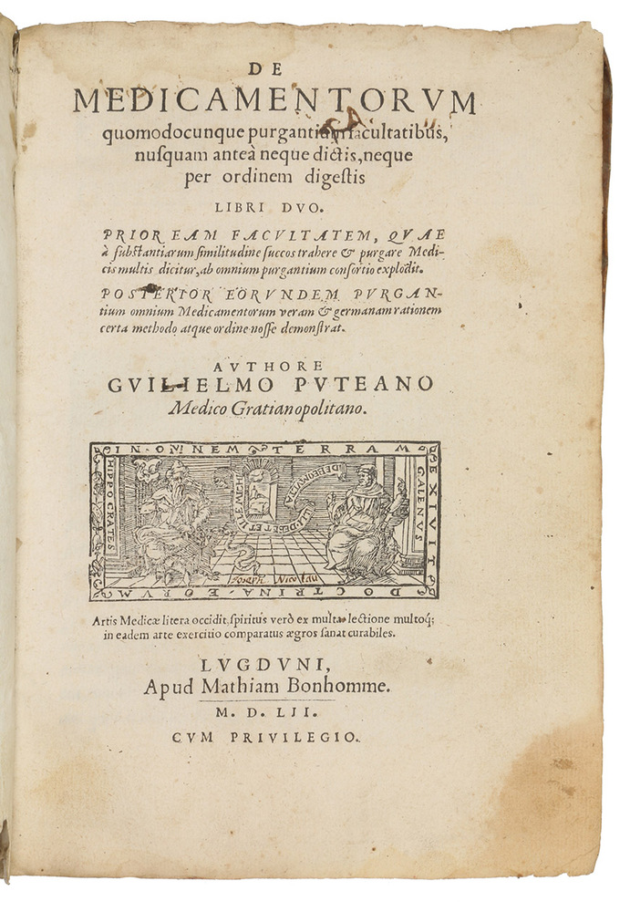 Rare the first edition of a pharmaceutical treatise by the elusive physician Guillaume Dupuis (active 1536-1551) from Blangy in northern France but long settled in Grenoble. "Il ... exerca longtemps la médicine avec une grande réputation ... [et] était en même temps professeur à luniversité de cette ville" (Hoefer). The work was republished in 1554, with a treatise by Cousinot, under the title De occultis pharmacorum purgantium facultatibus. Like most of its kind, it draws heavily on Galen and the Arabic tradition of Mesue.