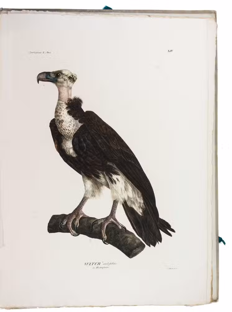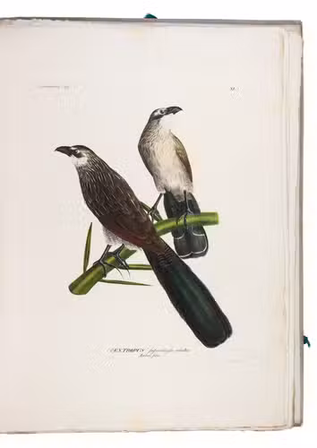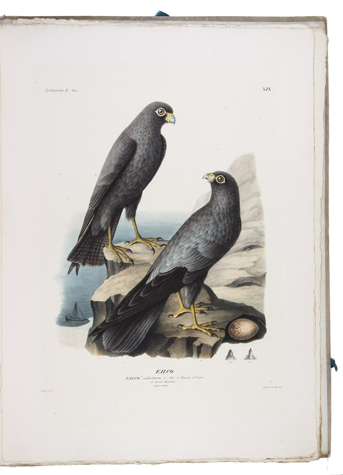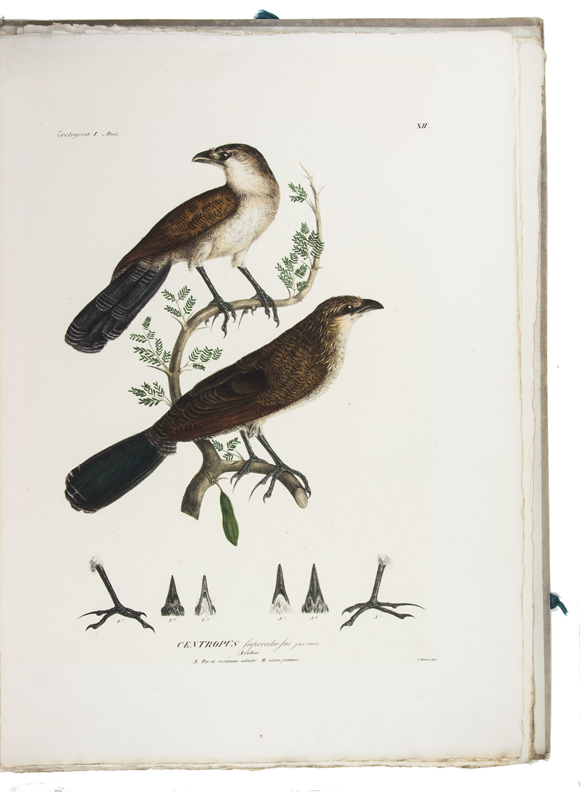 Very rare undistributed second and final part of beautiful bird plates (XI-XX) for the series Symbolae physicae by the German zoologist Christian Gottfried Ehrenberg (1795-1876). The large plates, beautifully coloured by hand, show birds from northern Africa and the Middle East. They are shown perched on branches, many surrounded with detail drawings of bills and feet. They were drawn by Wilhelm Müller and Friedrich Bürde and executed by Bürde, Elsasser, Pohlke and Schmidt.This monumental work on animals, and later also plants, from Africa and the Middle East was published in parts, the original series from 1828 to 1845 covering mammals, birds, insects and other invertebrates, giving 90 plates in total. Additional parts covering other kinds of animals (32 or 34 plates) and plants (24 plates) appeared in 1899 and 1900. The literature describes the present work as unfinished, but the ten additional bird plates were in fact printed, though never distributed.