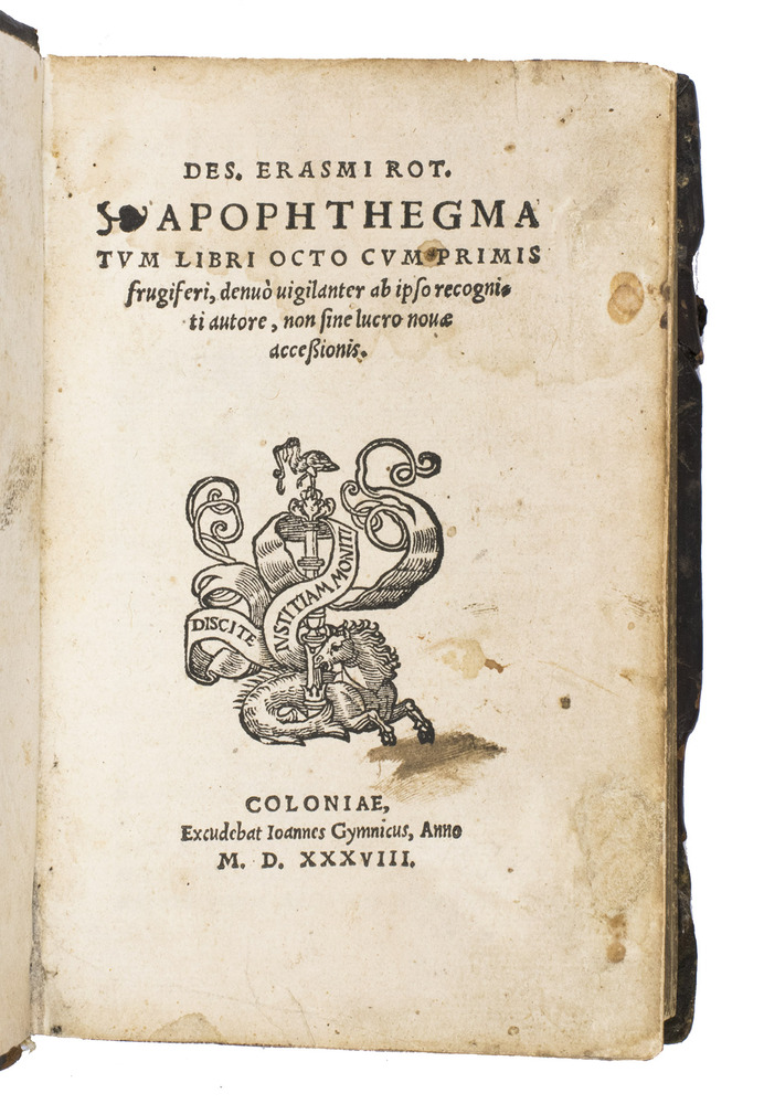 Rare second(?) edition of the revised and expanded text of Erasmus's important and popular collection of more than two thousand aphorisms, apothegms and anecdotes, in the original Latin, first published by Froben at Basel in 1531 in six "libri" but finding its definitive form in his 1535 edition in eight "libri". Gymnich, with the present edition, appears to be the first after Froben to publish the revised 1535 text. The book is a collection of short quotations from a wide variety of sources, intended to be both educational and entertaining.