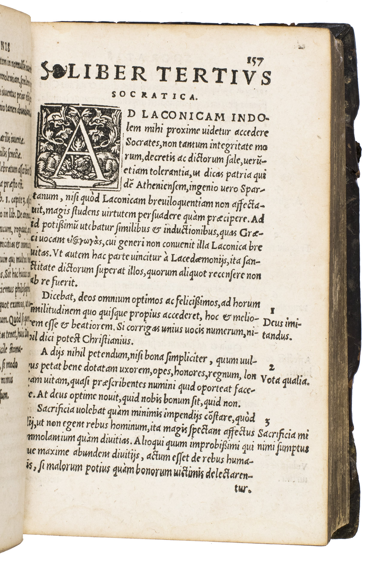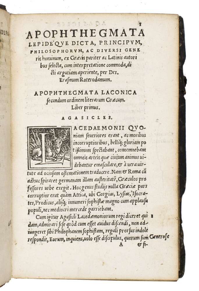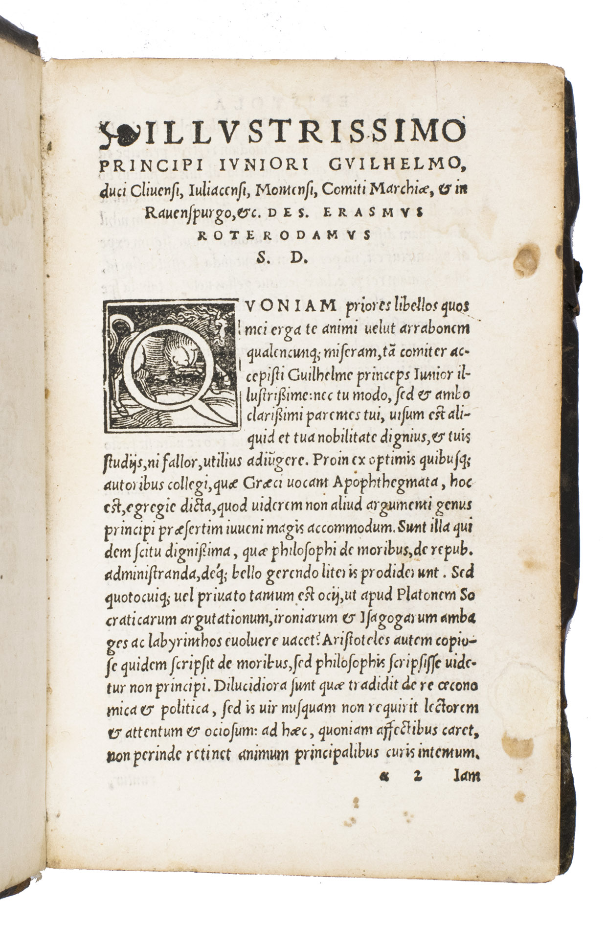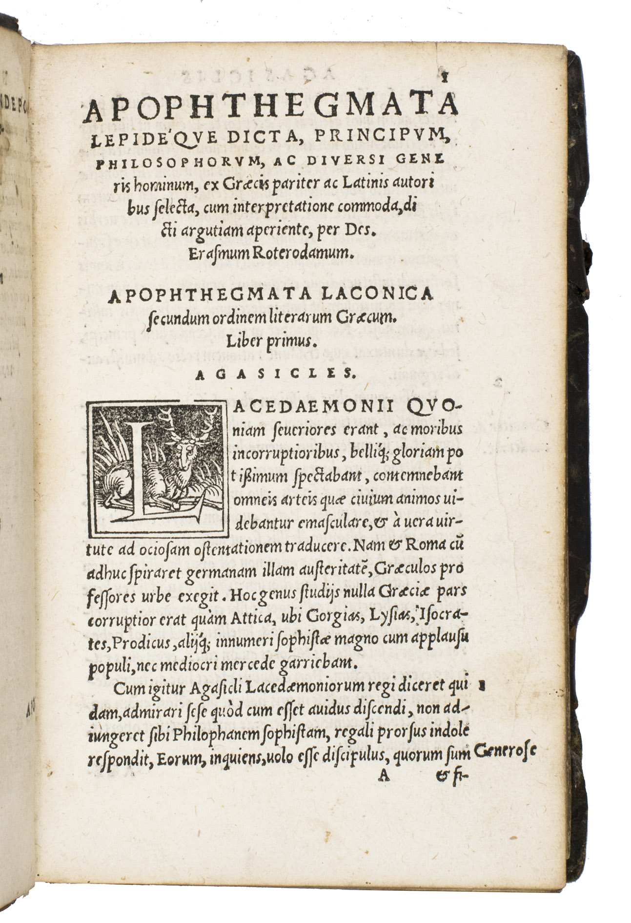 With the large armorial owner's stamp of Simon Clüver (ca. 1540-1598), some of whose books went to Leiden University via his grand nephew, the historical geographer Philipp Clüver (1580-1622). Hulshoff Pol records this stamp on a binding dated 1564, but in the present binding it has been stamped over the existing decoration on the front board, so the binding itself may be older than the owner's stamp. With numerous small stains in the preliminaries, some mostly marginal water stains and a few small marginal worm holes, but otherwise in good condition and only slightly trimmed, retaining an occasional deckle. The owner's stamp has been impressed quite deeply and has therefore been well preserved, but the rest of the binding is worn, with some cuts, tears and gaps, and the surface of the spine flaking. One of the earliest editions of one of Erasmus's most popular and most entertaining works, in a near contemporary, blind-tooled binding. Rotterdam City Library, Cat. Erasmus Collection, p. 22; USTC 635471 (4 copies); VD16, E2039 (same 4 copies); for owners stamp on binding: Hulshoff Pol, The first century of Leiden University Library (1975), p. 414.