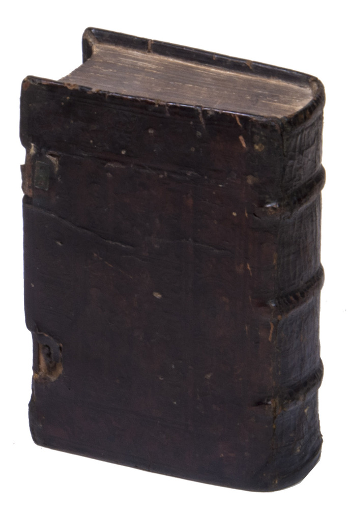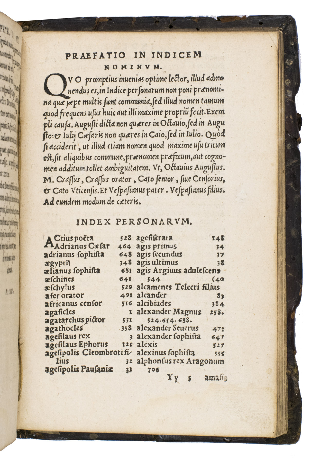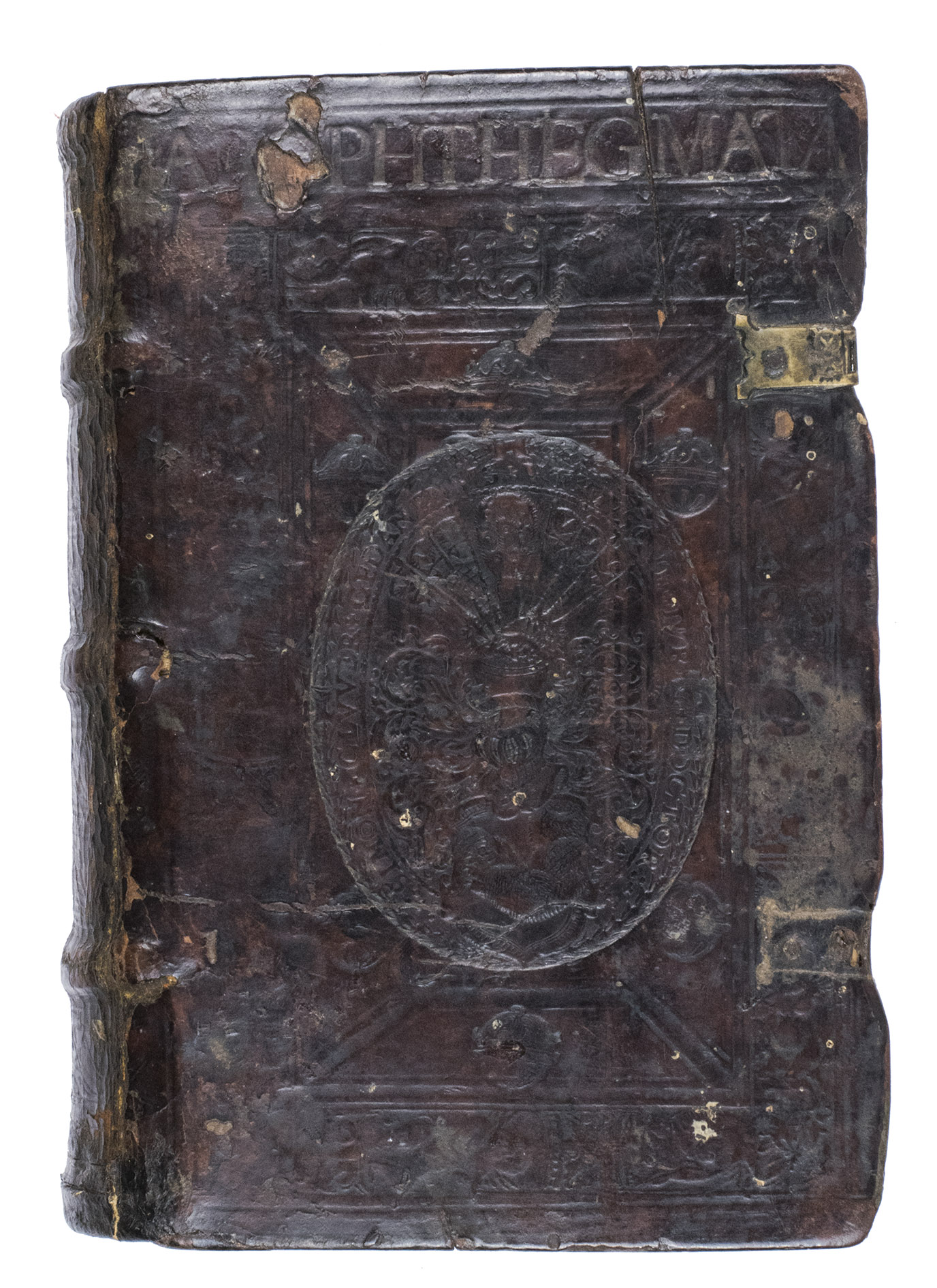 Cologne, Johann Gymnich I, 1538. 8vo (16 x 11 x 4.5 cm). With Gymnich's woodcut device, 9 woodcut initials (2 series) plus 1 repeat, and a vine-leaf ornament. Set in an Aldine-style italic with incidental roman and Greek. Near contemporary blind-tooled calf (the owner's stamp ca. 1564?, added later than the rest of the tooling) over wooden boards, each board in a panel design, the front board with the large oval armorial panel-stamp (72 x 55 mm) of Simon Cluver of Gedansk (ca. 1540-1598); the back board with 2 rolls showing Christian imagery. With 1 of 2 brass catchplates but further with only remnants of the fastenings. [16], 712, [38], [2 blank] pp.