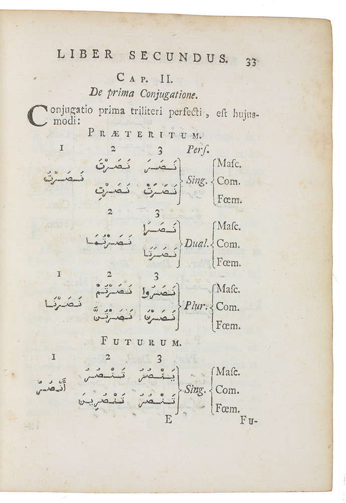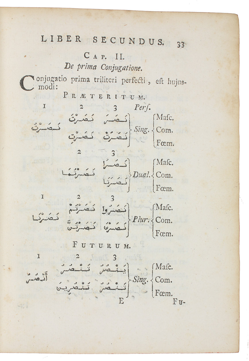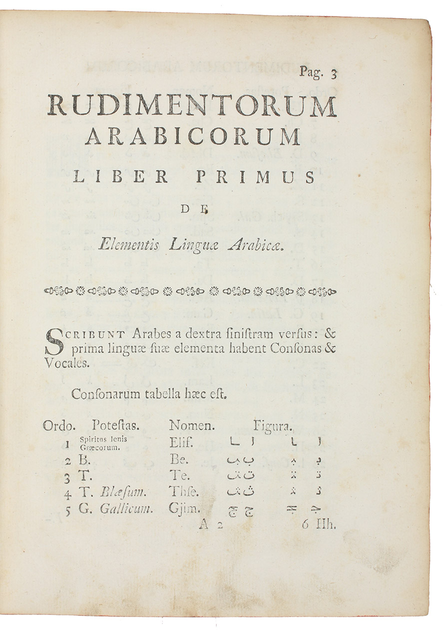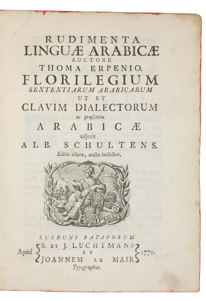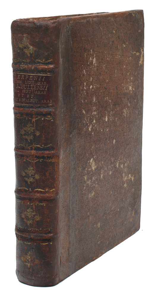 Fifth, enlarged edition of the groundbreaking introduction to the Arabic language by Thomas Erpenius (1584-1624), the first professor of Arabic at Leiden University. He printed and published the first edition himself in 1620, one of the earliest major works using the Arabic types cut for his new oriental printing office by Arent Corsz. Hoogenacker in 1615. The Elzevirs acquired Erpeniuss materials and many of his workmen after his premature death from the plague and printed and published the second edition in 1628. Vitrays third edition (Paris, 1638) is based on the second. These were all in 8vo format with about 250 pages. Albert Schultens (1686-1750), appointed professor of oriental languages at Leiden in 1732, prepared a greatly enlarged 4th edition in 1733, now in 4to format and more than three times as long. The additions included his own Clavis dialectorum, discussing the relations between Hebrew and Arabic words, and the Nawabig ul-kalim, a collection of proverbs compiled by the linguist Mahmud ibn Umar al-Zamabshari (1075-1144 CE; AH 467-538) in what became Uzbekistan and Turkmenistan. The present 5th edition expands it still further, especially the indexes (the Arabic index filling 142 pages).