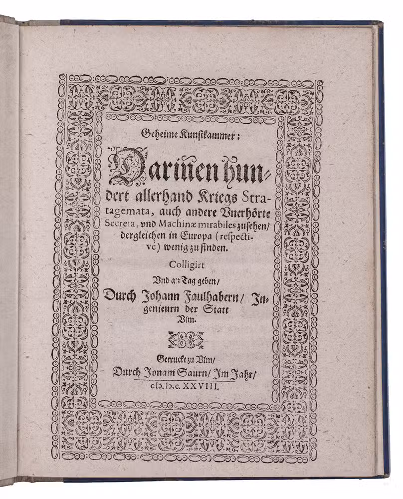 Very rare first and only edition of a catalogue of military and other instruments, models of machines, plans, etc., that Faulhaber displayed in the "Kunstkammer" in his house in Ulm.