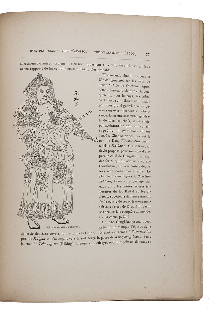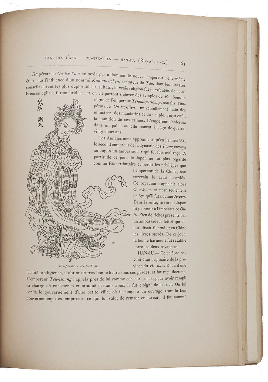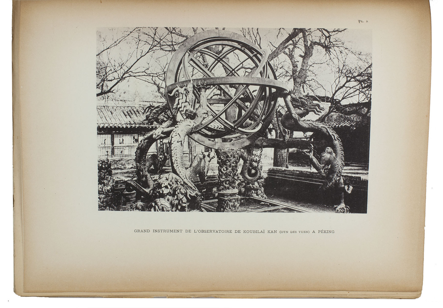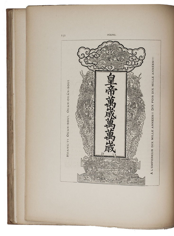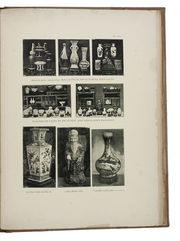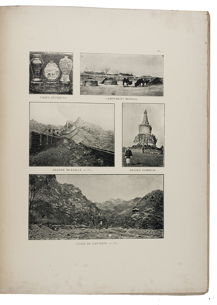 Peking, Imprimerie des Lazaristes au Pe-Tang, 1897. 35.5 x 25.5 cm. 2 volumes bound as 1 (continuous page numbers). With a frontispiece to each part, 51 plates with photolithographs and collotypes, 1 tinted map, and 660 wood engraved illustrations in text. Modern half cloth, with the original wrappers bound in. XII [4], 336, [4], 337-“562” [= 552], [2] pp.