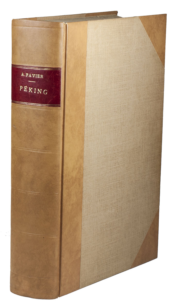 First edition of an important source on Beijing in the late 19th century, written by the Lazarite Vicar Apostolic Alphonse Favier (1837-1905). Favier arrived in China in 1862 and became the Vicar Apostolic of Northern Chihli in 1899. Originally educated as an architect, he helped to rebuild the Xishiku Church, also called Beitang, in 1887. The work is divided into two volumes. The first deals with the history of Beijing, starting with the topography, followed by old myths and legends, the subsequent dynasties, and an extensive account on Christianity and the different missionary orders in China. In the second a description of the city is given, including the statues, gardens, churches and palaces that are to be found there. The photographic illustrations show unique views of the city in the late 19th century. This copy is numbered 191 (of 800?).With an inscription on half-title, dated 12 October 1909. Slightly browned throughout, but otherwise a very good copy, wholly untrimmed. The original wrappers are included, but worn. Cordier, Sinica, col. 218.