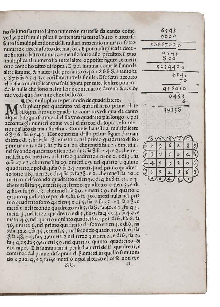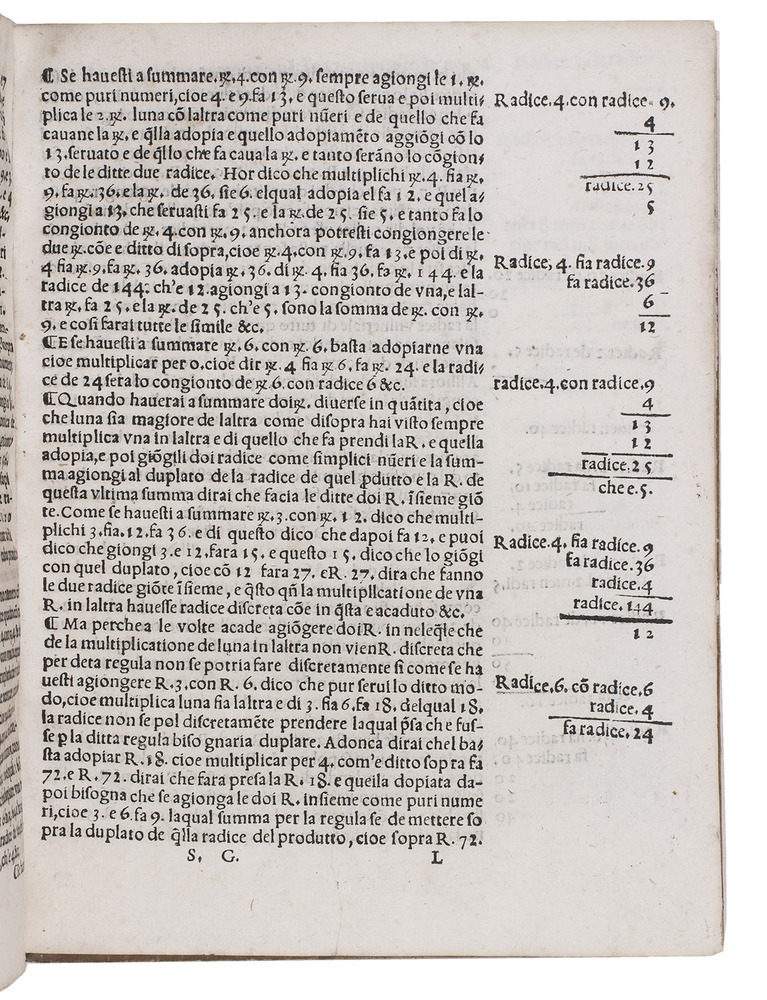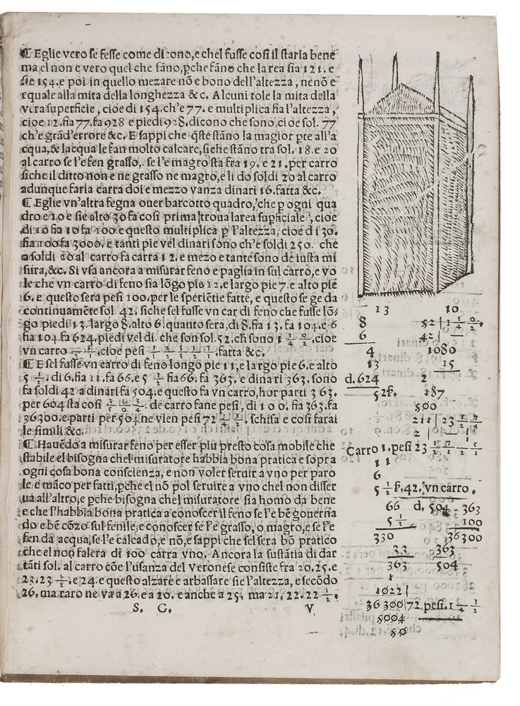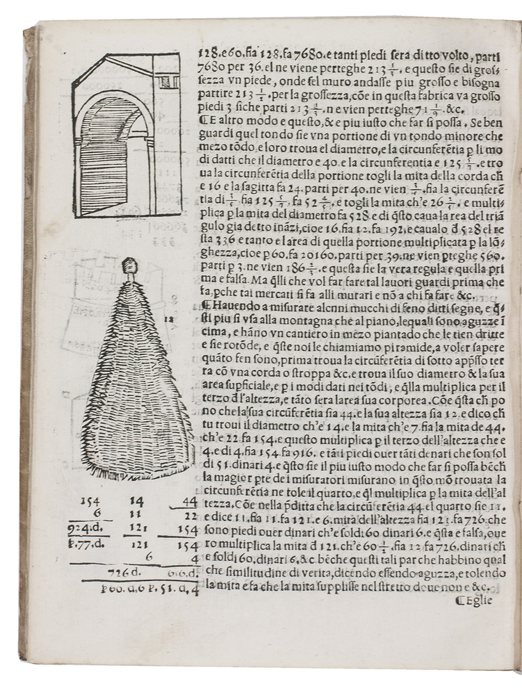 1563 edition of a popular Italian treatise on arithmetic and geometry by the Italian mathematician Fransesco Feliciano da Lazesio (1570-1542). First published in 1526 at Venice, it became immensely popular and went through many, revised editions, the present edition probably being the 8th. It is divided into three parts, starting with an introduction, followed by a part on arithmetic and roots and a part on practical geometry and measurements. When first published it was the first book describing the use of the surveyor's cross, an innovative tool at a time when long distances were often merely estimated by sight. "Few books had greater influence on the subsequent teaching of elementary mathematics" (Smith).