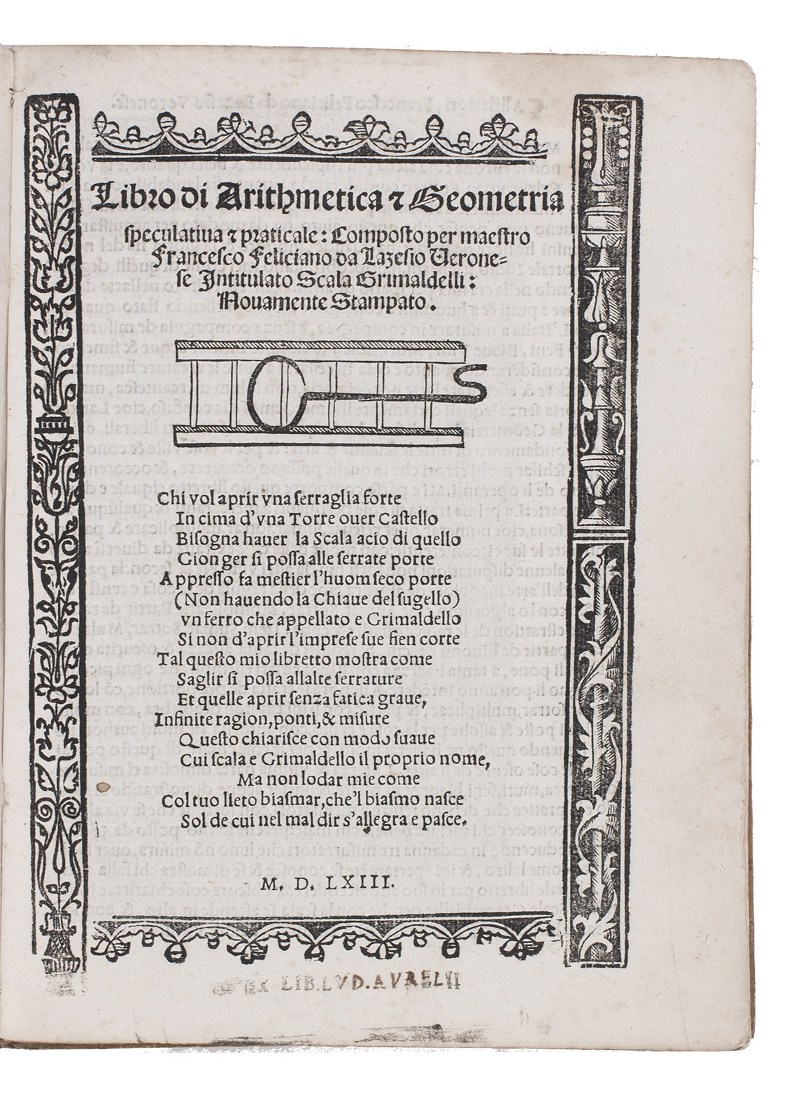 (Colophon: Venice, Francesco de Leno), 1563. 4to. With the title in a 5-piece woodcut border with an allusive woodcut illustration (ladder and key), and with numerous woodcut diagrams, geometric figures and other illustrations printed in the large fore-edge margin. Contemporary sheepskin parchment. [80] ll.