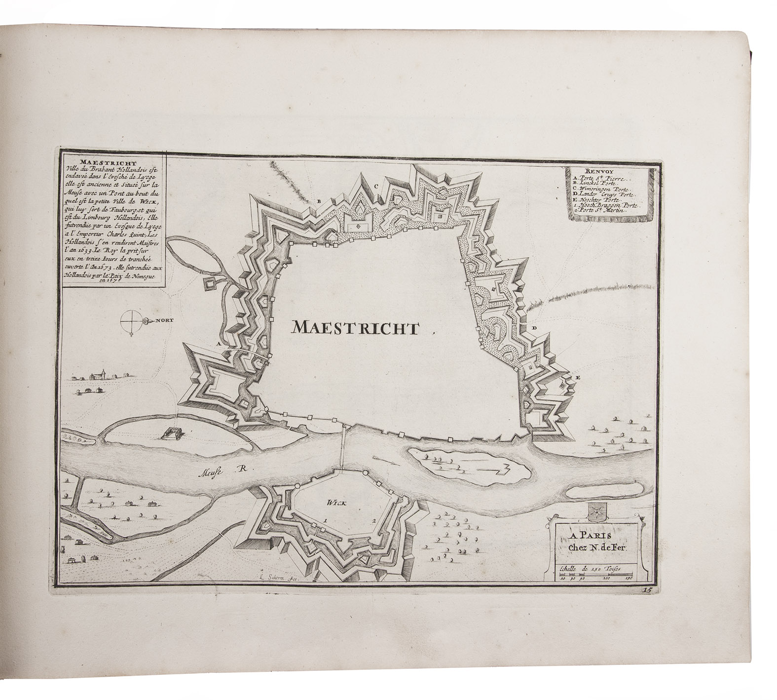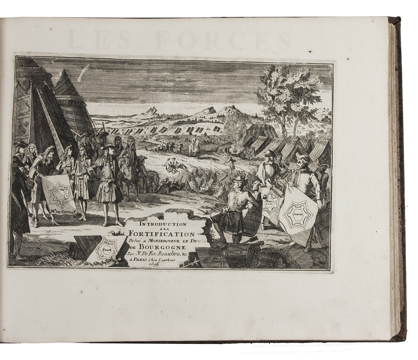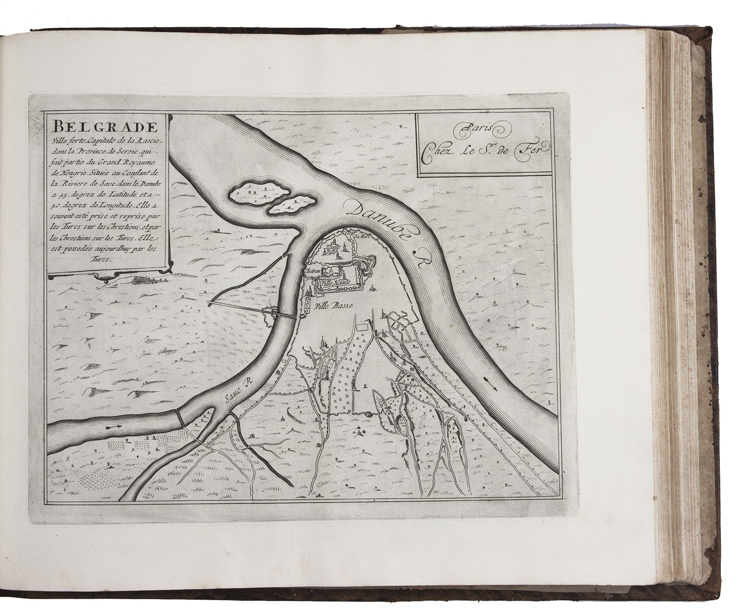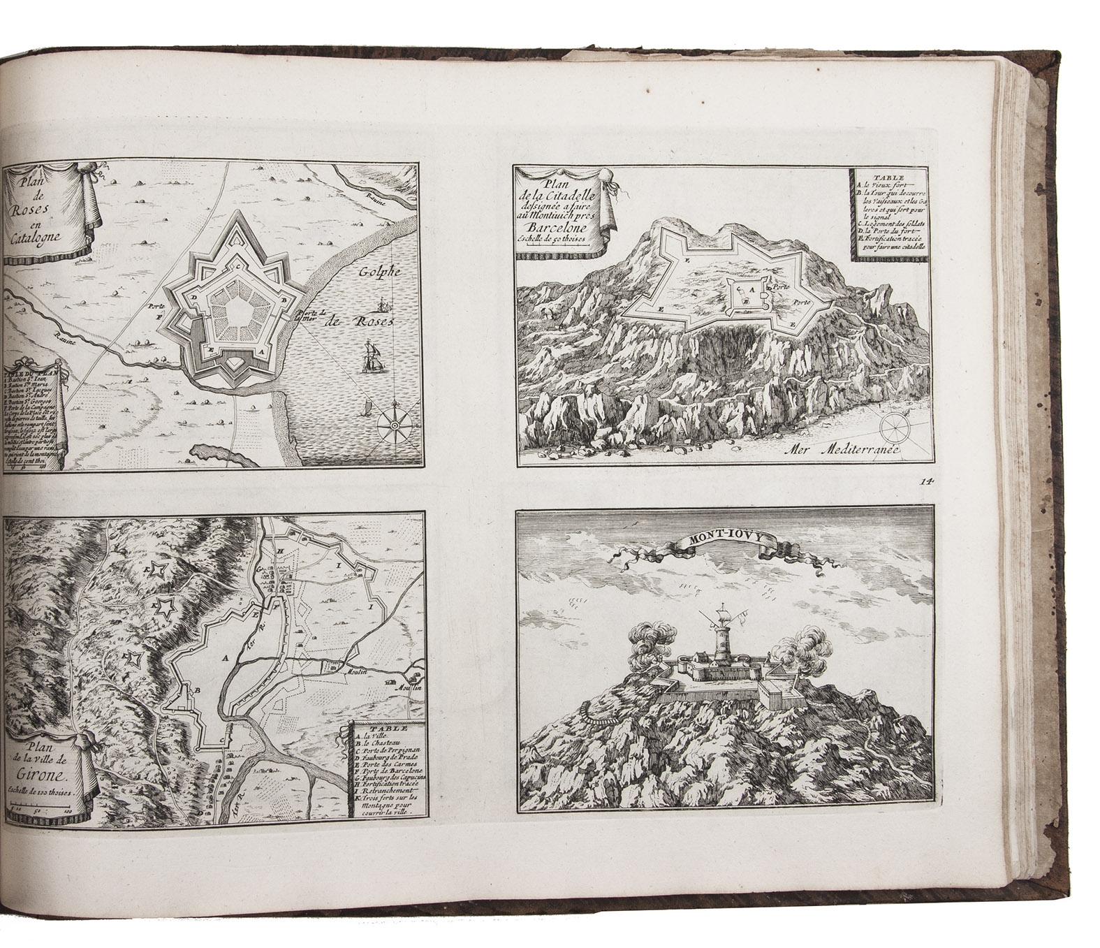Paris, "Nicolas de Fer" [a false imprint], 1695. [printed in Amsterdam, for Pieter Mortier]. 2 works in 12 parts or volumes, bound as 1. Oblong 1mo (30 x 37 cm). Ad 1 with 10 letterpress title pages in red and black for the 10 parts; 5 engraved titles for parts 1-5 (that for part 5 repeating that for part 2); plus 234 beautifully engraved plates (a few folding) with 366 maps and views of fortified cities. Ad 2 with an engraved title page, 2 letterpress title pages in red and black and 40 engraved plates (including 2 folding), labelled A-S in part 1 and T-Oo in part 2. Contemporary tanned sheepskin, sewn on 5 cords, gold-tooled spine with the title in the 2nd of 6 compartments.