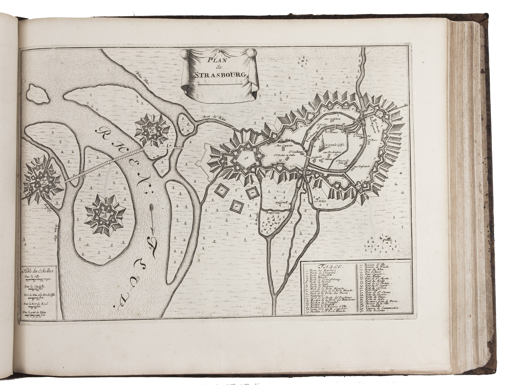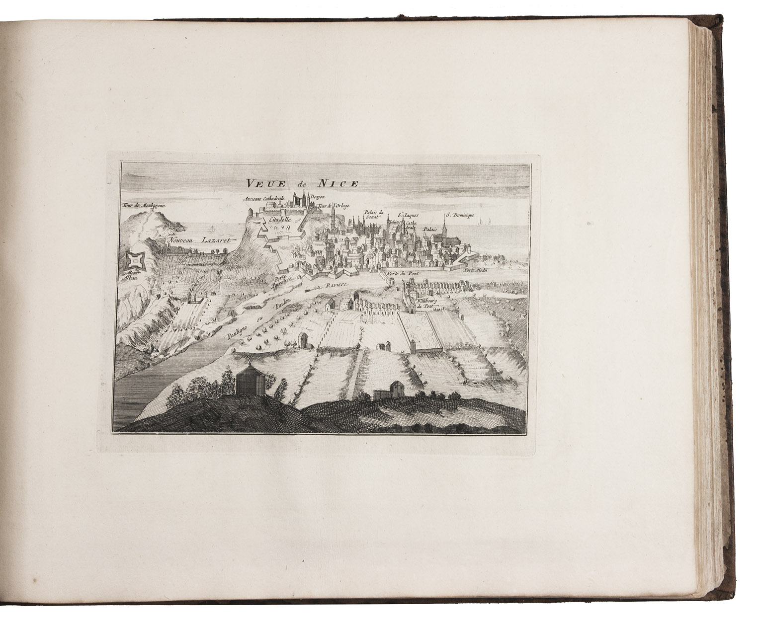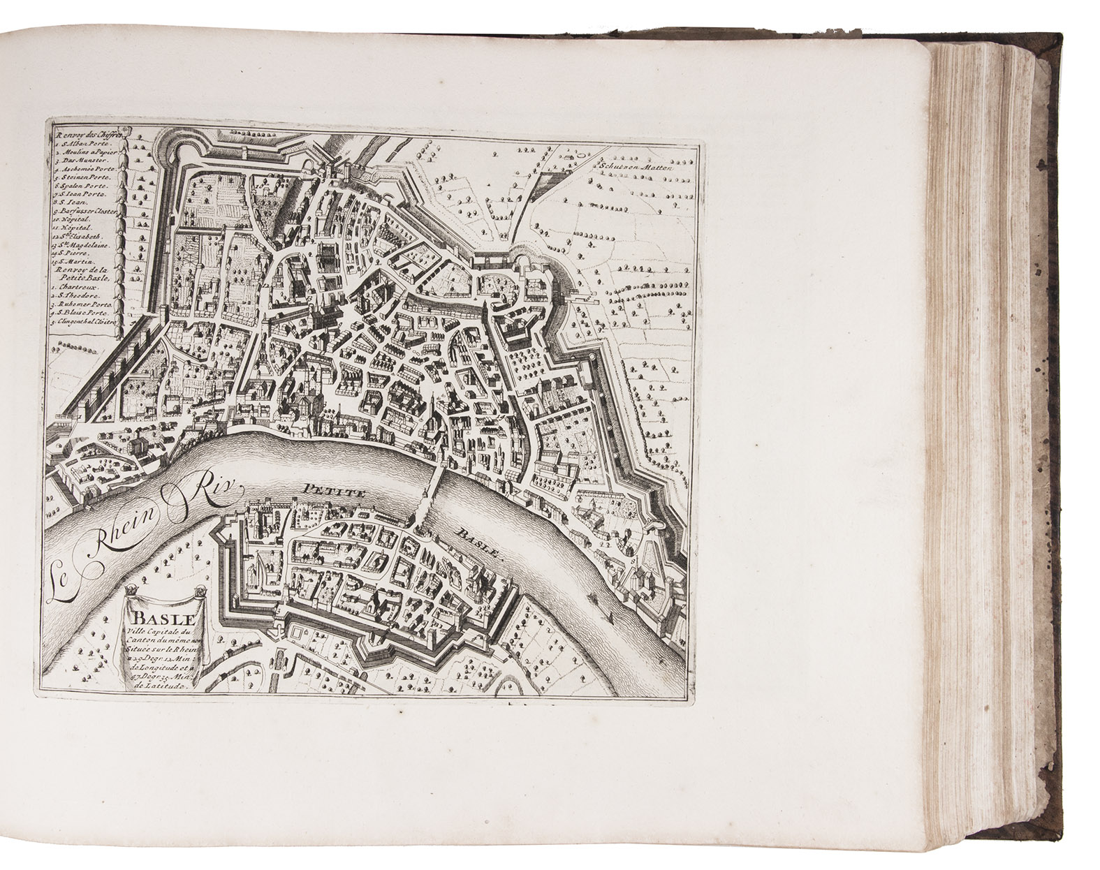 Paris, "Nicolas de Fer" [a false imprint], 1695. [printed in Amsterdam, for Pieter Mortier]. 2 works in 12 parts or volumes, bound as 1. Oblong 1mo (30 x 37 cm). Ad 1 with 10 letterpress title pages in red and black for the 10 parts; 5 engraved titles for parts 1-5 (that for part 5 repeating that for part 2); plus 234 beautifully engraved plates (a few folding) with 366 maps and views of fortified cities. Ad 2 with an engraved title page, 2 letterpress title pages in red and black and 40 engraved plates (including 2 folding), labelled A-S in part 1 and T-Oo in part 2. Contemporary tanned sheepskin, sewn on 5 cords, gold-tooled spine with the title in the 2nd of 6 compartments.