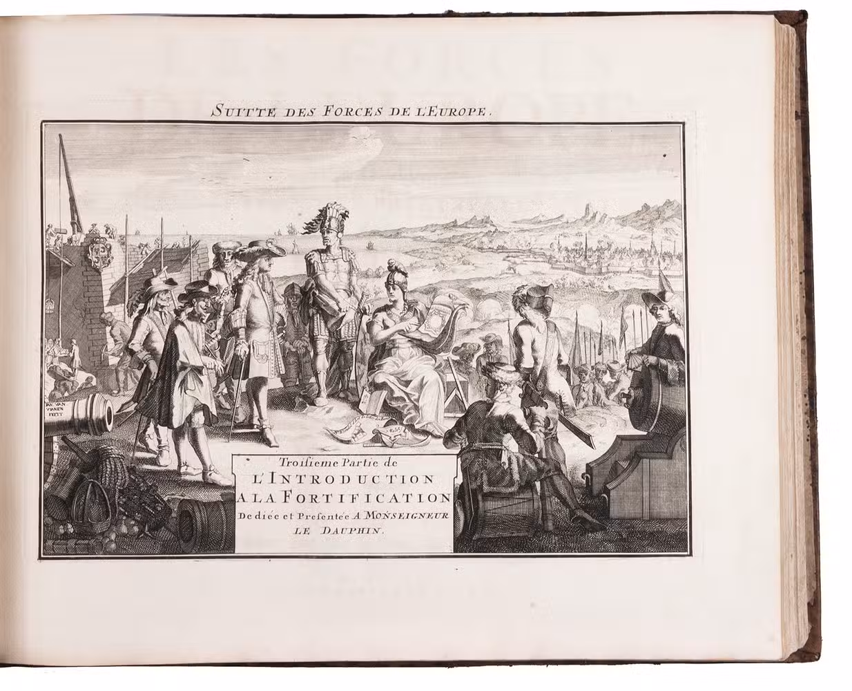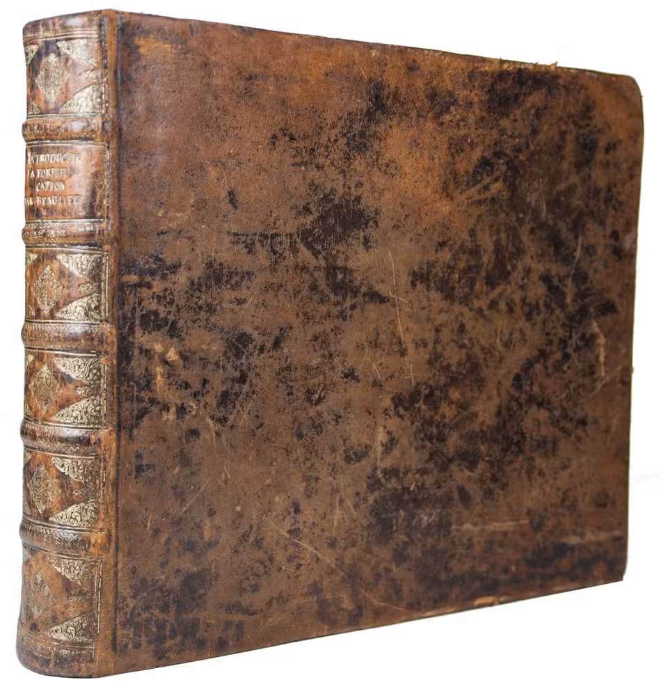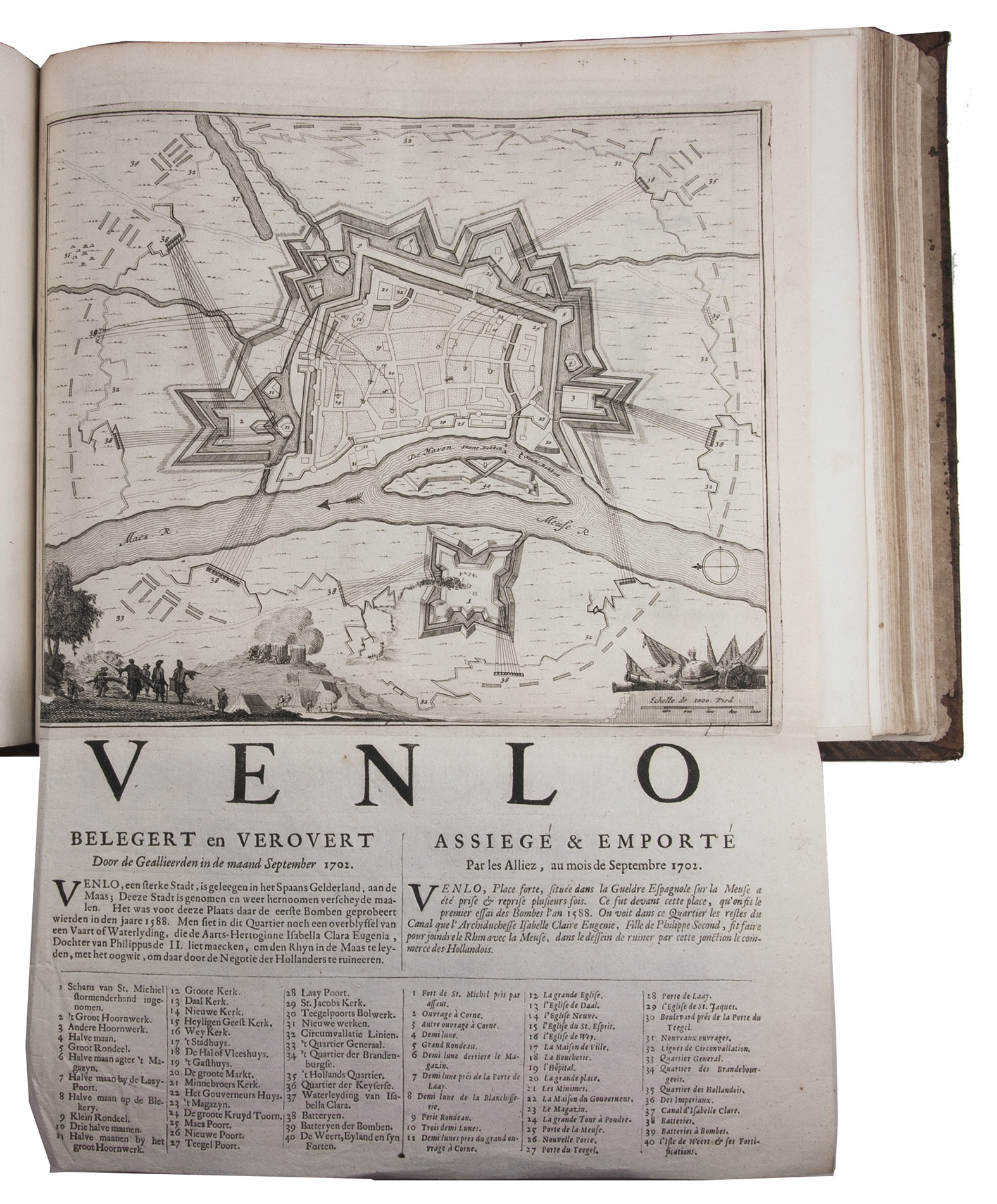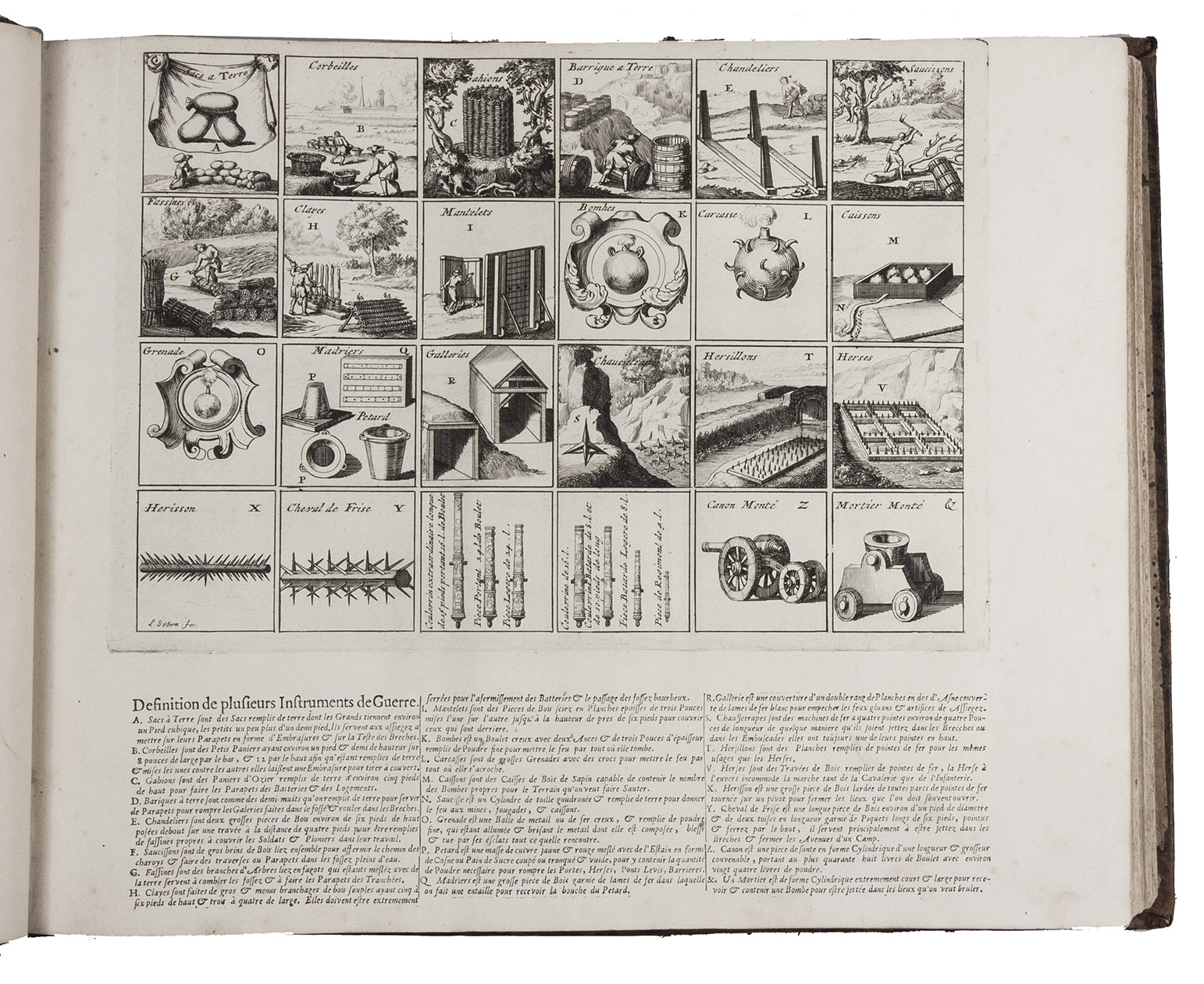 Paris, "Nicolas de Fer" [a false imprint], 1695. [printed in Amsterdam, for Pieter Mortier]. 2 works in 12 parts or volumes, bound as 1. Oblong 1mo (30 x 37 cm). Ad 1 with 10 letterpress title pages in red and black for the 10 parts; 5 engraved titles for parts 1-5 (that for part 5 repeating that for part 2); plus 234 beautifully engraved plates (a few folding) with 366 maps and views of fortified cities. Ad 2 with an engraved title page, 2 letterpress title pages in red and black and 40 engraved plates (including 2 folding), labelled A-S in part 1 and T-Oo in part 2. Contemporary tanned sheepskin, sewn on 5 cords, gold-tooled spine with the title in the 2nd of 6 compartments.