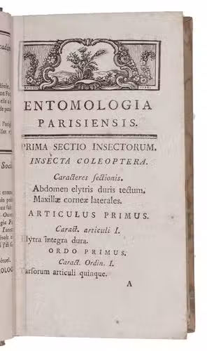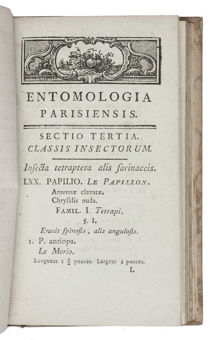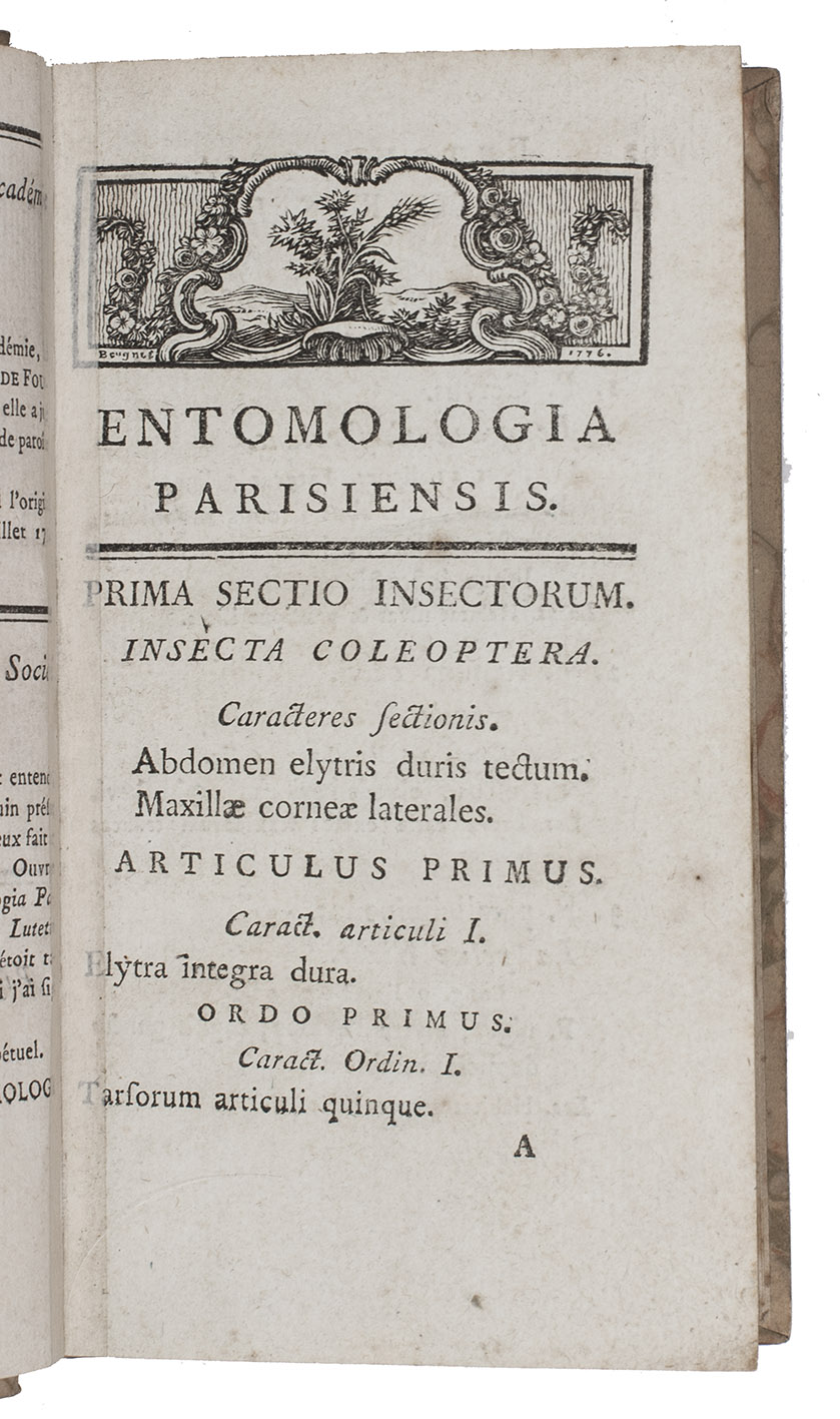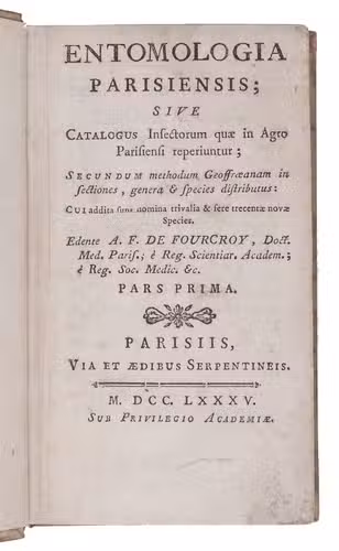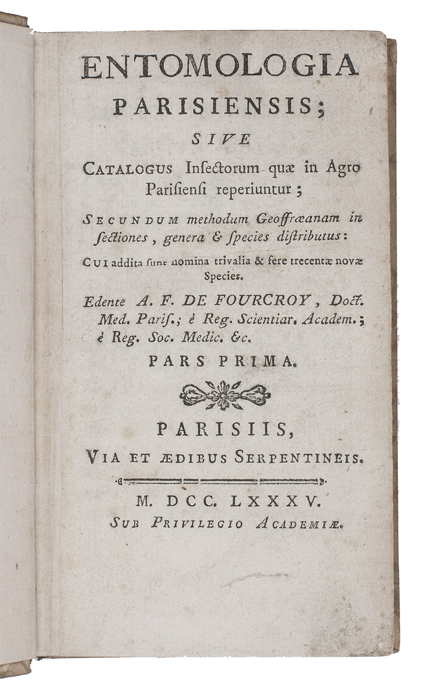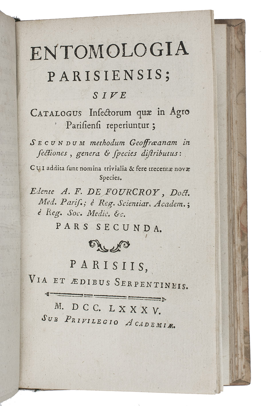 First edition of an extensive list of insects found in Paris and its surroundings, compiled by the French chemist Antoine François de Fourcroy (1755-1809) and the French entomologist and pharmacist Étienne Louis Geoffroy (1725-1810). The insects are arranged according to their taxonomy, with very brief remarks on their appearance and habitat and their French names.