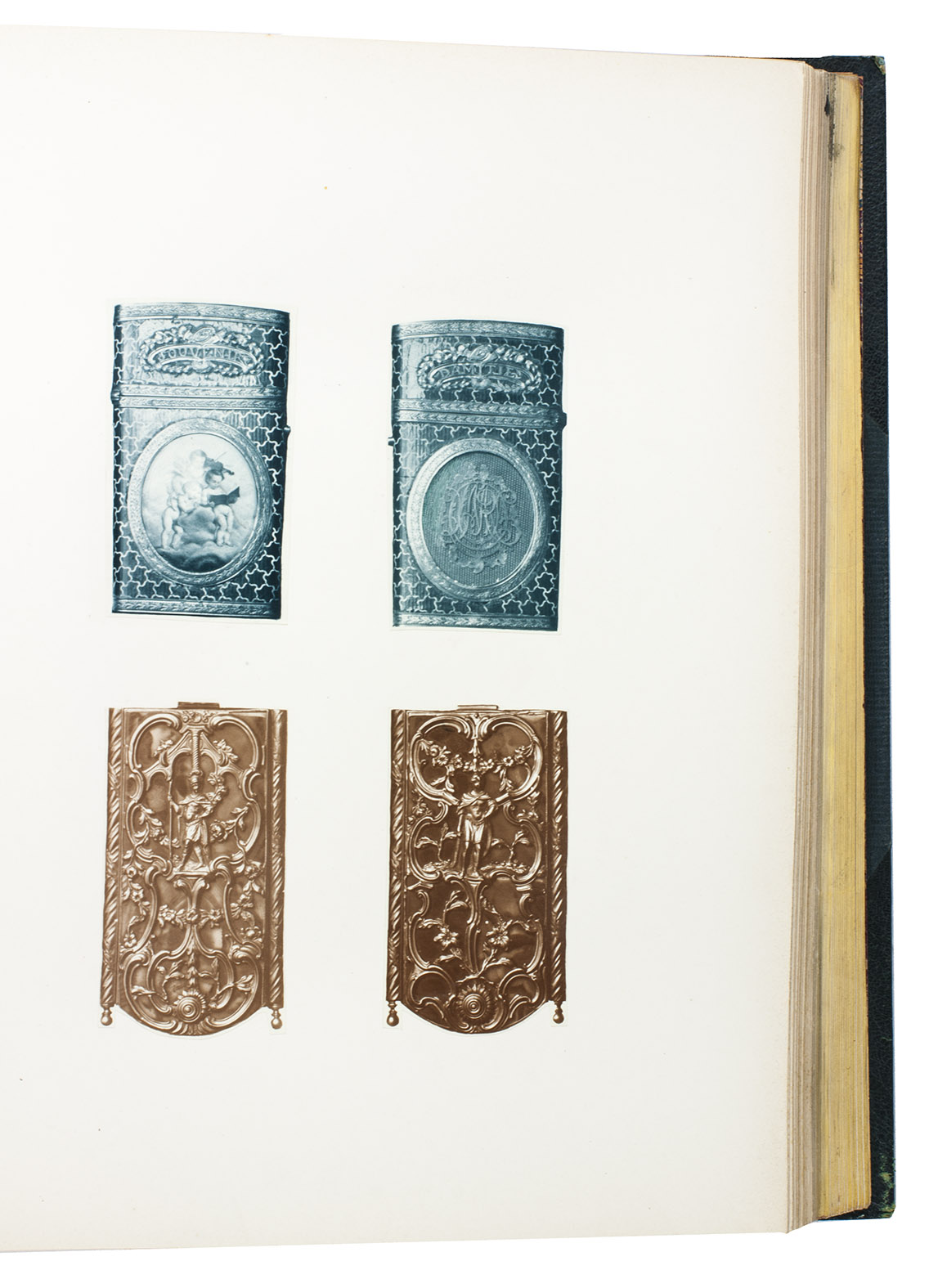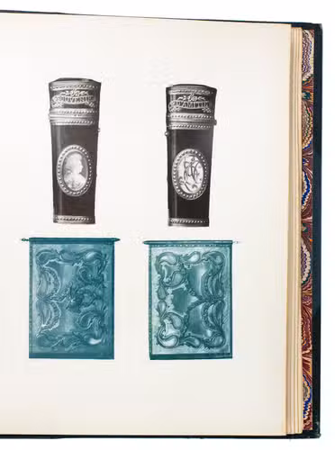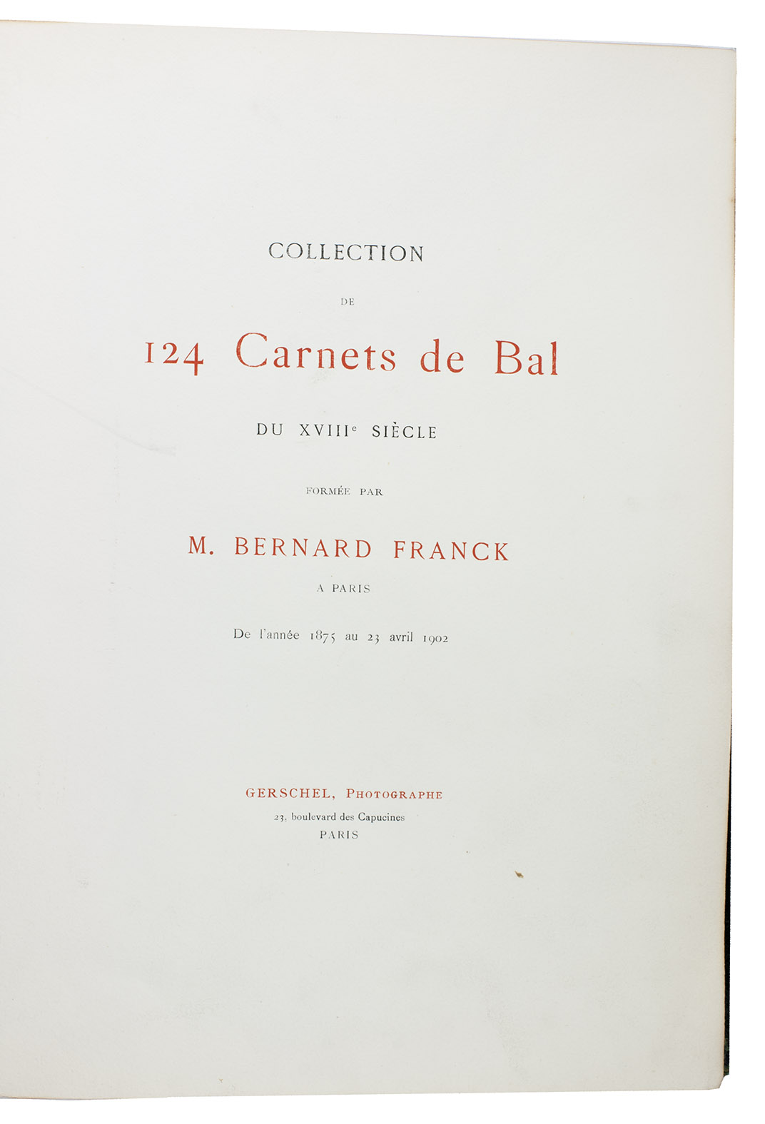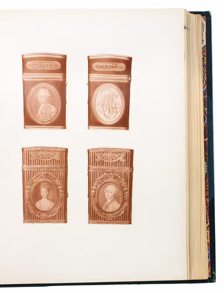 Rare catalogue of the collection of dance card cases of Bernard Franck (1848-1924), a well-known collector of memorabilia from the Napoleonic era. It shortly describes and displays both sides of 124 ornate eighteenth century jewelled cases to house dance cards issued for royal and aristocratic balls. The catalogue was only produced in 20 copies, and the collection of cases was sold to J.P. Morgan around 1910, who donated it to the Metropolitan Museum of Art in 1917.