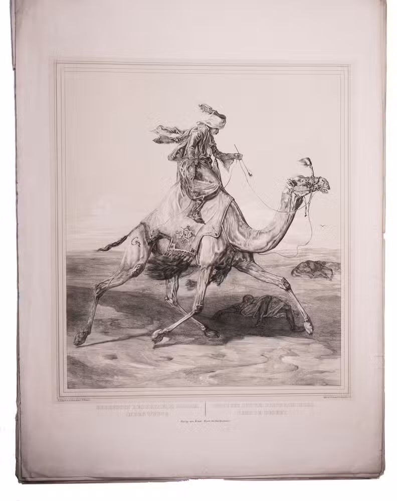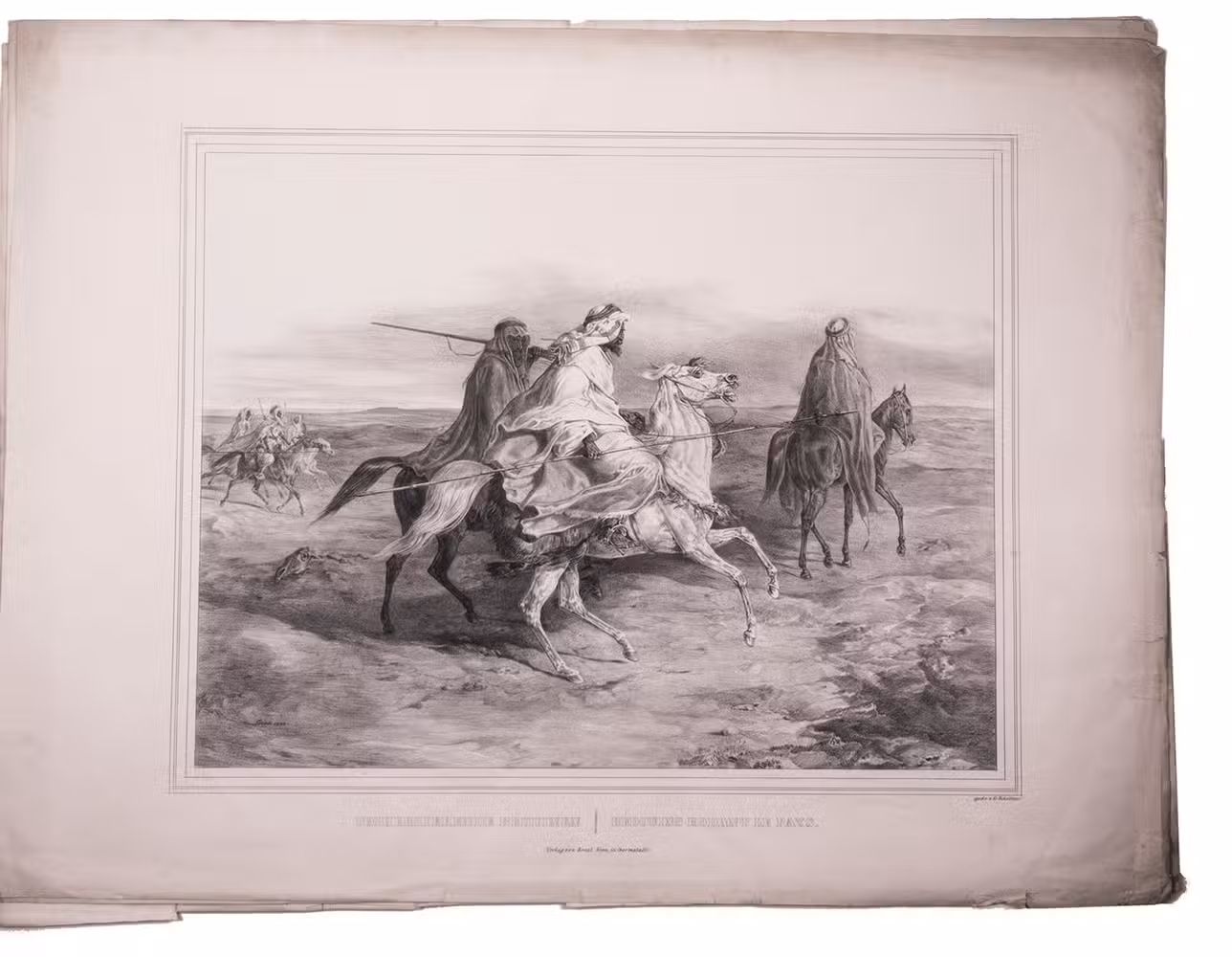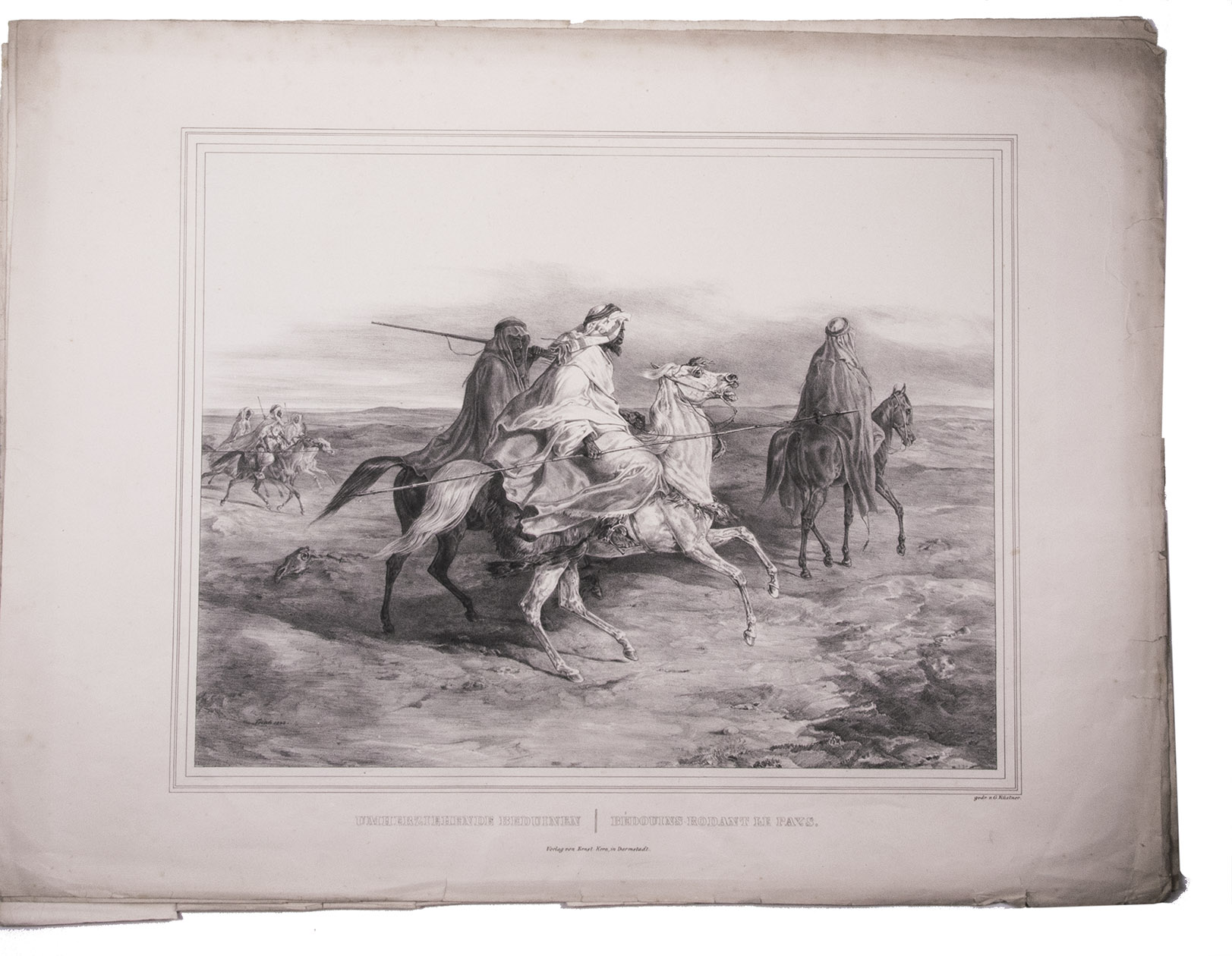 Extremely rare set of 6 beautifully lithographed plates showing scenes made on a journey to the Middle East to procure Arabian horses for the Royal Wuerttemberg stud farms Weil and Marbach, by Friedrich Frisch (1813-1886), court painter in Darmstadt. In 1840/41 he accompanied the Wuerttemberg chamberlain Wilhelm von Taubenheim (1805-1894), the writer Friedrich Wilhelm Hackländer (1816-1877) and the doctor Karl Bopp (1817-1847) on this journey, stopping first at Constantinople, where Sultan Abdülmecid I welcomed them. They continued to Beirut, Damascus and Jerusalem, and in Jaffa they met the Ottoman general Ibrahim Pasha.
