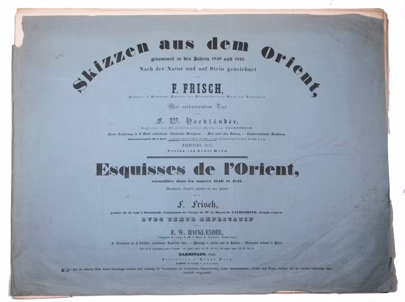 Darmstadt, Ernst Kern; Paris, H. Gache, 1843. Oblong 1mo (48 x 63.5 cm). With 6 tinted lithographed plates by Frisch, with captions in German and French below. The first three in the deluxe issue printed by B. Dondorf, Frankfurt am Main, the last three in the regular issue printed by G. Küstner. Original publisher's letterpress printed wrappers, with a list of subscribers and advertisements on the back of the front wrapper.