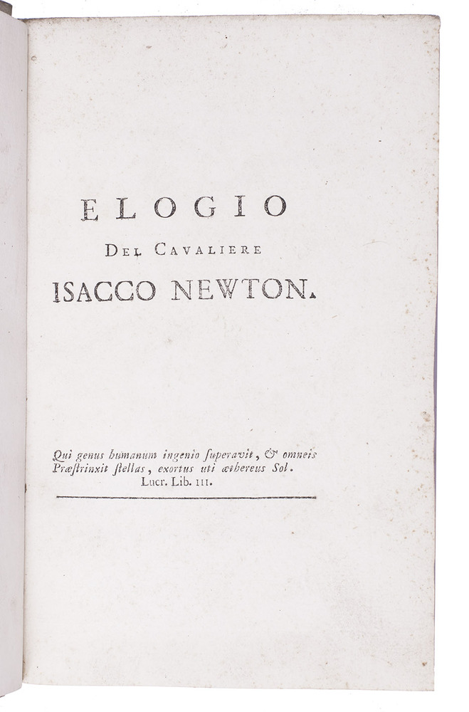 Four eulogies, written in Italian by the astronomer and mathematician Paolo Frisi (1728-1784), paying respects to Isaac Newton (1643-1727), Jean le Rond d'Alembert (1717-1783), Galileo Galilei (1564-1642) and Bonaventura Cavalieri (1598-1647). The latter two, written more than 100 year after their death, are published together in one work.