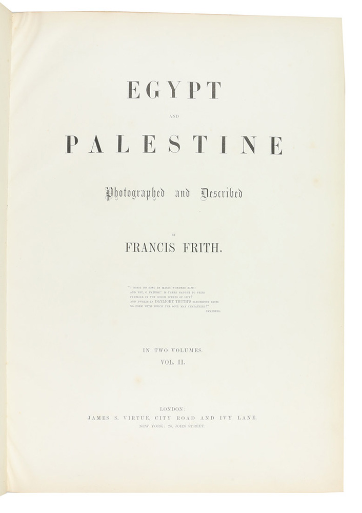 First edition of an important early photobook on the Near East by one of the greatest pioneers of early photography. From 1856 to 1859, Frith (1822-1898) made three visits to Egypt and the Holy Land. He published this selection of his photographs, from wet-collodion 9 x 7 inch glass negatives taken with an 8-by-10 inch camera, in 25 fascicles of 3 prints each, a work hailed as "one of the most renowned nineteenth-century photobooks" (The Photobook). Most are dated 1857 either in the plate or the printed caption. They include a portrait of the artist in oriental costume and views of Abu Simbel, Aswan, Baalbek, Bethlehem, Damascus, Giza, Hebron, Jerusalem, Karnak, Luxor, Nazareth, Philae, Tiberias, Wadi Kardassy etc. The preliminaries of vol. 1 include title, introduction, table of contents and subscribers, those of vol. 2 include title and contents. Each plate is accompanied by a full-page letterpress description. "Francis Frith is undoubtedly one of the best-known photographers to work in the Near East. His trips to the Levant were a brilliant commercial success as well as an artistic one" (Perez 163).