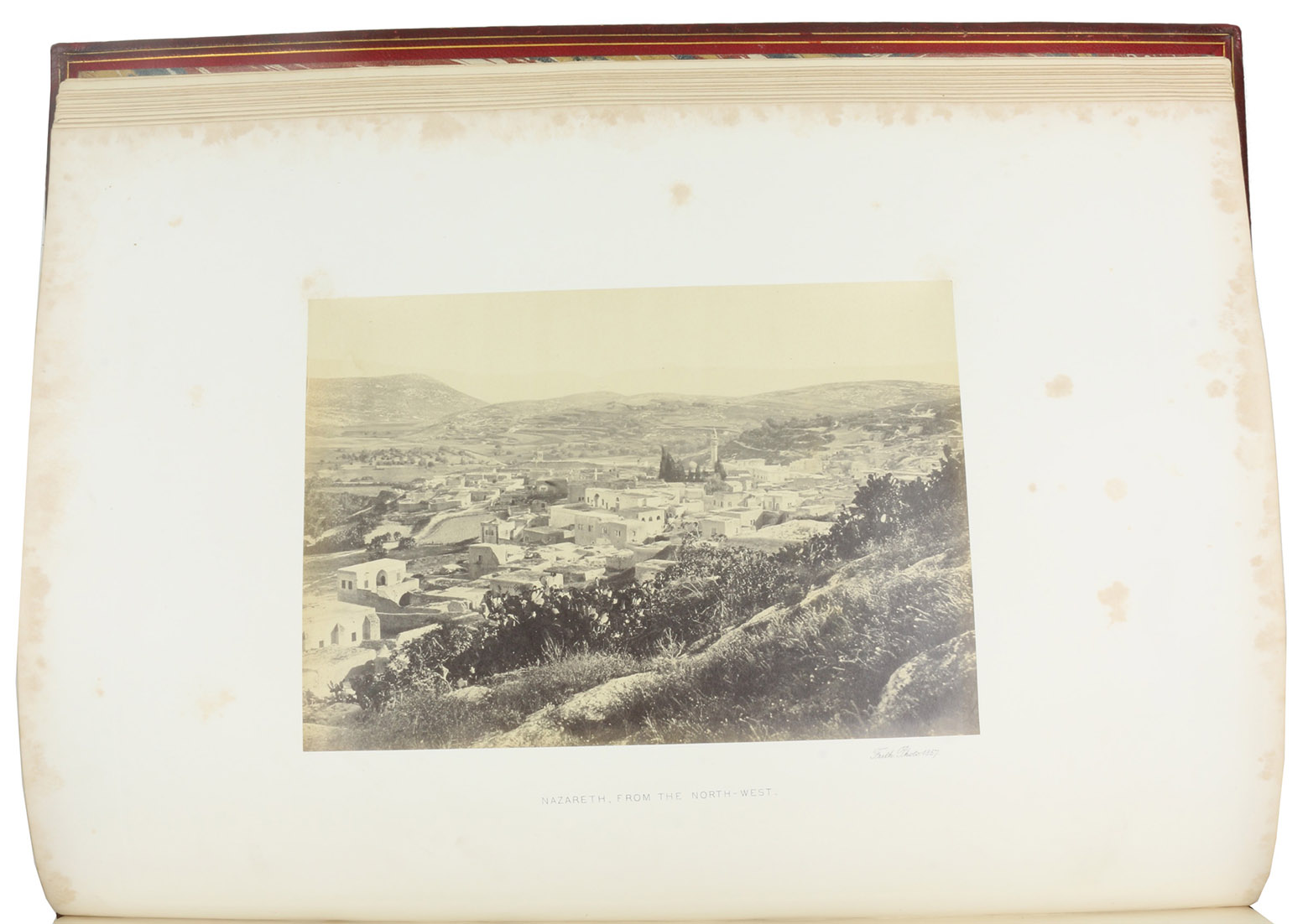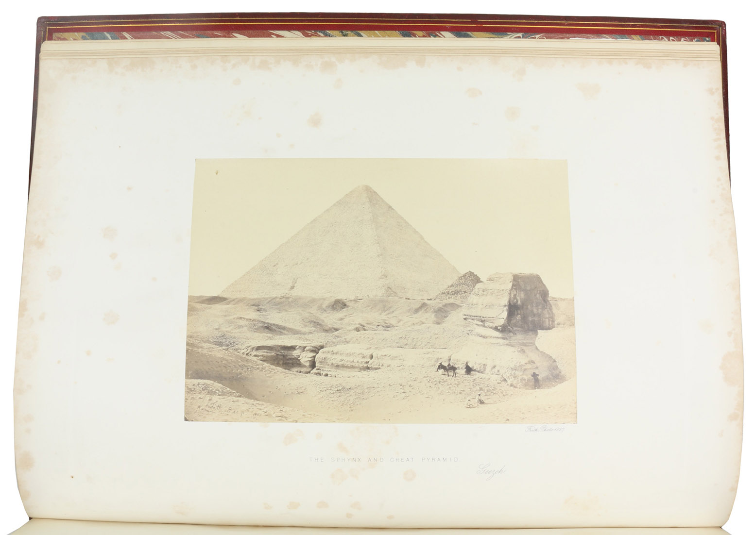 London, James S. Virtue, [1858-1859]. 2 volumes. Folio (44.5 x 32.5 cm). With 76 photographs on plates by Francis Frith (ca. 14.5-16.5 x 21.5-23 cm), each with a separate leaf of text. Contemporary red morocco, gold-tooled spines and boards, marbled endpapers, gilt edges.