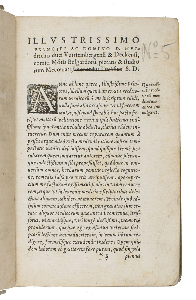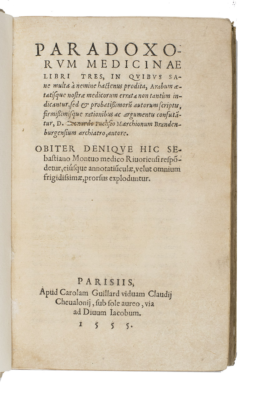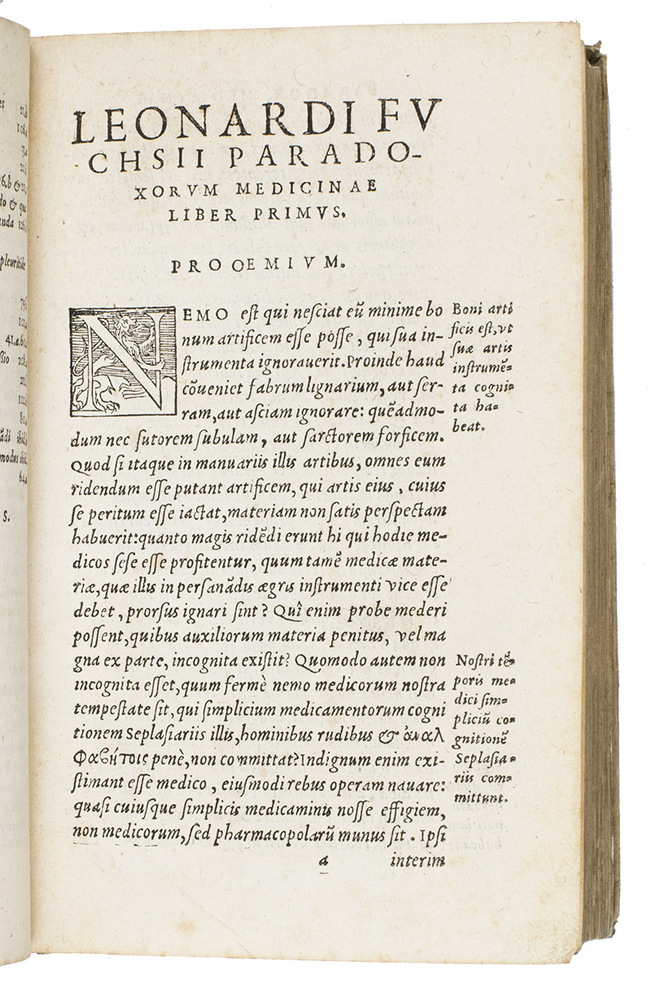 Fourth (second Paris) edition of Fuchss Latin Paradoxorum medicinae (first published at Basel, Johann Bebel, 1535), which in turn was an emended and greatly expanded version of his Errata recentiorum medicorum (Hagenau, Johann Setzer, 1530). Like all the best Renaissance medical authorities, Fuchs mixed influences from Islamic and classical sources, but here in his first publication he argues against Islamic medicine and favours a return to greater emphasis on the classics. He argued for the use of herbes medicinales (simples) rather than the noxious compounds of arcane ingredients concocted in medieval medicine. As Fuchss preface makes plain, he was primarily concerned with the medicinal uses of plants and urged physicians to extend their knowledge of simples, arguing that they could not hope to treat diseases until they fully understood the role of simples in medication. Although he fought against the Islamic/Arabic hegemony in medicine and to return to the Greek authors, he nevertheless recognised the importance of practical experience as well and offered botanical field days for the students, where he demonstrated the use medicinal plants in situ.