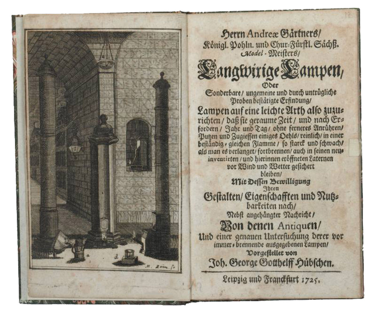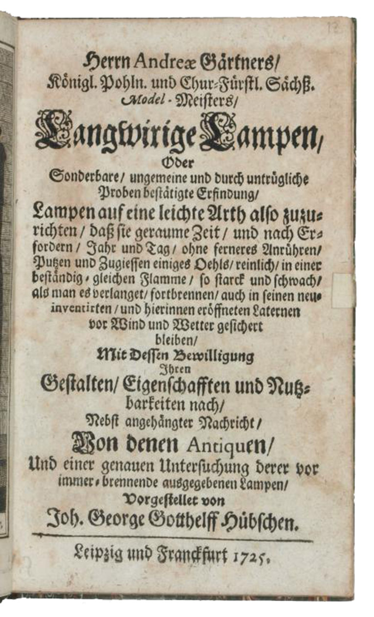 Rare first edition in book form (parts had been published in 1720 in the periodical Berlinische und Cölnische ordinaire Post-Zeitung) of descriptions of lamps capable of burning for prolonged periods without having to be refuelled, invented by the Saxon court mechanic Andreas Gärtner (1654-1727), a cabinet maker and mechanic who had learned his trade during twelve years travel throughout Germany and Italy (Venice, Bologna and Rome). By 1686 he was royal cabinet maker to the Dresden court, and later also royal mechanic. Delighting in complicated mechanical models and devices, he soon became known as the "Saxon Archimedes". Unfortunately, most of his works perished in a fire at the Wackerbarth Palace in 1728. Gärtner's famous world clock (ca. 1700), boasting 365 dials, survives and still draws crowds at the Zwinger (palace and grounds) in Dresden. The frontispiece shows some of his newly-invented lamps.