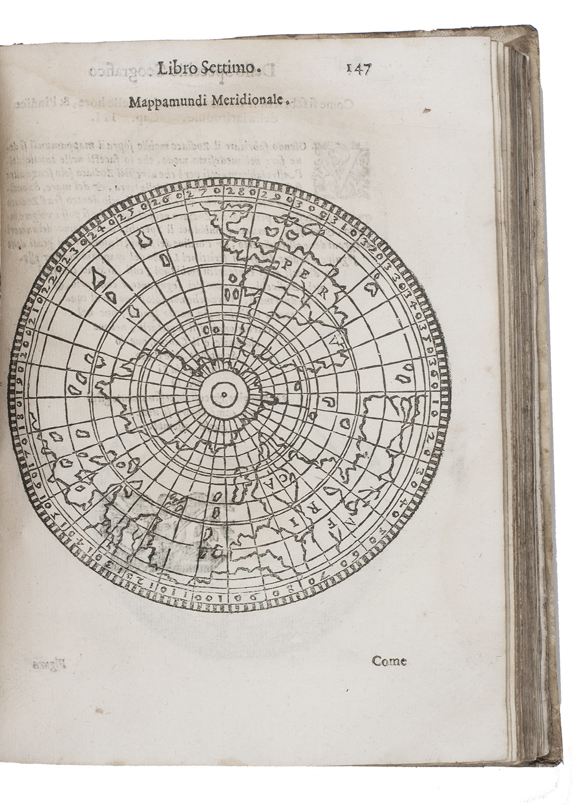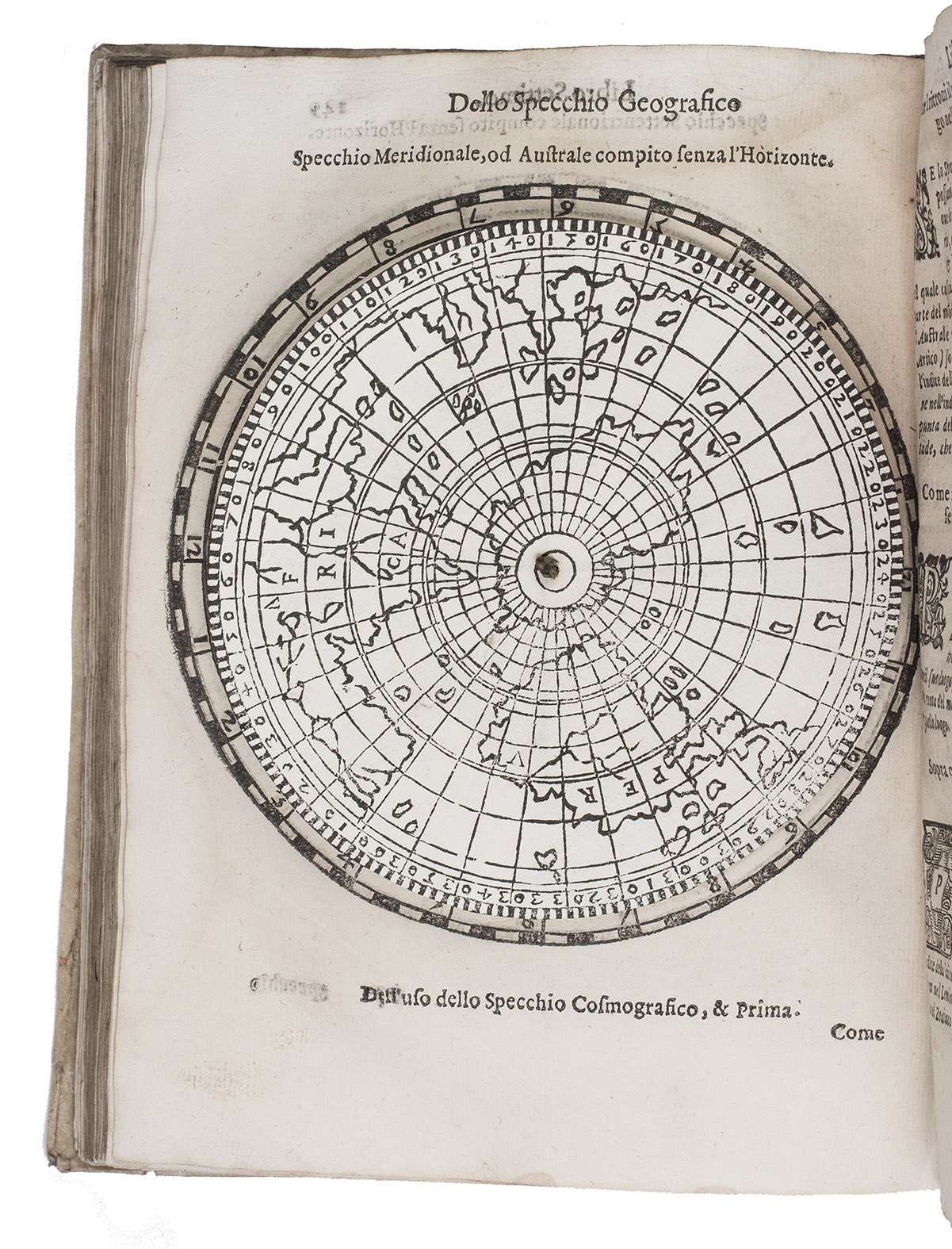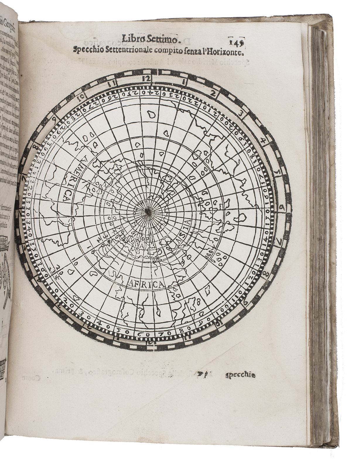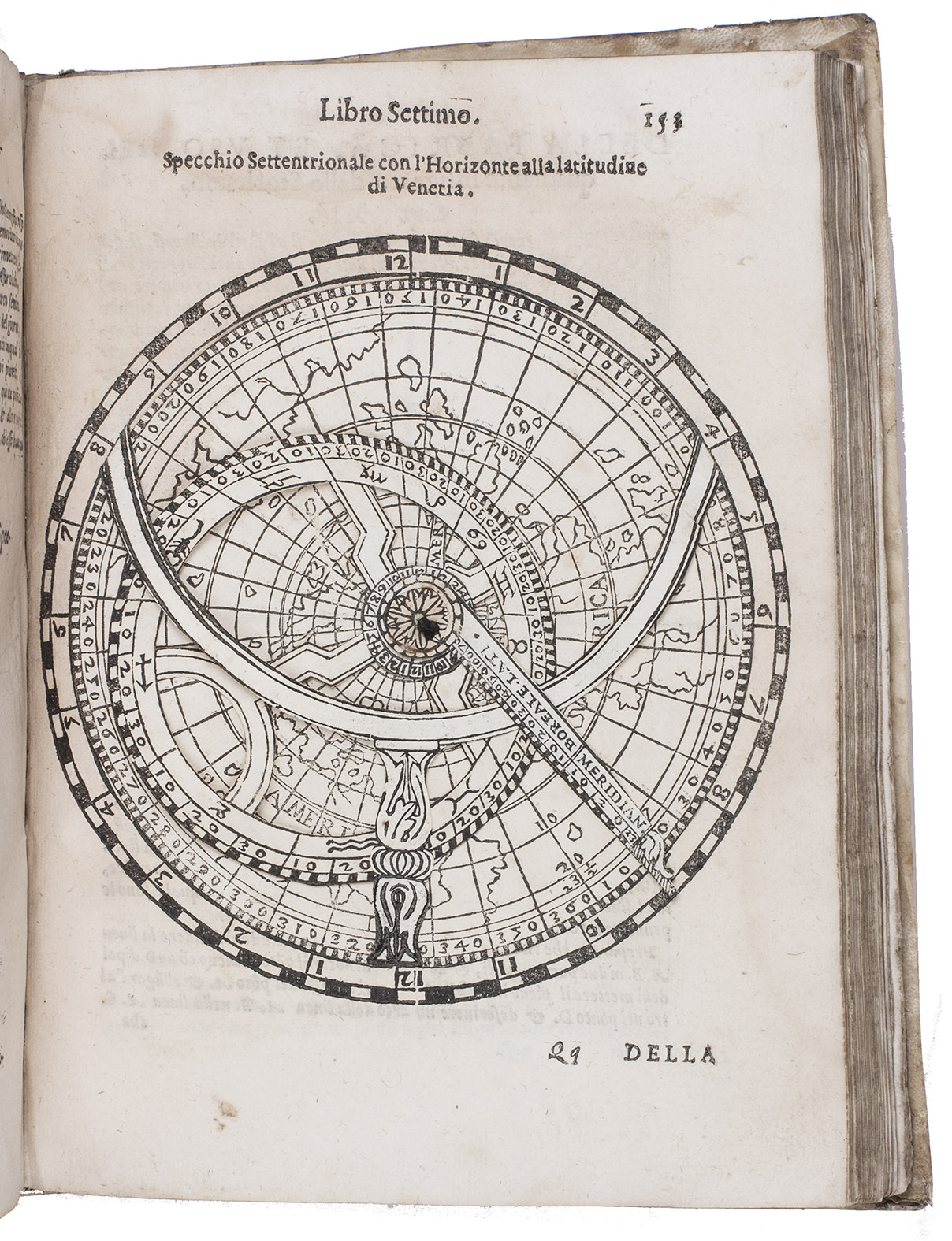 Venice, Roberto Meietti, 1598. 4to (22 x 16.5 cm). With engraved title-page, folding woodcut plate, 3 woodcut volvelles with moving parts, and numerous woodcut illustrations in text. Including a world map in two hemispheres (incl. America and a scattering of islands at the location of Australia) on two facing pages, they reappear with volvelle attachments on both sides of leaf 149 and leaf 153. Contemporary limp sheepskin parchment. [8], 228 ll.