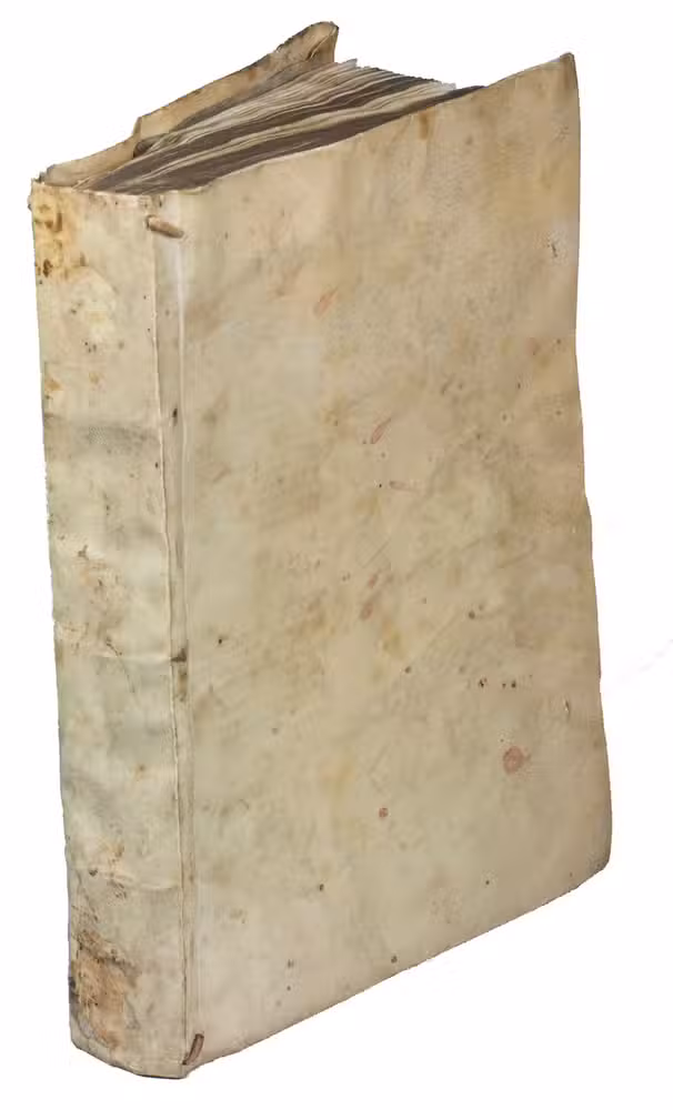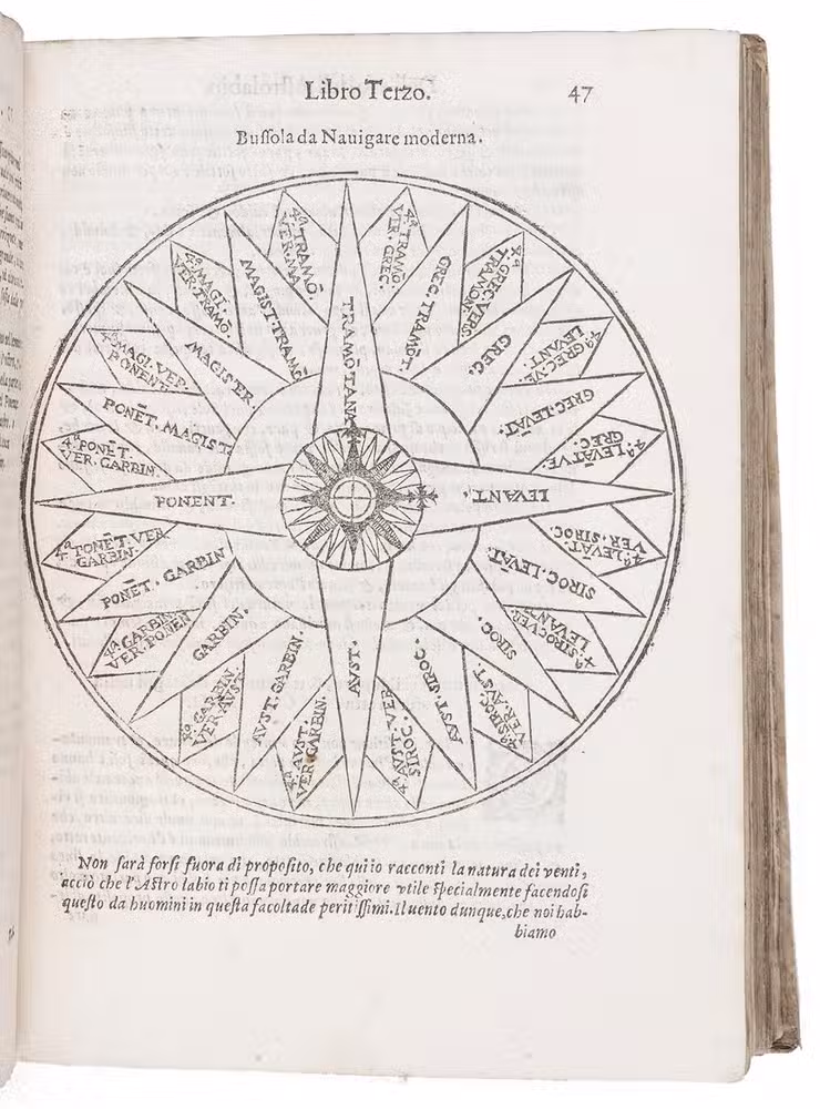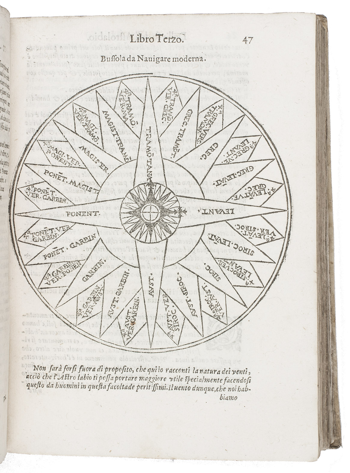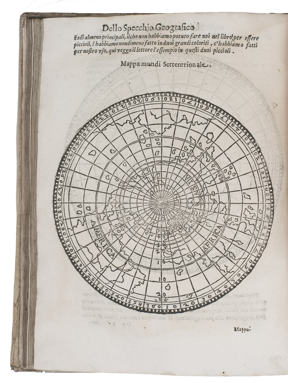 Venice, Roberto Meietti, 1598. 4to (22 x 16.5 cm). With engraved title-page, folding woodcut plate, 3 woodcut volvelles with moving parts, and numerous woodcut illustrations in text. Including a world map in two hemispheres (incl. America and a scattering of islands at the location of Australia) on two facing pages, they reappear with volvelle attachments on both sides of leaf 149 and leaf 153. Contemporary limp sheepskin parchment. [8], 228 ll.