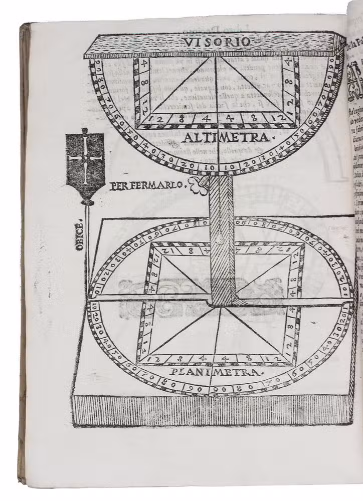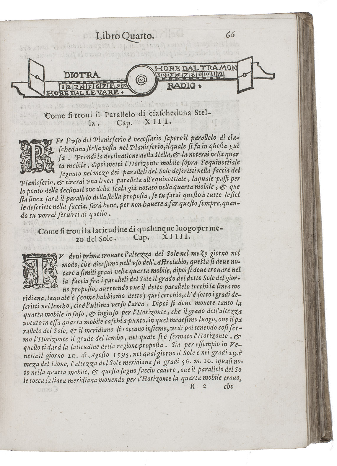 First edition of a well-illustrated encyclopaedia of astronomical and surveying instruments available from classical times to the time of publication, by the Italian astronomer Giovanni Paolo Gallucci (1538-ca. 1621), a well-known private tutor to the Venetian nobility and founding member of the Second Venetian Academy. It gives a comprehensive summary of the knowledge of astronomy, cosmography and mathematics at the time of Galileo. "It describes instruments designed by others (Finé, Apian, Gemma Frisius, etc.) and gives credit to the original inventors. The one exception to this is the Visorio, which Gallucci claims as his own, but an identical instrument by Waldseemüller can be found illustrated in the 1512 edition of Margarita Philosophica by Gregor Reisch. Other instruments, such as the Hemispherical Uranico (a complicated device used for computations dealing with the moon, sun and stars), appear to be of Gallucci's invention. Besides the usual portable instruments, he also includes a simple quadrant and a two-ringed armillary built into the church of Santa Maria Novella in Florence" (Erwin Tomash). For some of the instruments this is the only description available.