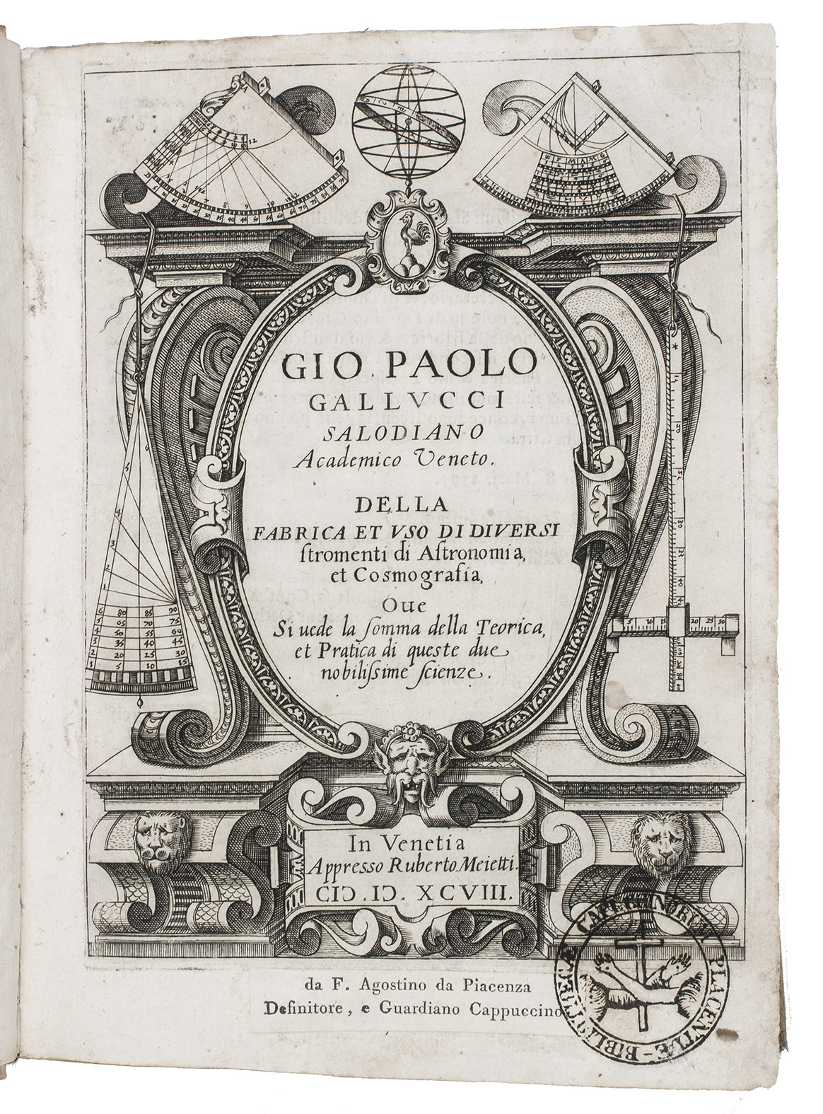 With the owner's label of the Capuchin friar and astronomer Agostino da Piacenza (1747-1839) and the related library stamp "Bibliotheca Capucinorum Placentiae" on the engraved title-page. A few marginal water stains and some occasional spots, otherwise in very good condition. Adams G167; Burden 96; Cantamessa 1688; Crone 98; Erwin Tomash 23; Shirley 199; for Gallucci: G. Ernst, "GALLUCCI, Giovanni Paolo" in: Treccani LI (1998).