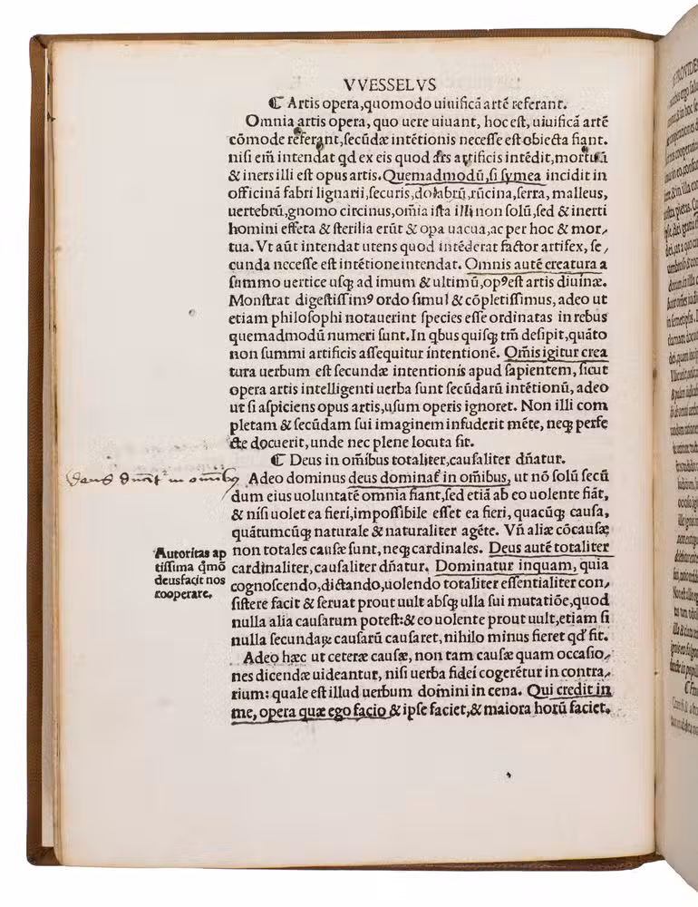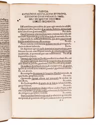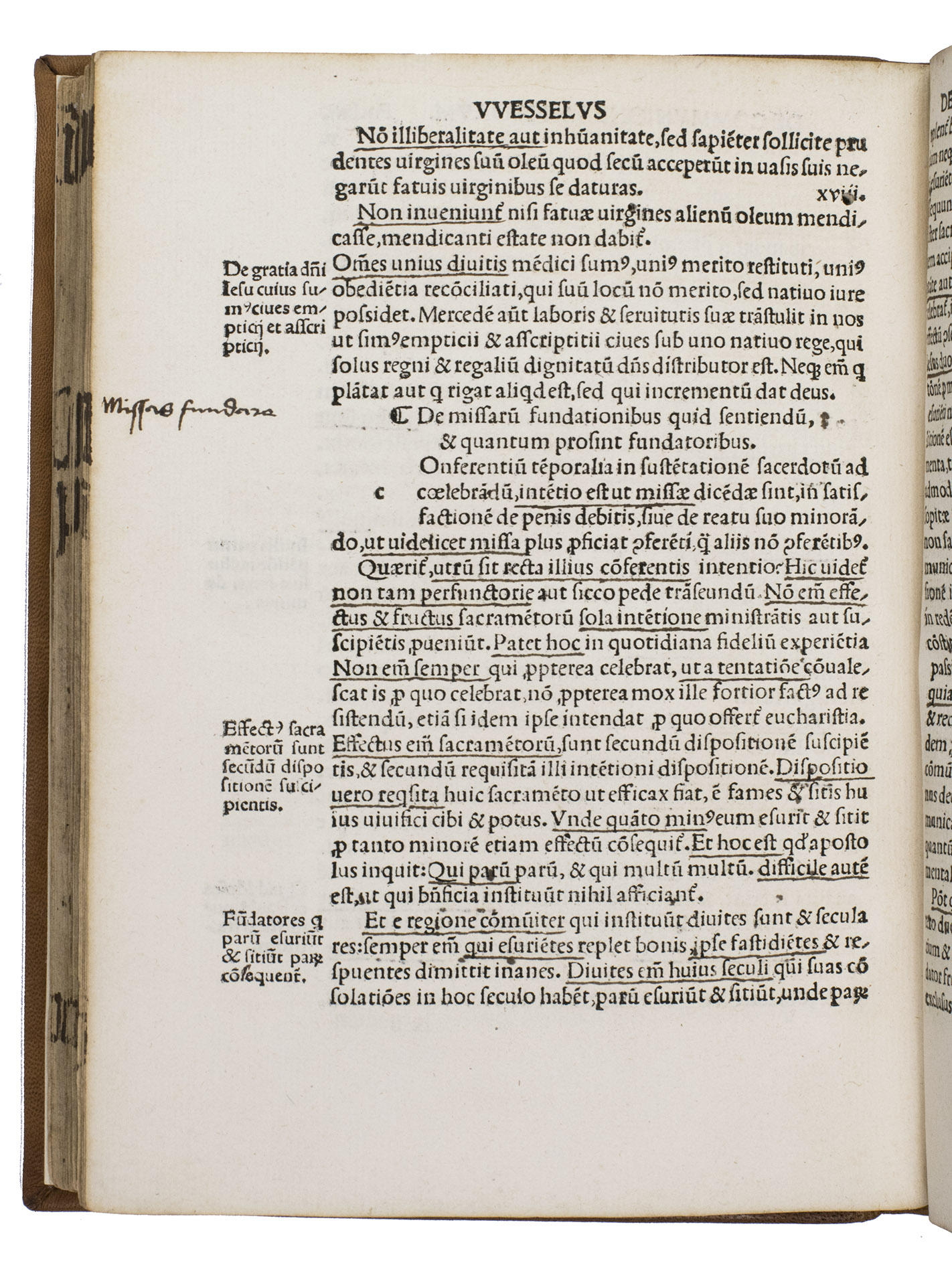 First German edition of the first collection of Wessel Gansfort's important and influential writings on theology, issued only a couple of months after the original edition (Zwolle, Simon Corver, beginning of 1522). The present edition bears no date on the title page or in the colophon, but the preliminary note by Andreas Palaeosphyra is dated [15]22, so the work is believed to have been published in that year. The volume was edited by Johann Arnold from Marktbergel in Mittelfranken, who was a corrector at the Lotter office, and who dedicated this edition to the well-known humanist and reformer Andreas Althamer. The beautiful woodcut border on the title page has been attributed to Lucas Cranach the Elder, and is not present in other editions.