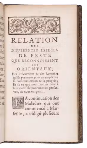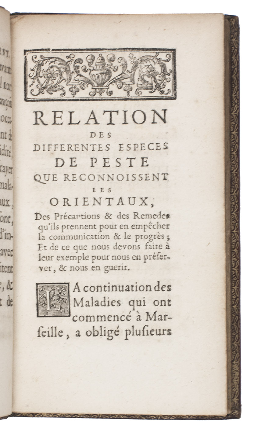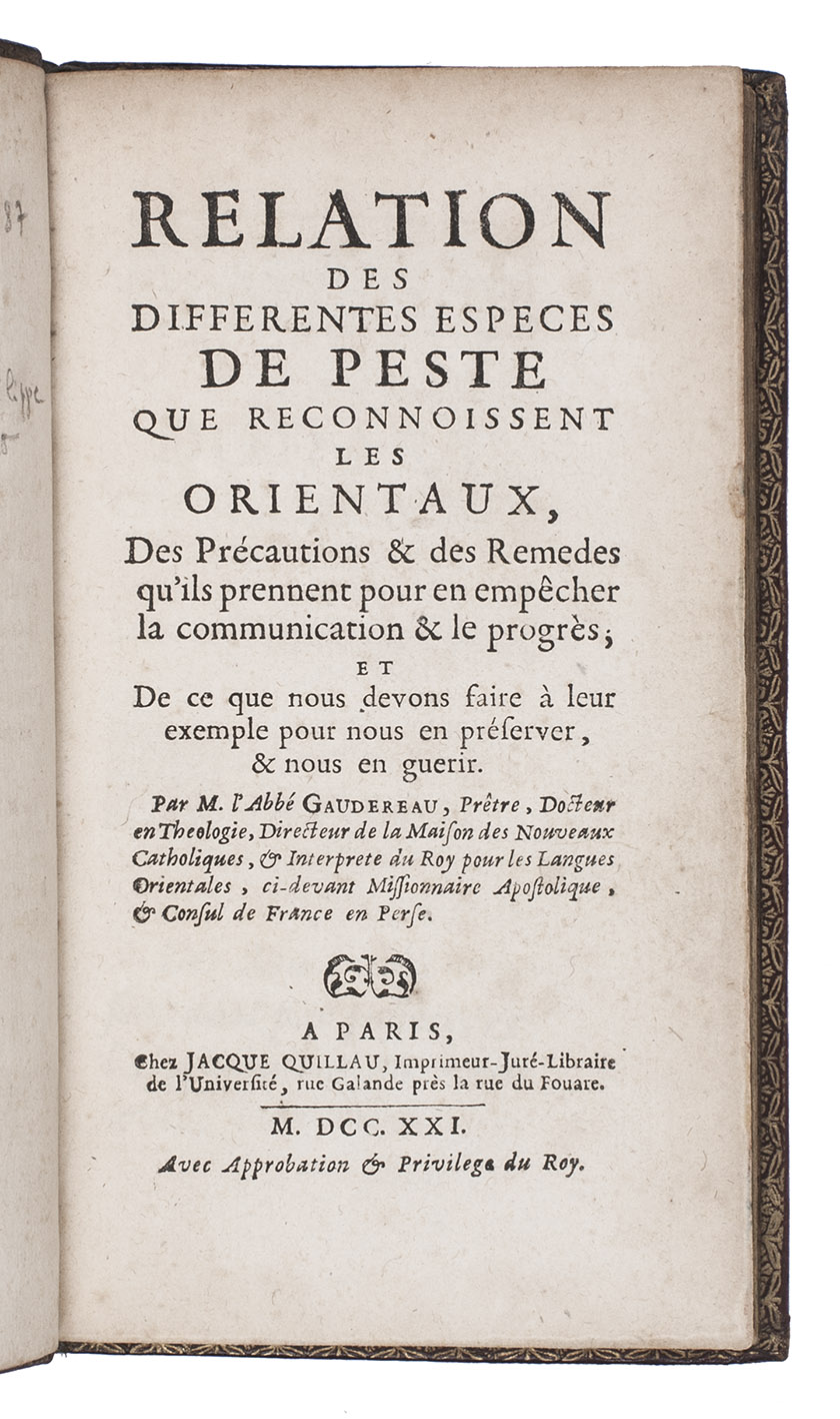 First edition of a work on the treatment of the plague in the Middle East, by the French priest Martin Gaudereau (1663-1743). In 1689 Gaudereau went to Persia (Iran) in the company of Bégnine Vachet (1641-1720), a director of the seminary of foreign missions, arriving at Isfahan in 1690. After negotiating a military and commercial alliance between Persia and the French East India Company, Gaudereau started his travels back to Europe in 1703. In 1704 however, on his way from Trabzon to Constantinople, he got terribly ill and nearly died of an infectious disease. He described this "plague" in the present work, with remarks on the nature and symptoms of the disease together with the treatment and the precautionary methods of the "orientals".
