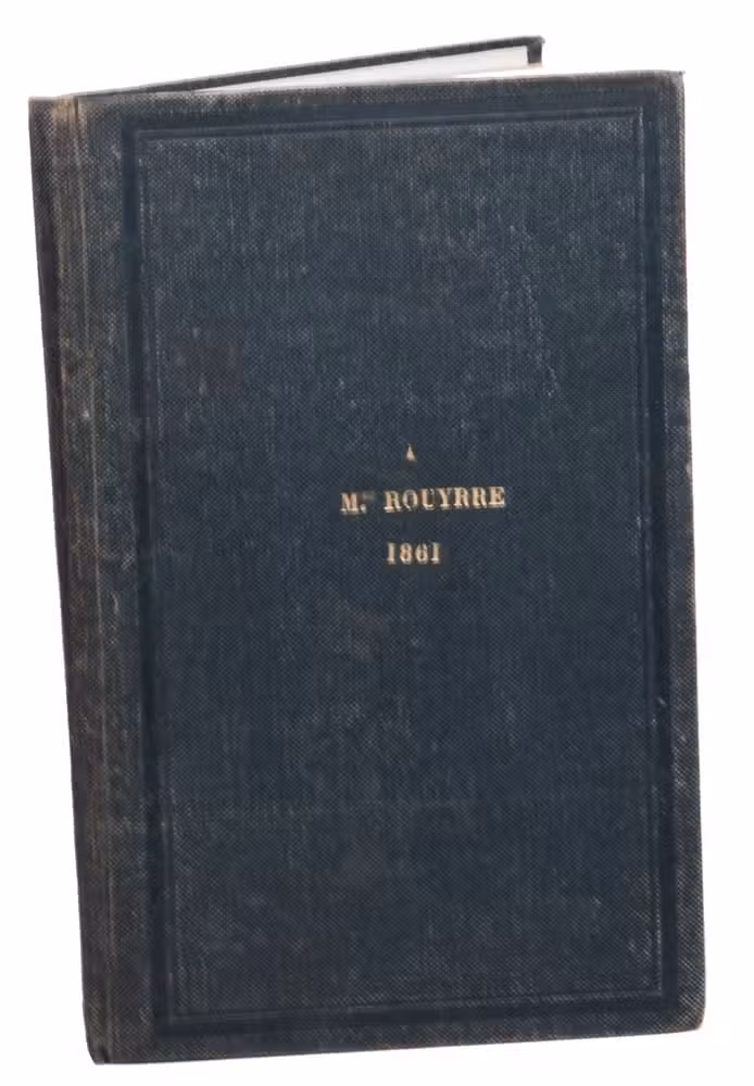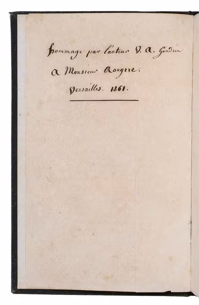 With a dedication to ''M. Rouyrre 1861'' on the front board and a manuscript note on the first endpaper: ''Hommage par l'auteur V.A. Gendrin à Monsieur Rouyrre. Versailles. 1881''. Some occasional spots and a tiny tear in the fore-edge margin of about 5 leaves; a good copy. Palau 101130 note; cf. Borba de Moraes, p. 348; not in Sabin.