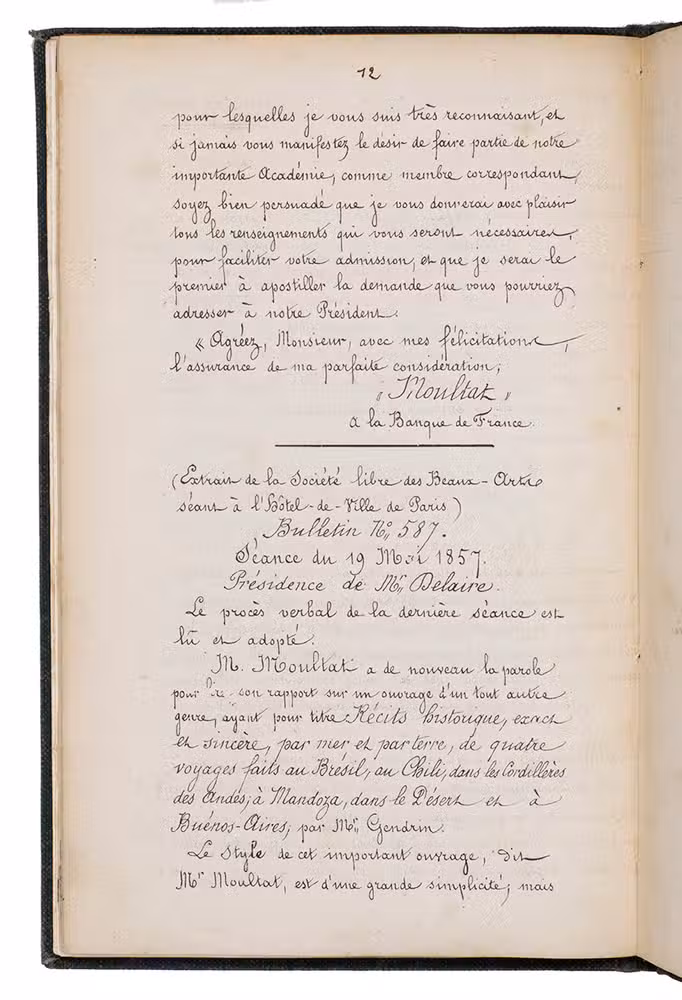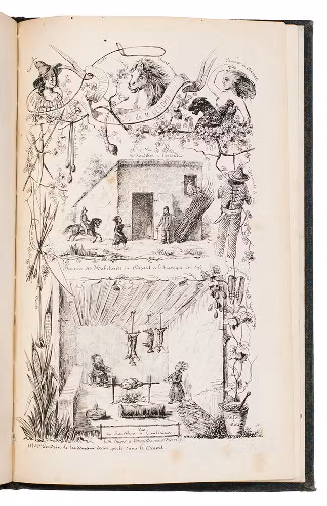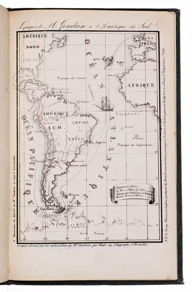 Presentation copy of a rare publication, presented as an extract from Gendrin's Récit historique, exact et sincère, par mer et par terre, de quatre voyages ... published in Versailles 1856. About half of the material is taken from the 1856 edition (the introduction, a poem by Dorlin Père, the author's portrait and 8 plates), but the other half is newly included here: 36 pages with lithographed reproductions of letters received after the 1856 publication.