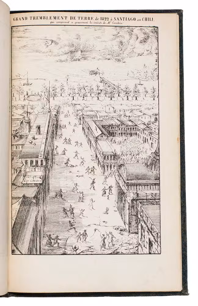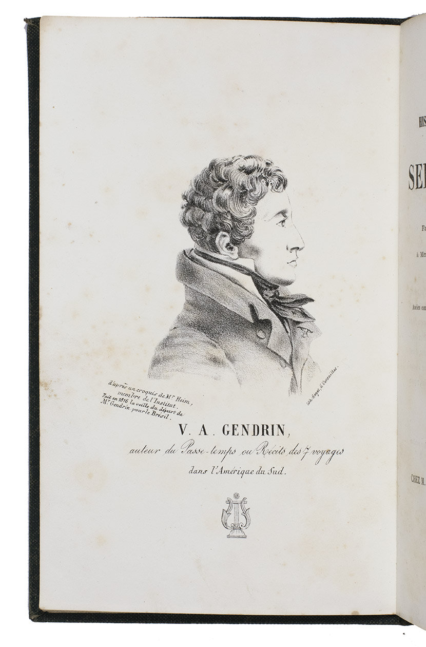 "Gendrin worked in the upholstery trade in Paris, and in 1816 travelled with his employer who was moving to Rio de Janeiro. After some time he was able to set up his own business, a shop in which he sold snuff, snuff-boxes, mirrors, .. [etc.] Business proved profitable, but having been informed by French colleagues who travelled to Chile of the good commercial opportunities offered by that country, he sold his shop, invested everything in suitable merchandise, and left for Valparaiso, sailing around Cape Horn. He also set up business in Santiago, ... He afterwards crossed the Andes to Buenos Aires and returned to France in 1823. Although he did not make a fortune, he succeeded in saving enough money to provide him with an income for the rest of his life. The Récit historique is an unpretentious narrative of his life in South America. Written with a charming spontaneity and candour, the book tells the life and business of a small shopkeeper in Rio de Janeiro, and a travelling salesman in Chile in Argentina. His remarks about the country and daily life of a shopkeeper during the opening years of the nineteenth century constitute a valuable document of the conditions of the French small commercial establishments in Brazil, which were of such importance in the social life of the capital city. It is to my knowledge the only book in existence about the lives in Brazil of the small French traders, the 'pacotilleurs''' (Borba de Moraes).