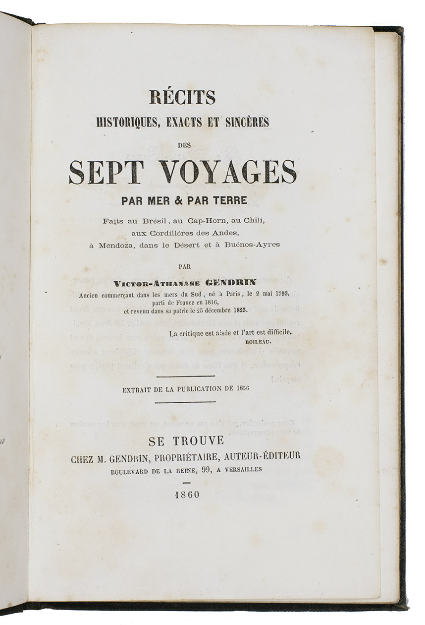 Récits historiques, exacts et sincères, des sept voyages par mer & par terre. Faits au Brésil, au Cap-Horn, au Chili, aux Cordillères des Andes, à Mendoza, dans le Désert et à Buénos-Ayres ... Extrait de la publication de 1856.