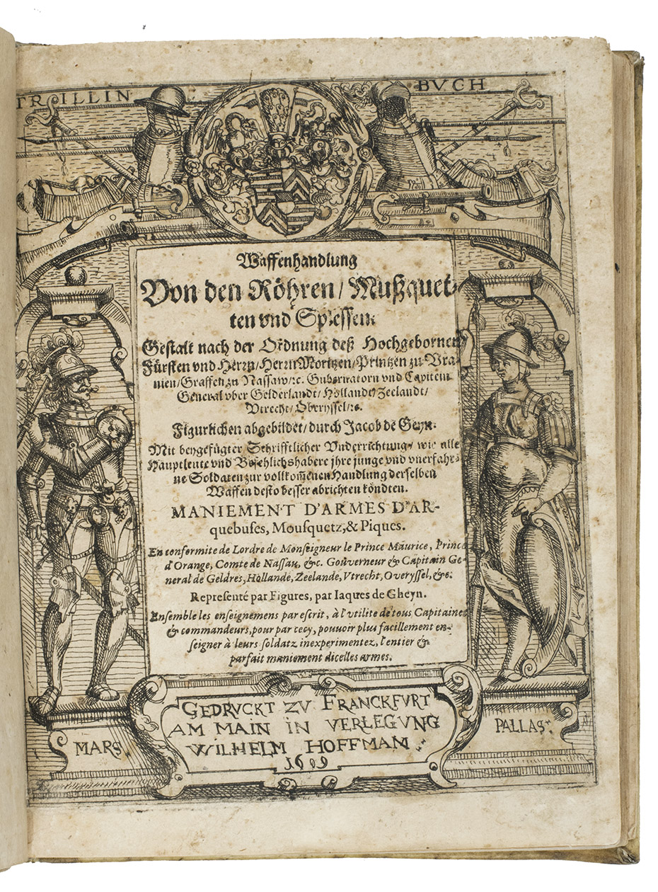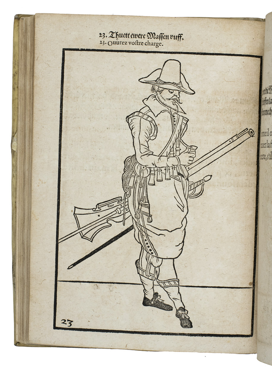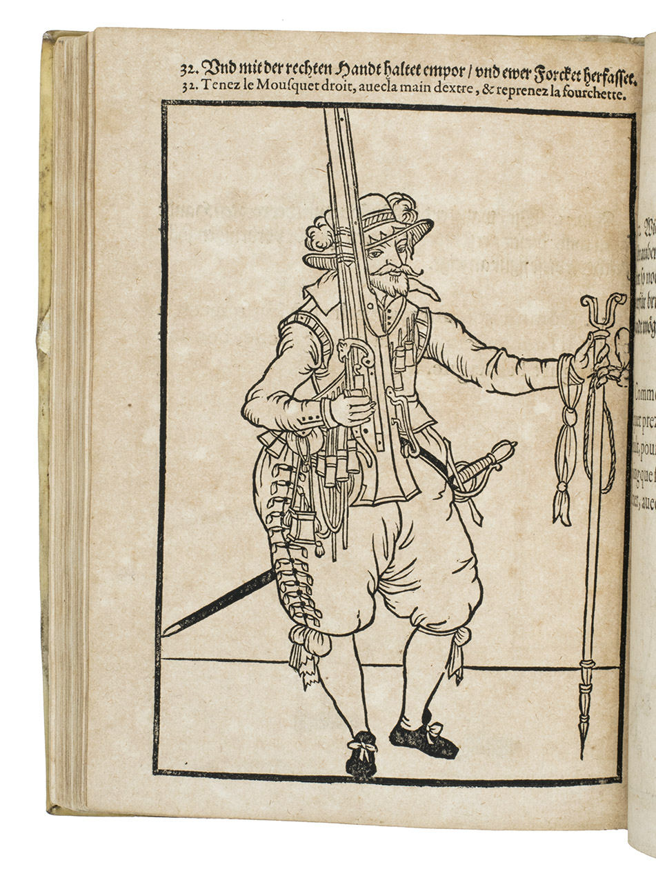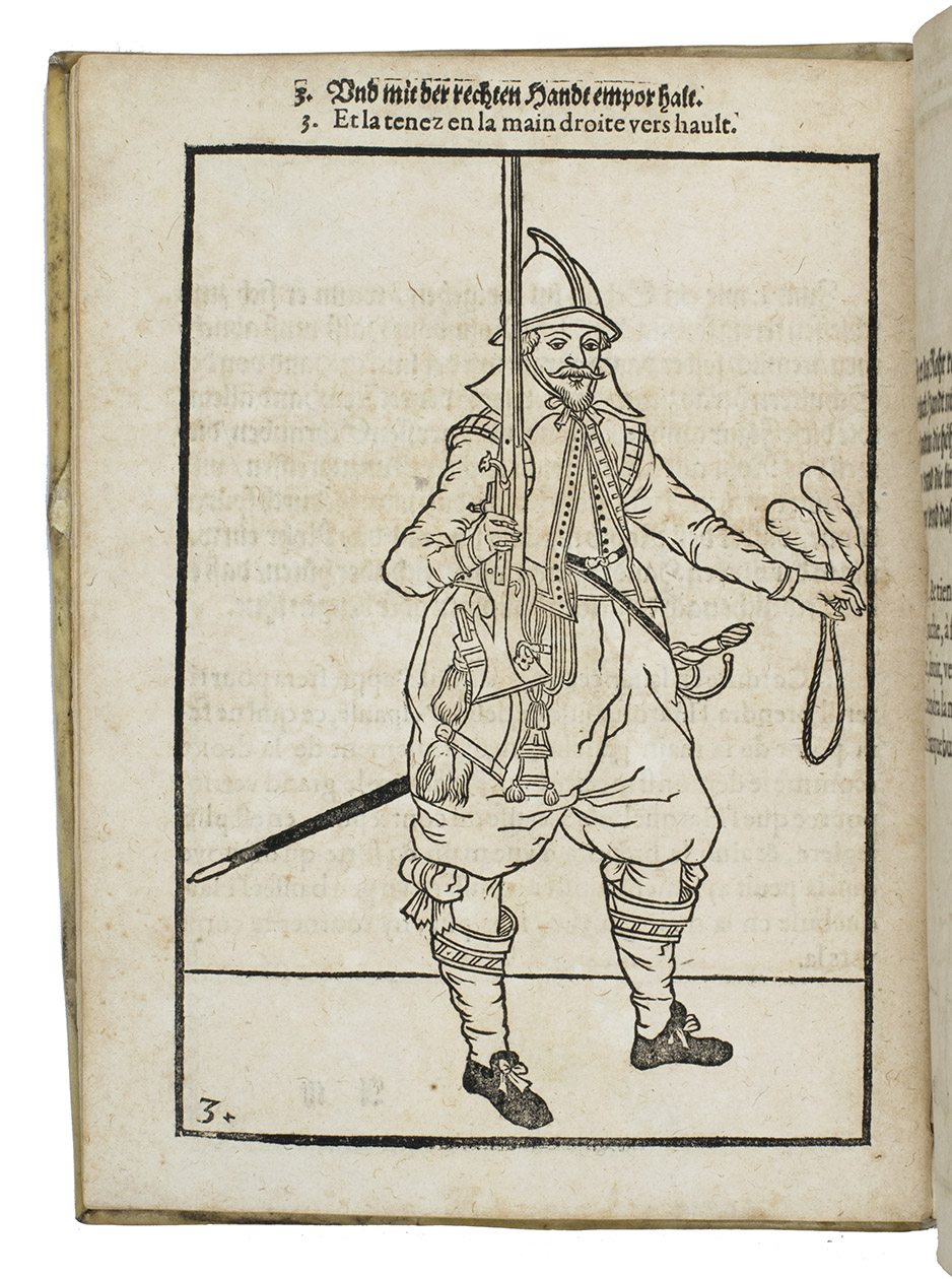 Rare first edition published in Germany, with woodcuts instead of engravings, of a military manual known in English as The exercise of arms, it was written and illustrated by Jacques de Gheyn and quickly became a famous pictorial army manual for use of officers to teach the young recruits how to handle their weapons: the arquebus (part 1), musket (part 2) and pike (part 3). The text, here in German and French, gives a short explanation of the illustrations. It gives an excellent picture of the successful army of the Dutch Republic after its reform by Prince Maurits, who (re)introduced exercises and discipline. It also immortalizes Prince Maurits as a military thinker and commander of the most disciplined army of his age.