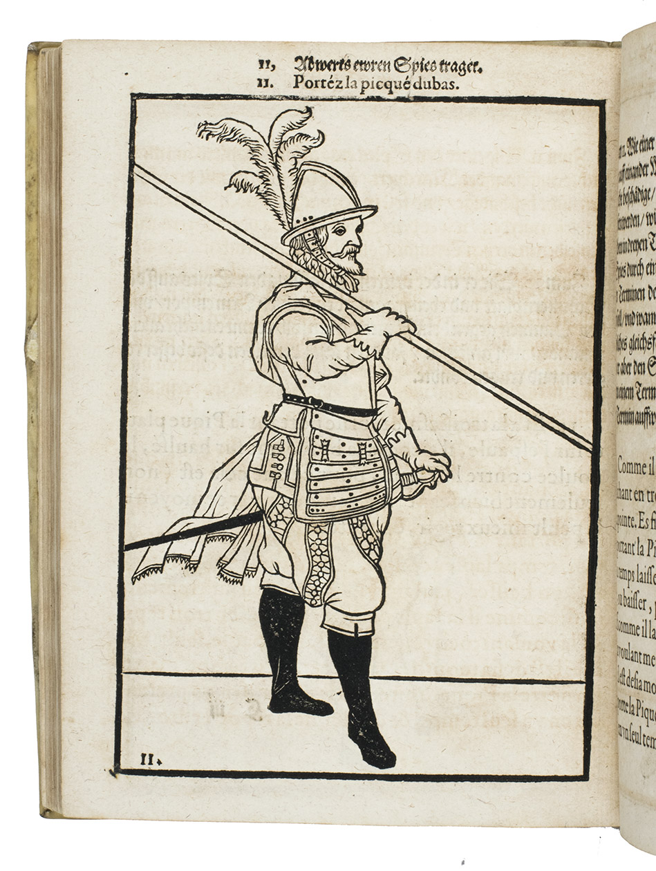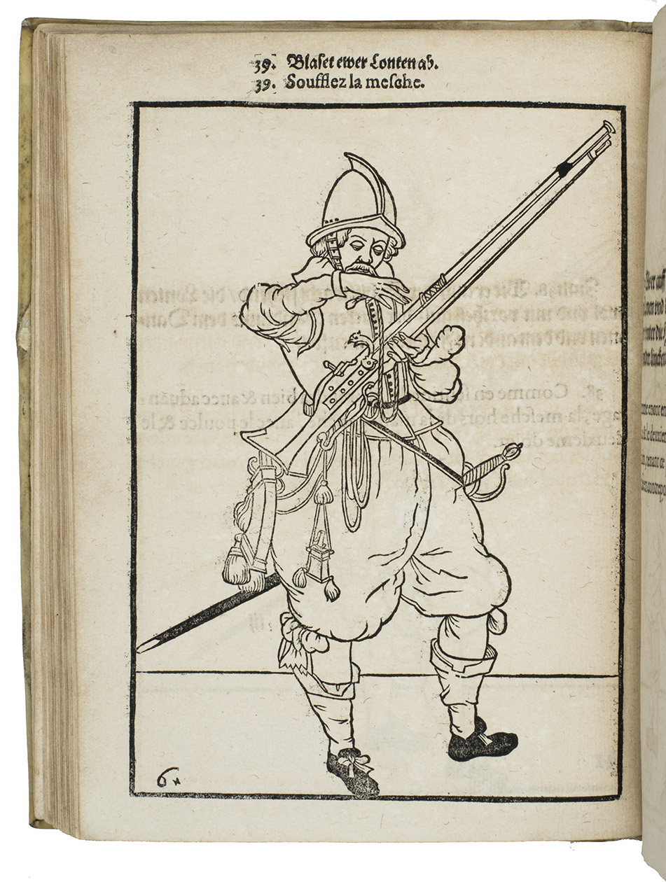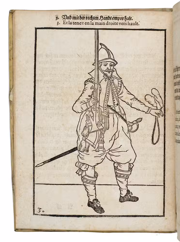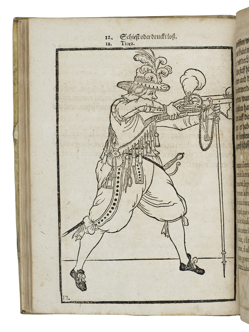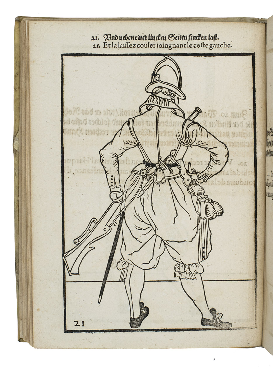 Rare first edition published in Germany, with woodcuts instead of engravings, of a military manual known in English as The exercise of arms, it was written and illustrated by Jacques de Gheyn and quickly became a famous pictorial army manual for use of officers to teach the young recruits how to handle their weapons: the arquebus (part 1), musket (part 2) and pike (part 3). The text, here in German and French, gives a short explanation of the illustrations. It gives an excellent picture of the successful army of the Dutch Republic after its reform by Prince Maurits, who (re)introduced exercises and discipline. It also immortalizes Prince Maurits as a military thinker and commander of the most disciplined army of his age.