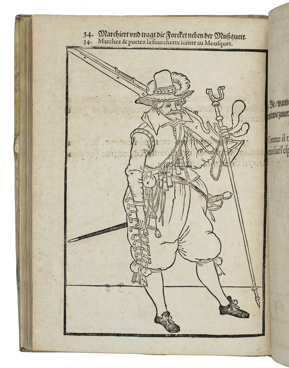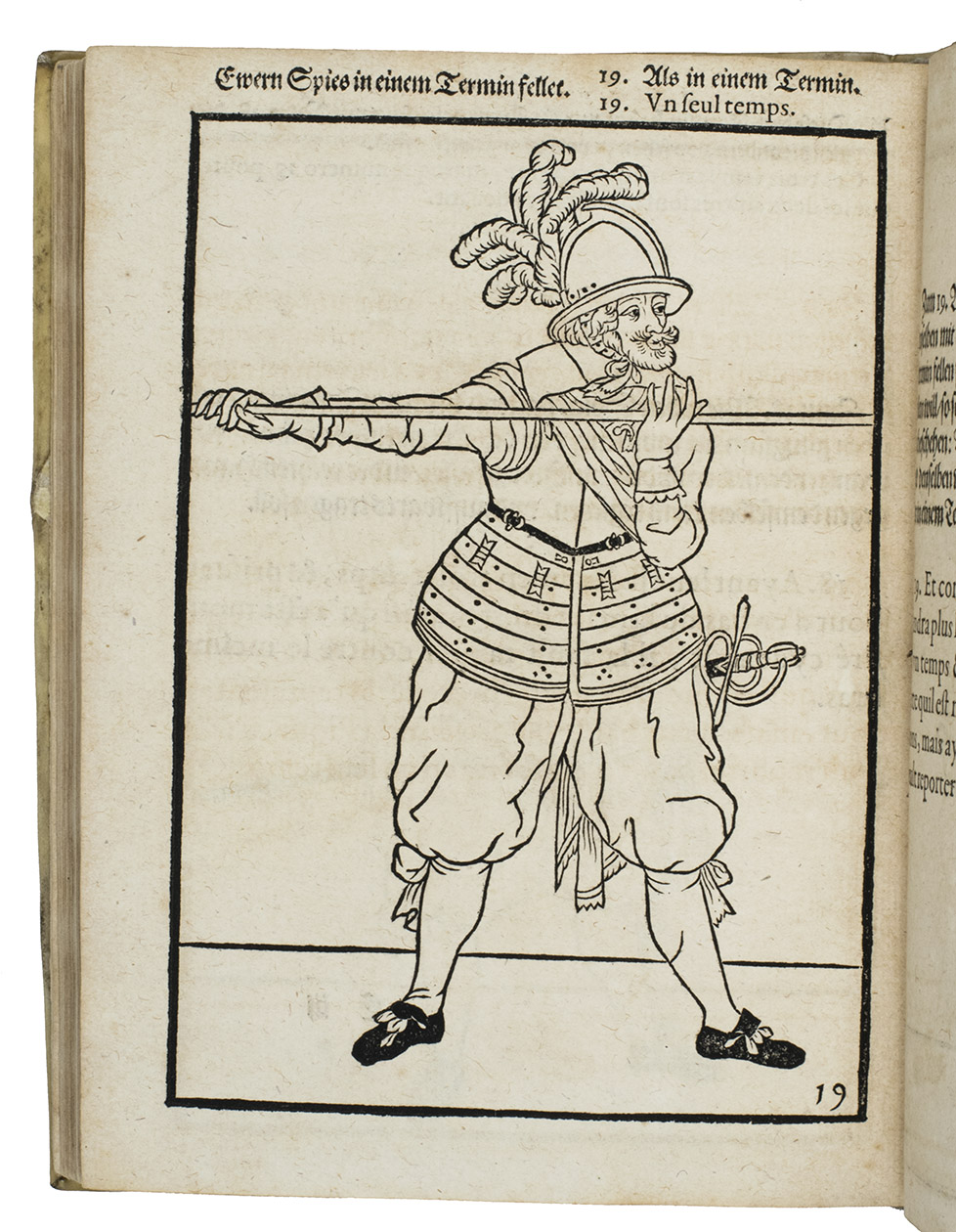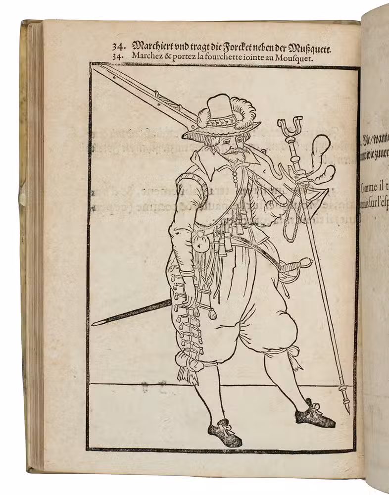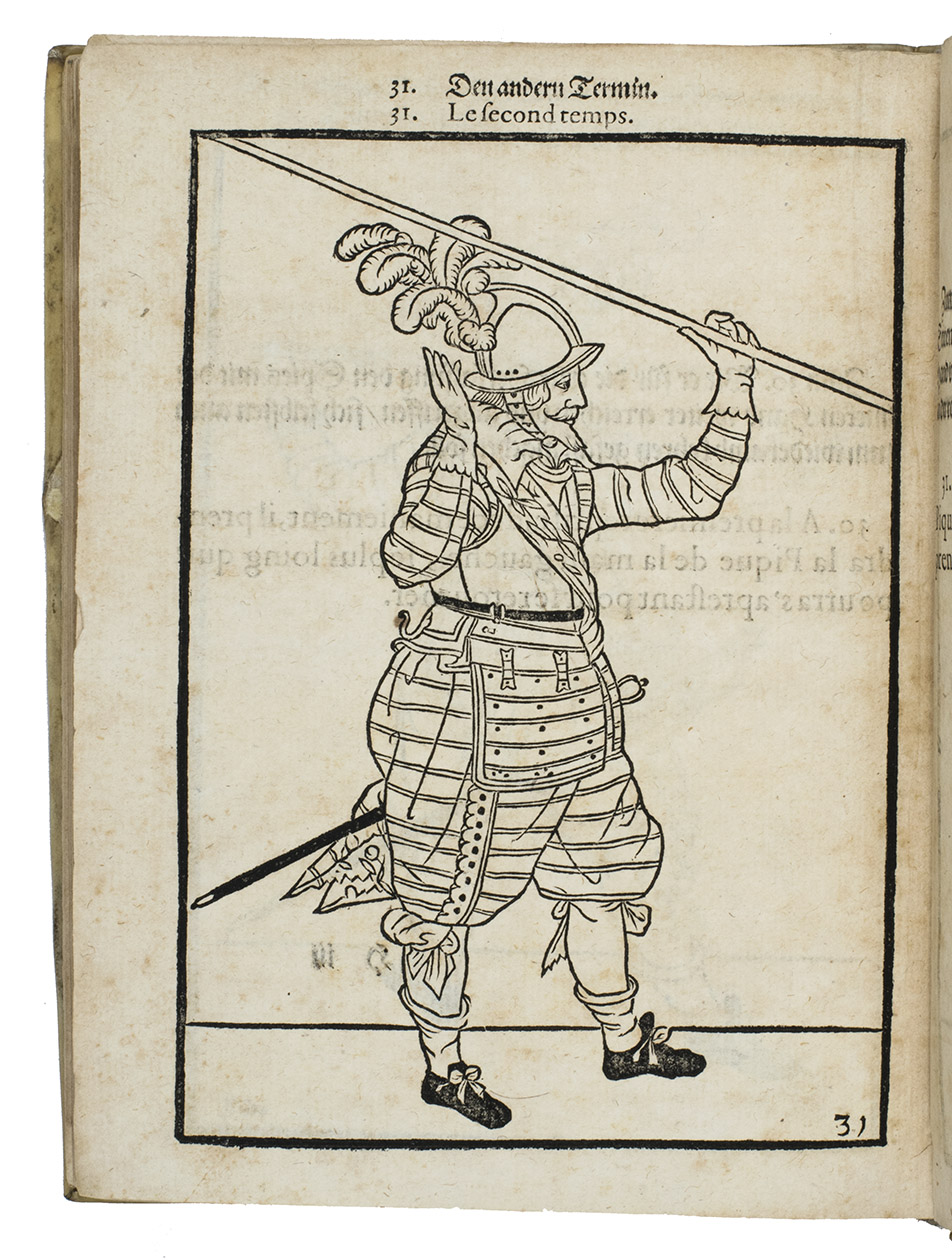 Rare first edition published in Germany, with woodcuts instead of engravings, of a military manual known in English as The exercise of arms, it was written and illustrated by Jacques de Gheyn and quickly became a famous pictorial army manual for use of officers to teach the young recruits how to handle their weapons: the arquebus (part 1), musket (part 2) and pike (part 3). The text, here in German and French, gives a short explanation of the illustrations. It gives an excellent picture of the successful army of the Dutch Republic after its reform by Prince Maurits, who (re)introduced exercises and discipline. It also immortalizes Prince Maurits as a military thinker and commander of the most disciplined army of his age.