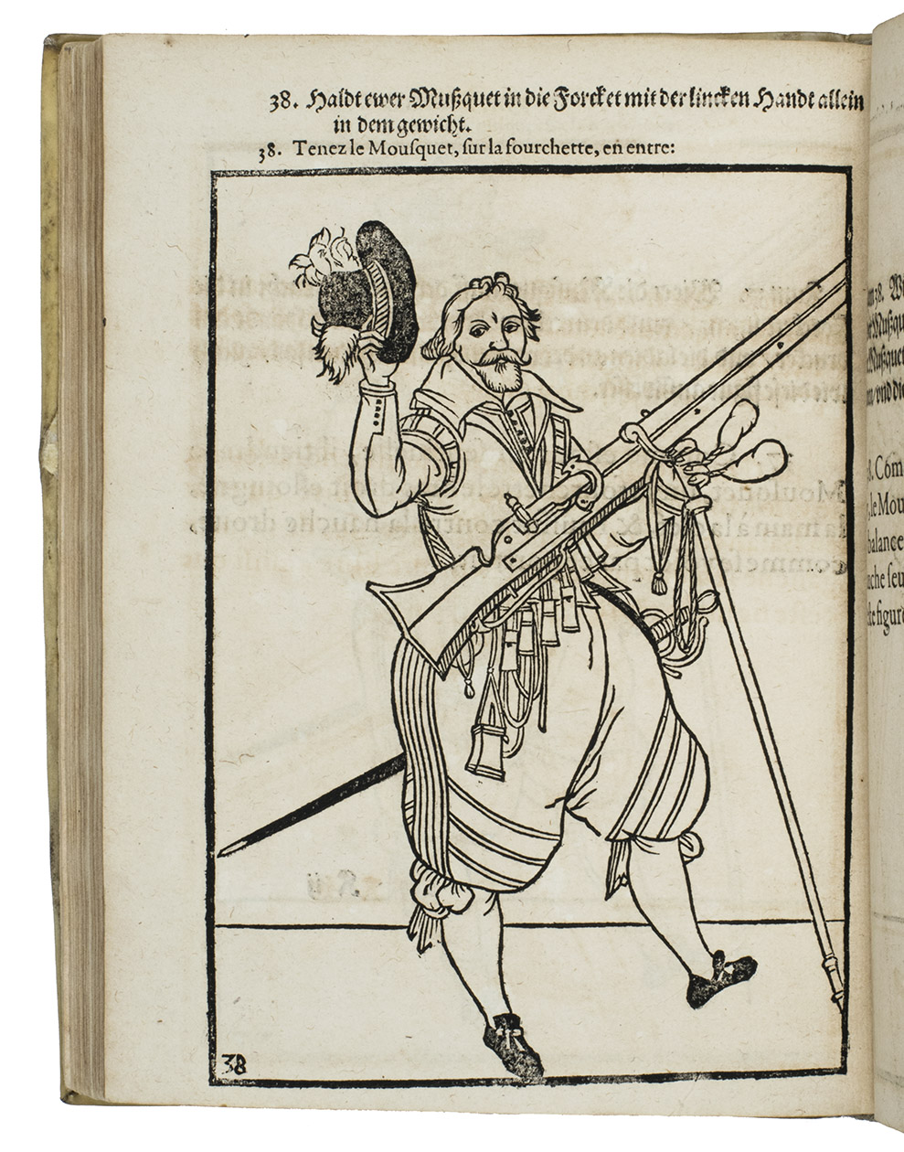 Frankfurt, Wilhelm Hoffmann, 1609. 3 parts in 1 volume. 4to. With the letterpress title within engraved border (including the imprint), and 3 series of 42, 43 and 32 full-page numbered woodcuts, showing exercises with the arquebus, musket and pike. Contemporary vellum, rebacked. [3], [1 blank], [43], [1 blank], [44], [36] ll.