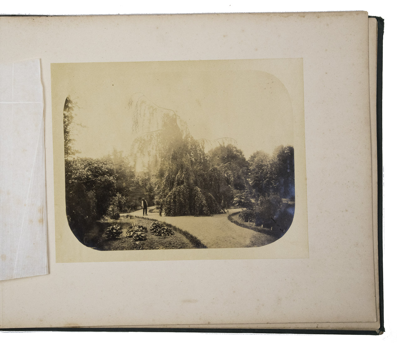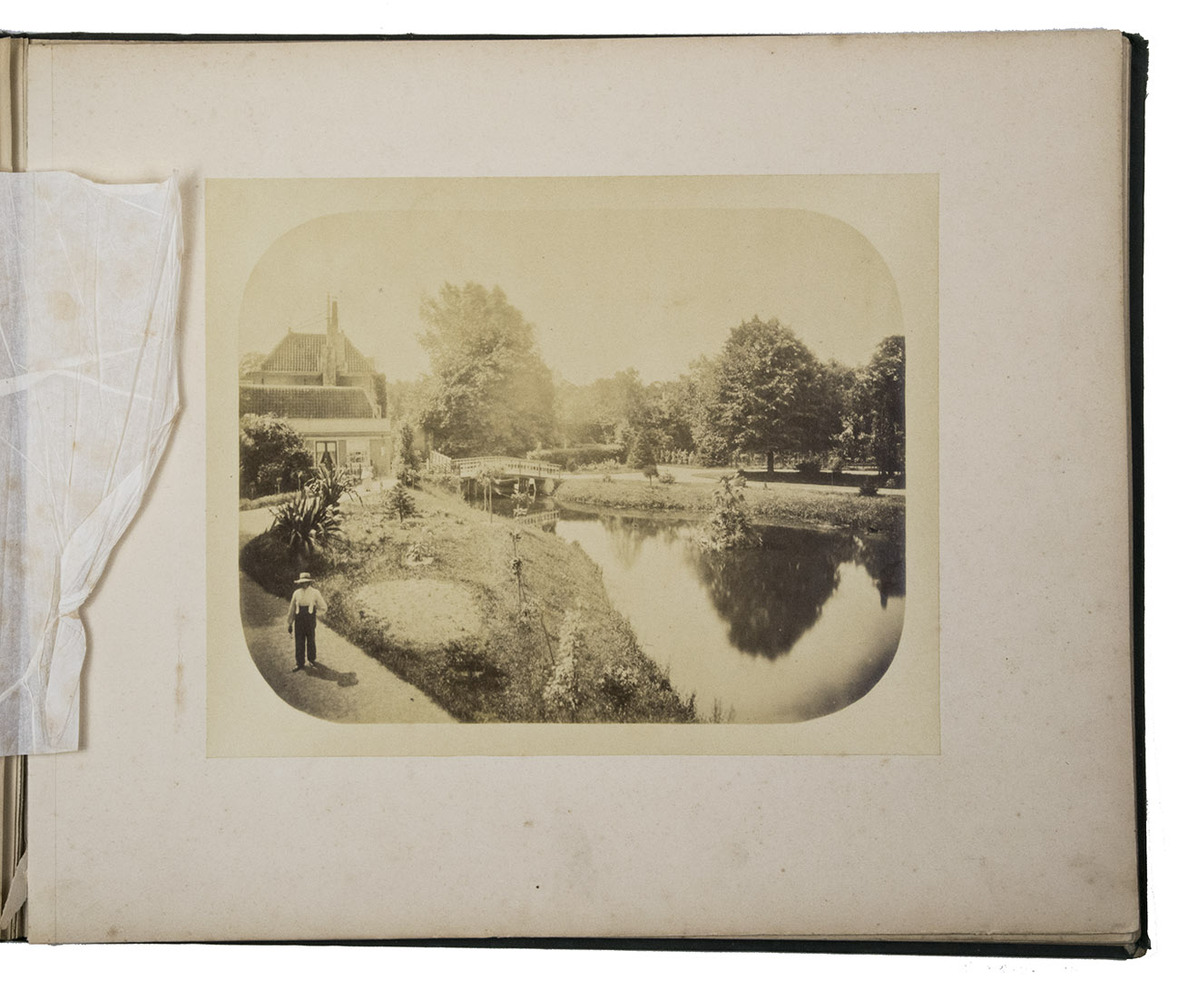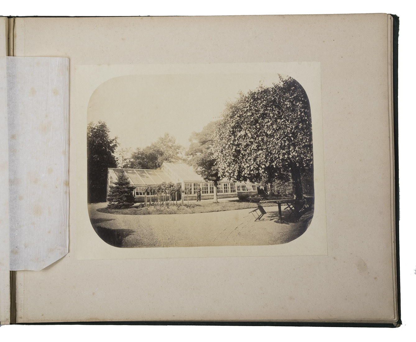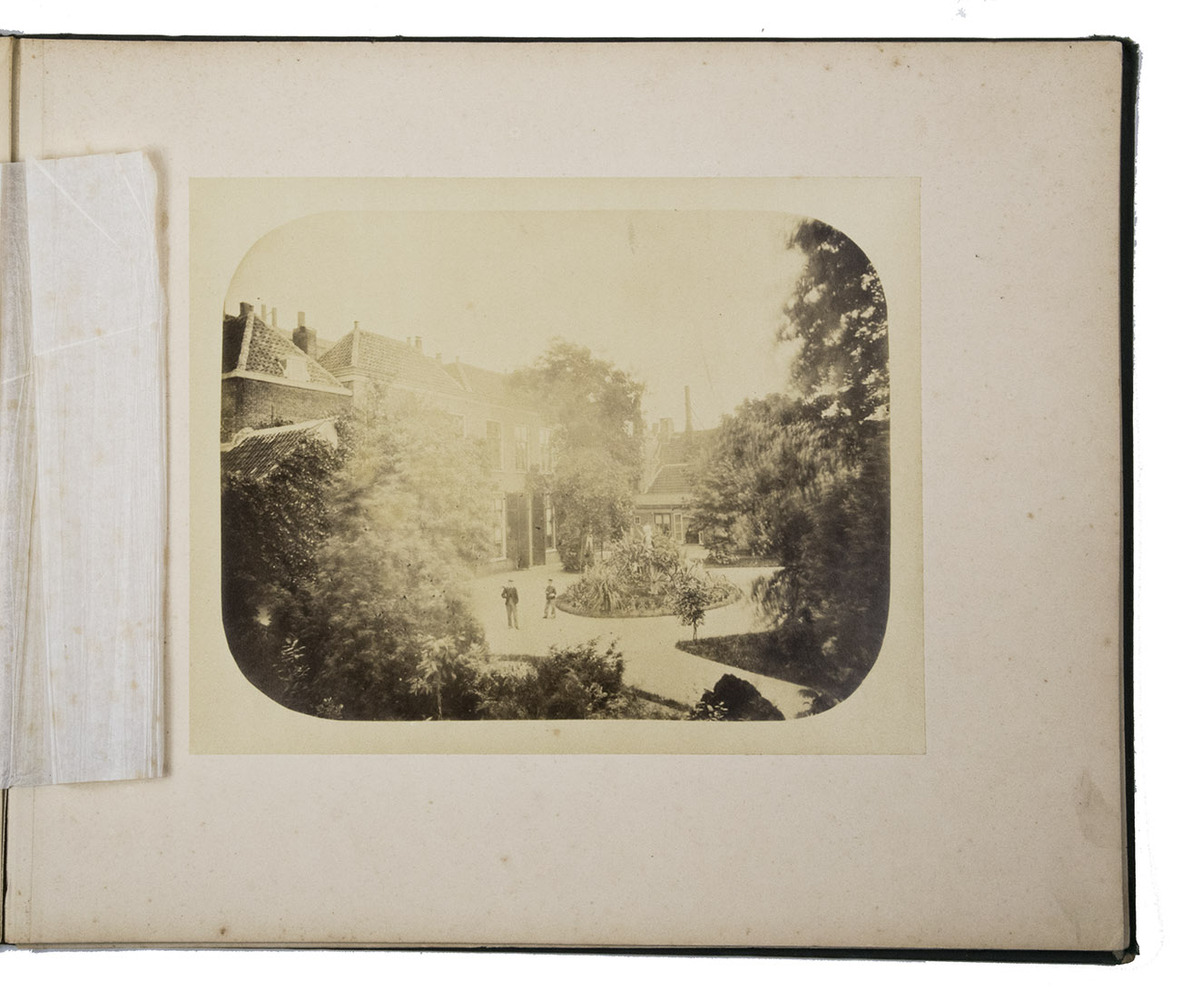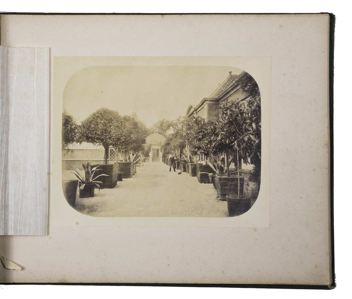 Twelve beautiful original photographic albumen prints taken in the Hortus Botanicus of Leiden University, the first botanical garden in the Northern Netherlands, founded in 1590. The locations of many of the photographs are still recognizable, including most of the buildings, "the bust near the bee-hives" and the Witte Singel (the canal next to the garden). Jan Goedeljee (1824-1905) began as bookbinder in Leiden but from 1865 on he preferred to be known as photographer. He had a studio on the Hogewoerd and already in 1866 he published this collection of 12 photographic albumen prints. Specializing also in portrait photography, including portraits of members of the Royal family, he called himself "Court photographer".
