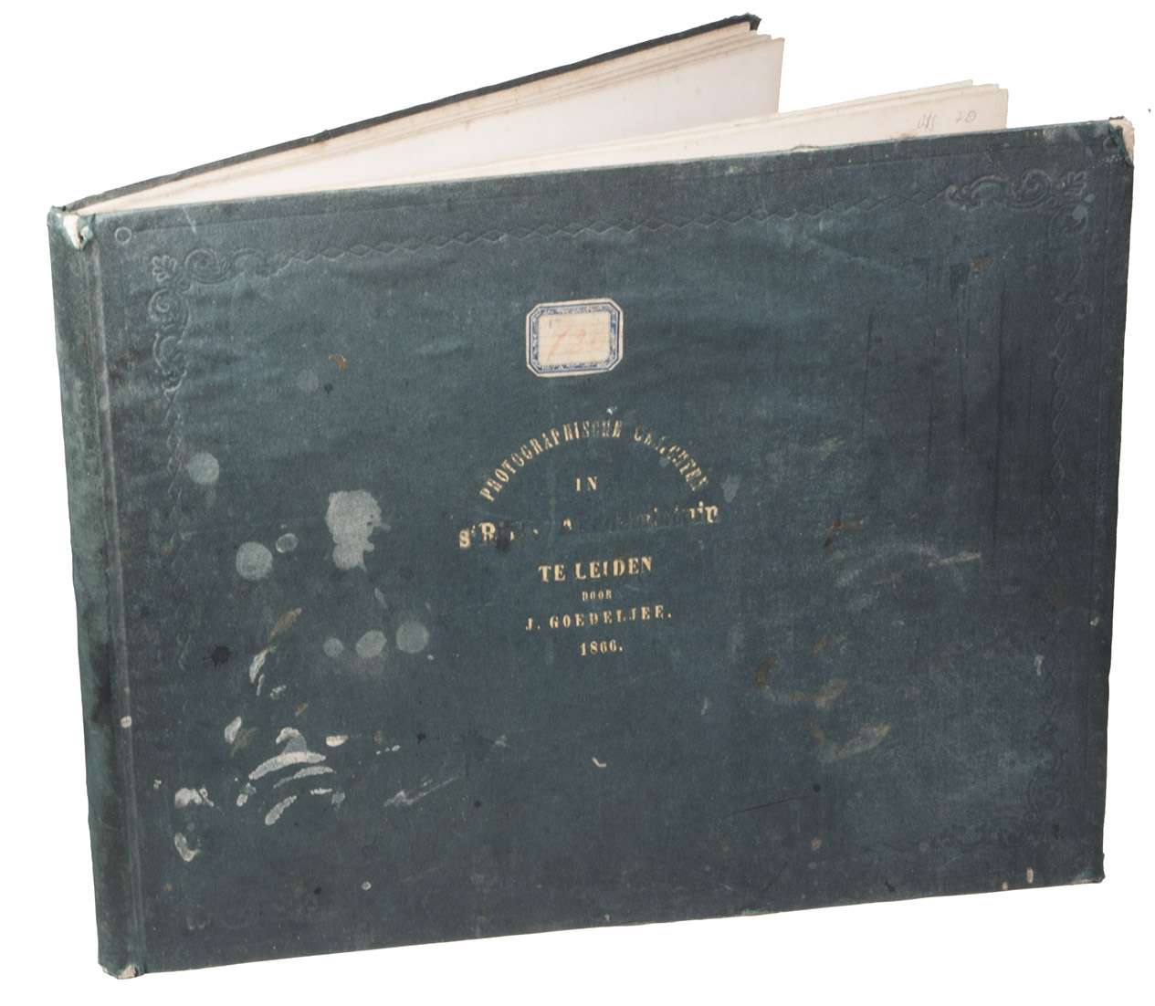 Leiden, 1866. Oblong folio. 12 original photographic albumen prints (ca. 19.5 x 25 cm) with rounded corners, mounted on paperboard leaves (30.5 x 37 cm), with tissue guard leaves. Contemporary blind-tooled green cloth with title in gold on the front board, silk endpapers. [12] ll.
