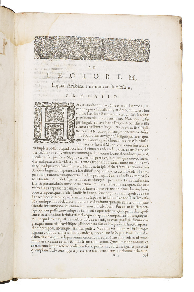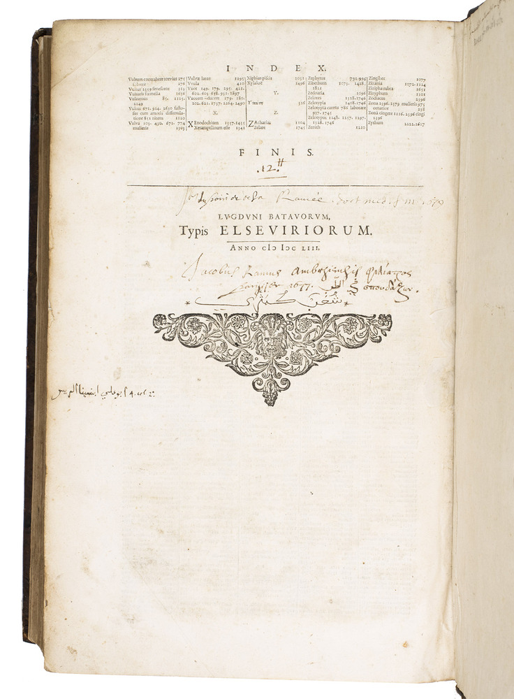 With an owner's inscription on the title-page ("Jacobus du Poirier Ambosiensis [Greek text] Parisii .. 1677 [Arabic text]") and around the colophon (above: "J.bs. du poirier de la Ramée. doct. med. fm. 1679" and below: "Jacobus Ramus Ambaesiensis [Greek text] Parisii .. 1677. [Arabic text]" and some Arabic text further below): from the library of Jacques du Poirier de la Ramée, a French doctor and scholar from Tours . Further with a manuscript inscription on the recto of the final black flyleaf, and occasional manuscript annotations in Arabic, Latin, and Greek in the margins, probably by Jacques du Poirier de la Ramée. The spine and corners of the boards show some signs of wear (with some minor loss of material) and the joints are slightly weakened, the front free flyleaf is modern, some occasional foxing, a small water stain in the top inner corner of the leaves, some occasional very small ink stains in the margins. Otherwise in good condition. De Nave 91; Rahir, Les Elzeviers, 723; Schnurrer 79; Smitkamp, Philologia orientalis 314; STCN 117768960 (8 copies, including 1 incomplete); Vrolijk & Van Leeuwen, Arabic studies in the Netherlands, pp. 47-48; Willems, Les Elzevier, 723; cf. for Jacques du Poivier de la Ramée see: Jean-Luc Deuffic, "Jacques du Poirier, doctor in Tours, bibliophile and erudite Hellenist" (online 26 September 2011, https://pecia.blog.tudchentil.org/2011/09/26/jacques-du-poirier-medecin-a-tours-bibliophile-et-helleniste-erudit/).