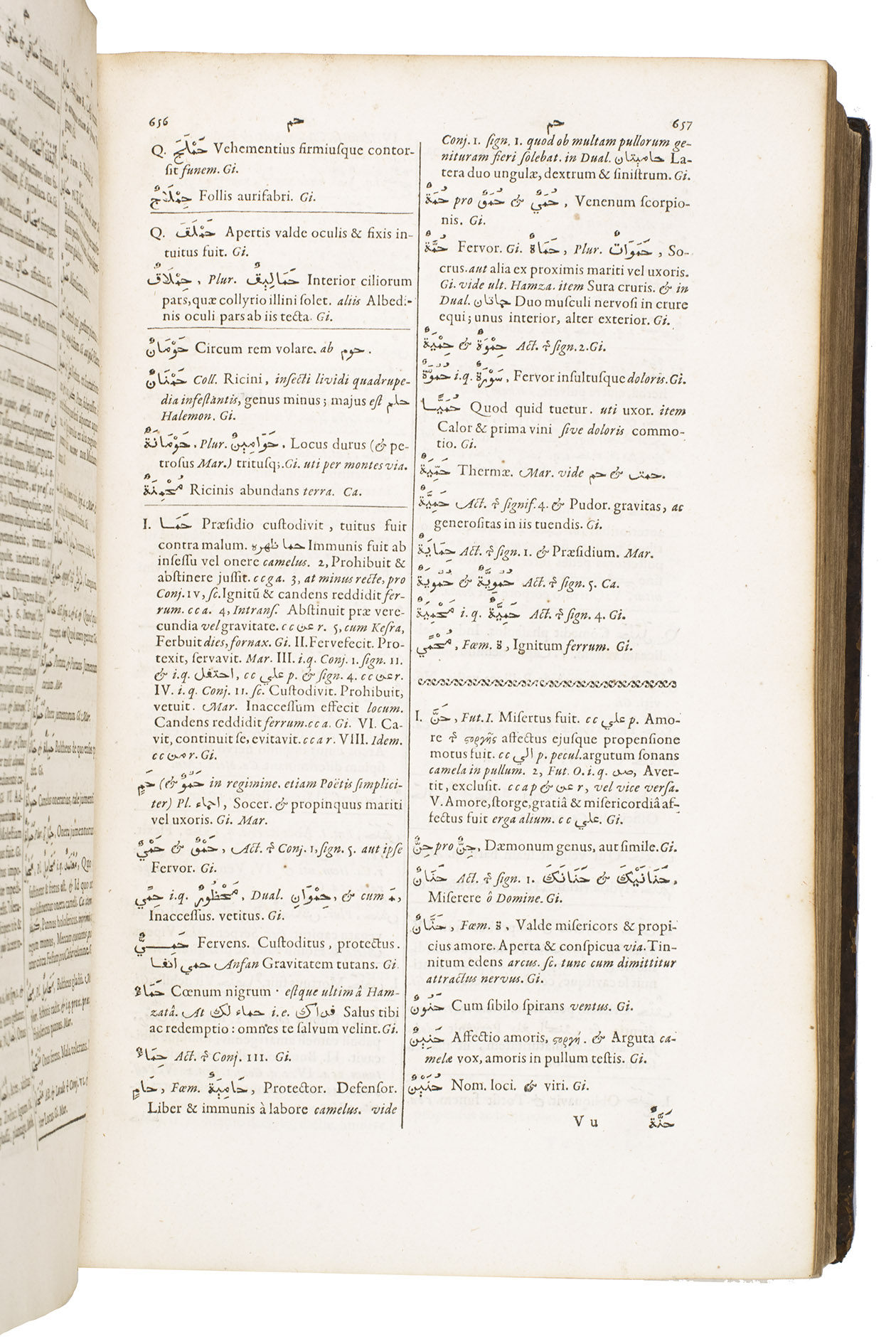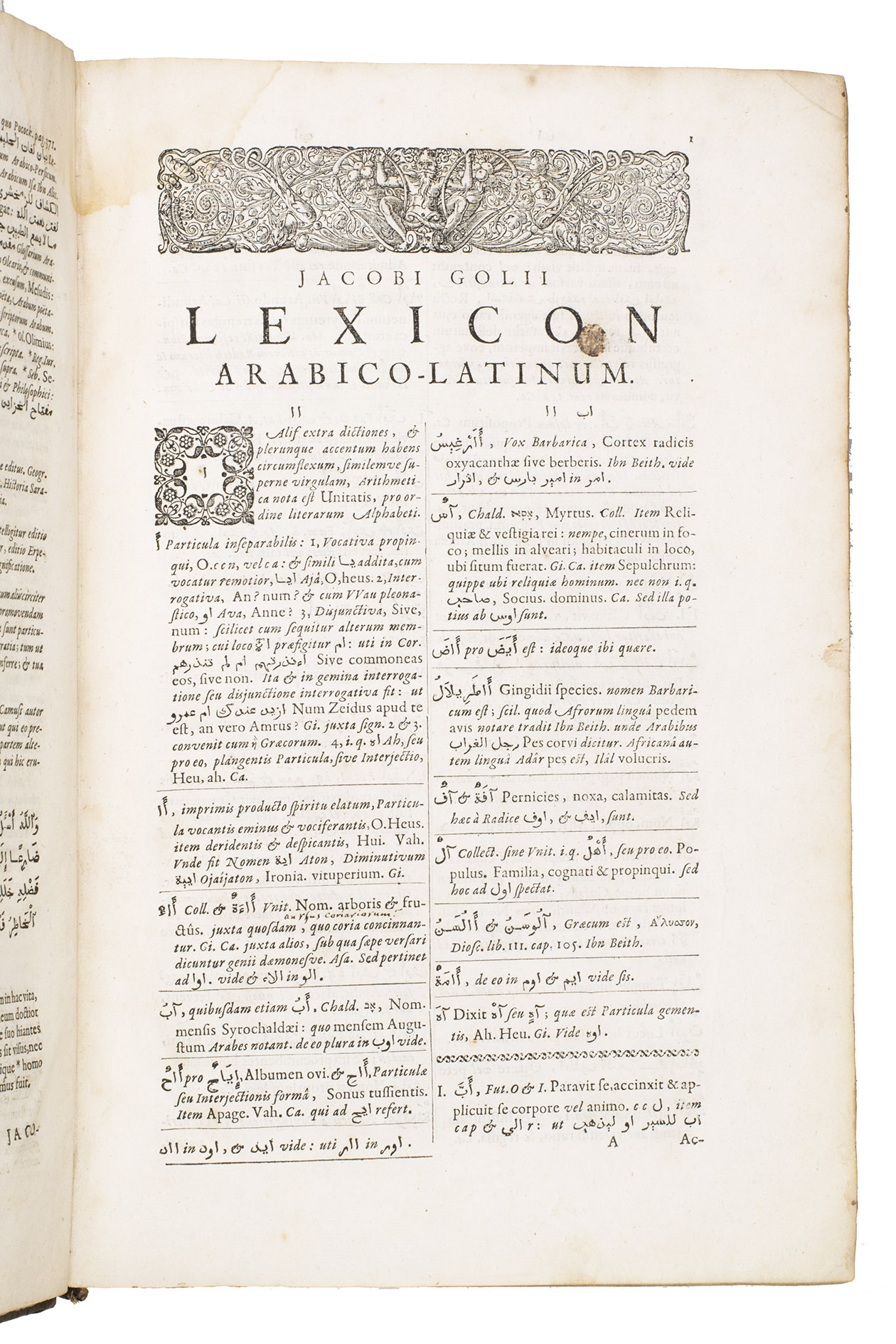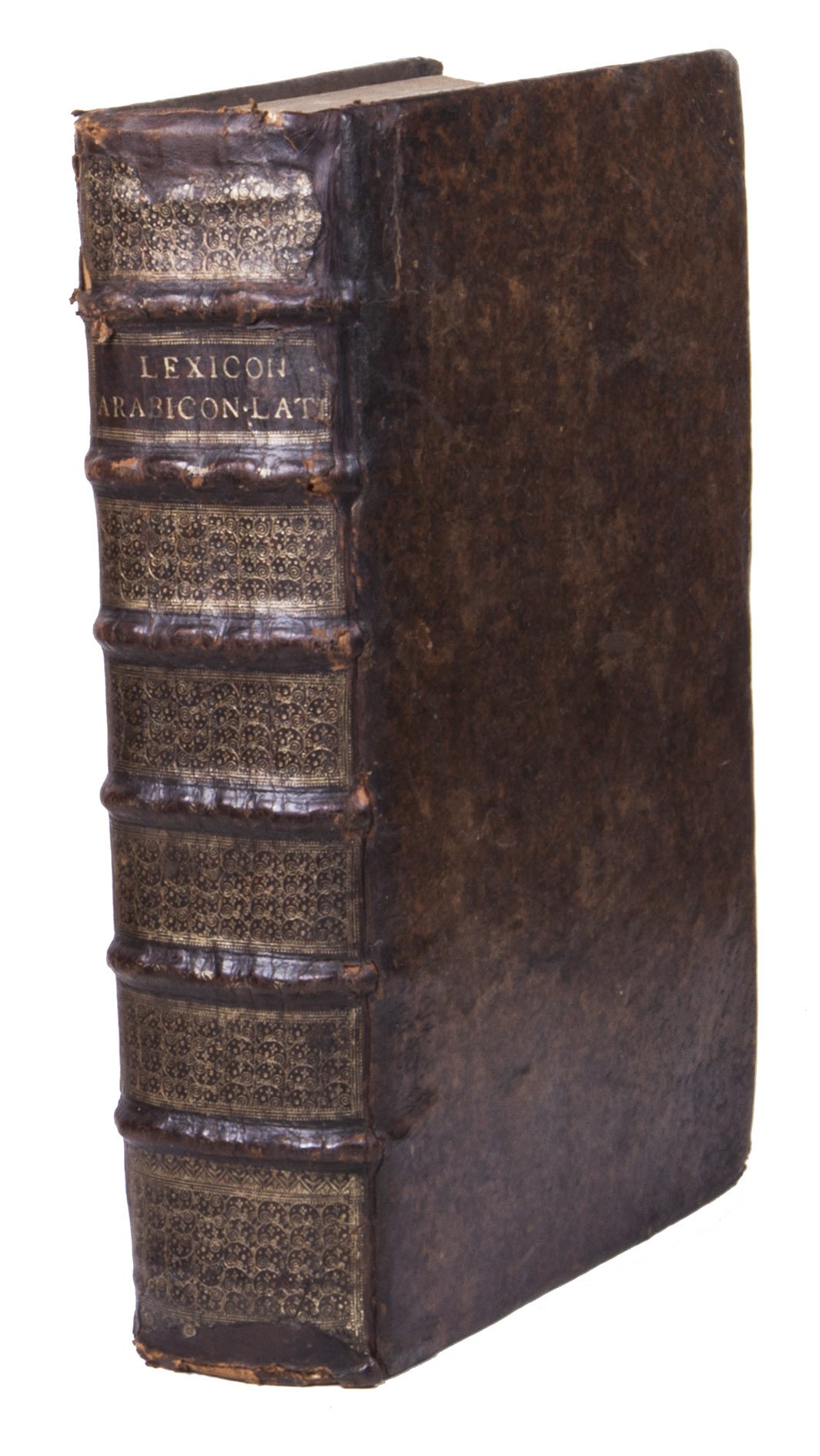 First edition - the Elzevier and Janssonius issue - of Golius's ground-breaking Arabic lexicon, which remained the most important dictionary in European Arabic studies until Freytag's dictionary appeared in the 1830s. Golius based his dictionary on a variety of Arabic lexicographical texts, the most important being al-Jawhari's Sahah and Firuzabadi's Qamus, but he also used geographical and zoological sources such as al-Damiri's book on animals. His dictionary included, moreover, Arabic words derived from other languages, most notably Turkish and Persian, which he translated directly from the source language, using Turkish and Persian glossaries. The work concludes with an extensive index, containing some 10,000 entries. "The manner in which Golius arranged his dictionary, according to the Arabic root letter and the verbal and substantival forms with all their derivates, is still the fundamental criterion of Arabic dictionaries in European languages" (Vrolijk & Van Leeuwen). The book was produced in four simultaneous issues, differing only in the imprint, all noting Bonaventura and Abraham Elzevier as printers (the colophon also noting the Elzeviers as printers), one apparently for their own distribution and others noting the book's sale by Johannes van Ravesteyn in Amsterdam or Arnout Leers in Rotterdam rather than the present Johannes Janssonius. It was for a long time the best resource we had on the Arabic language (Willems 723).