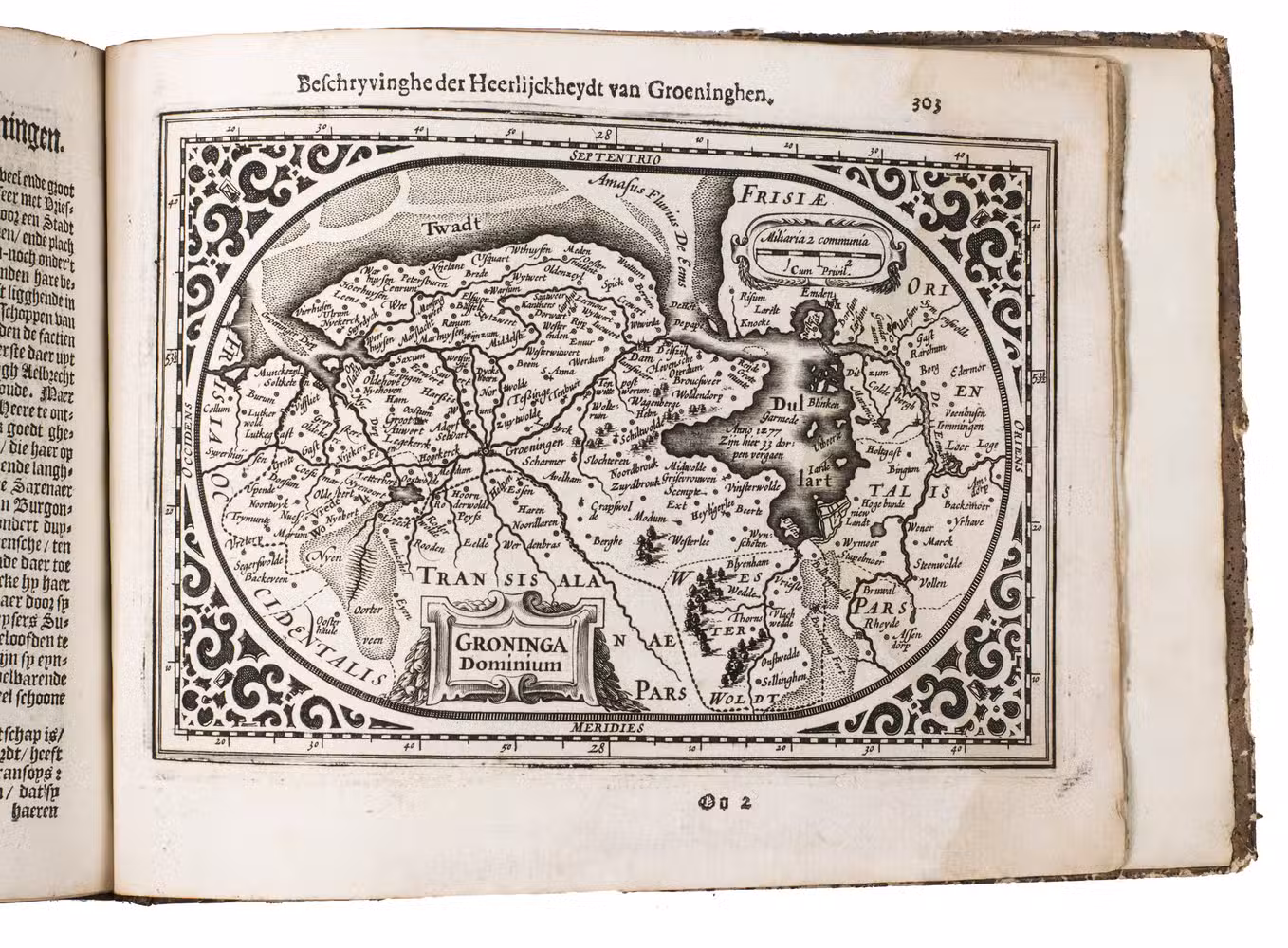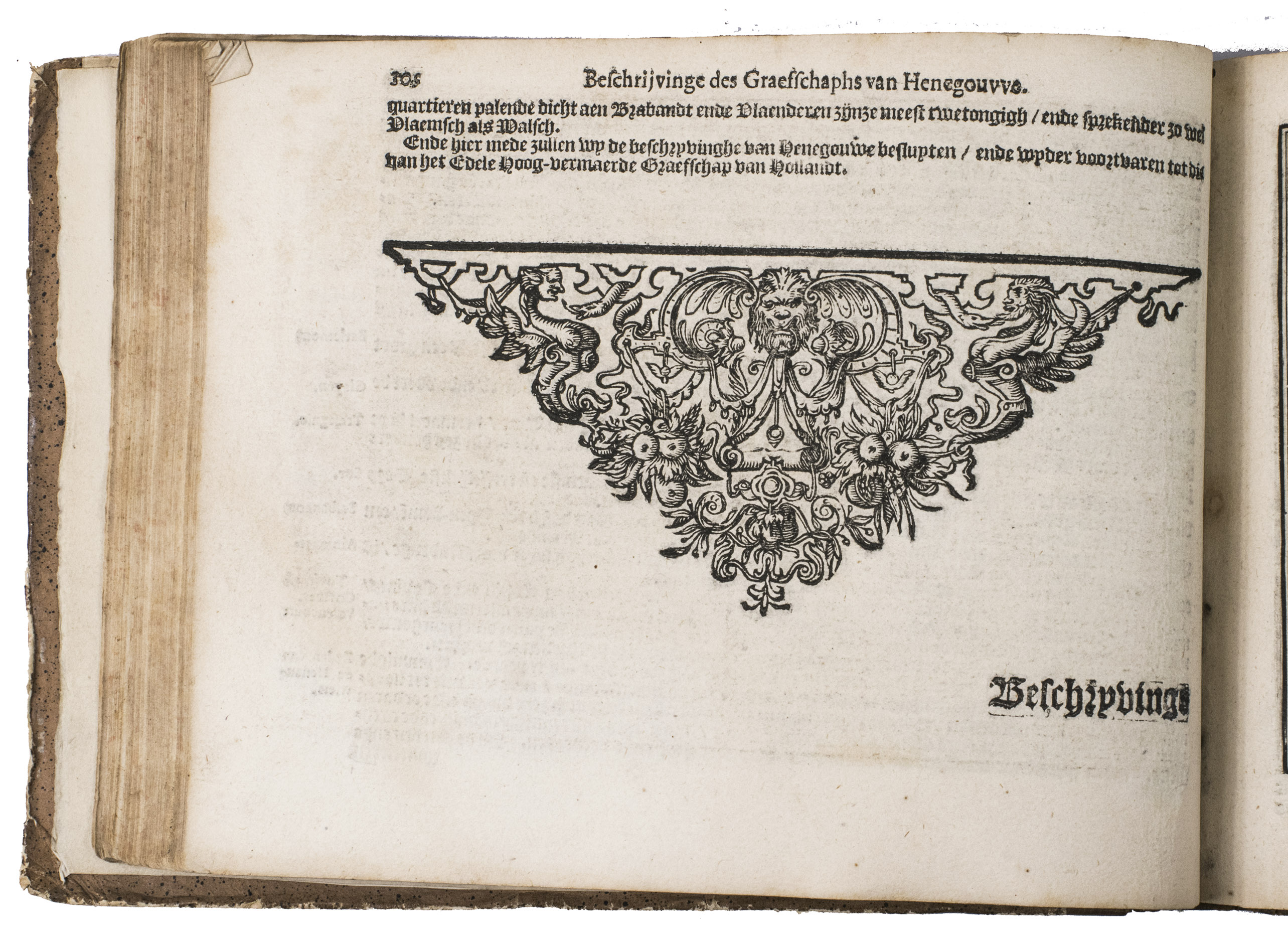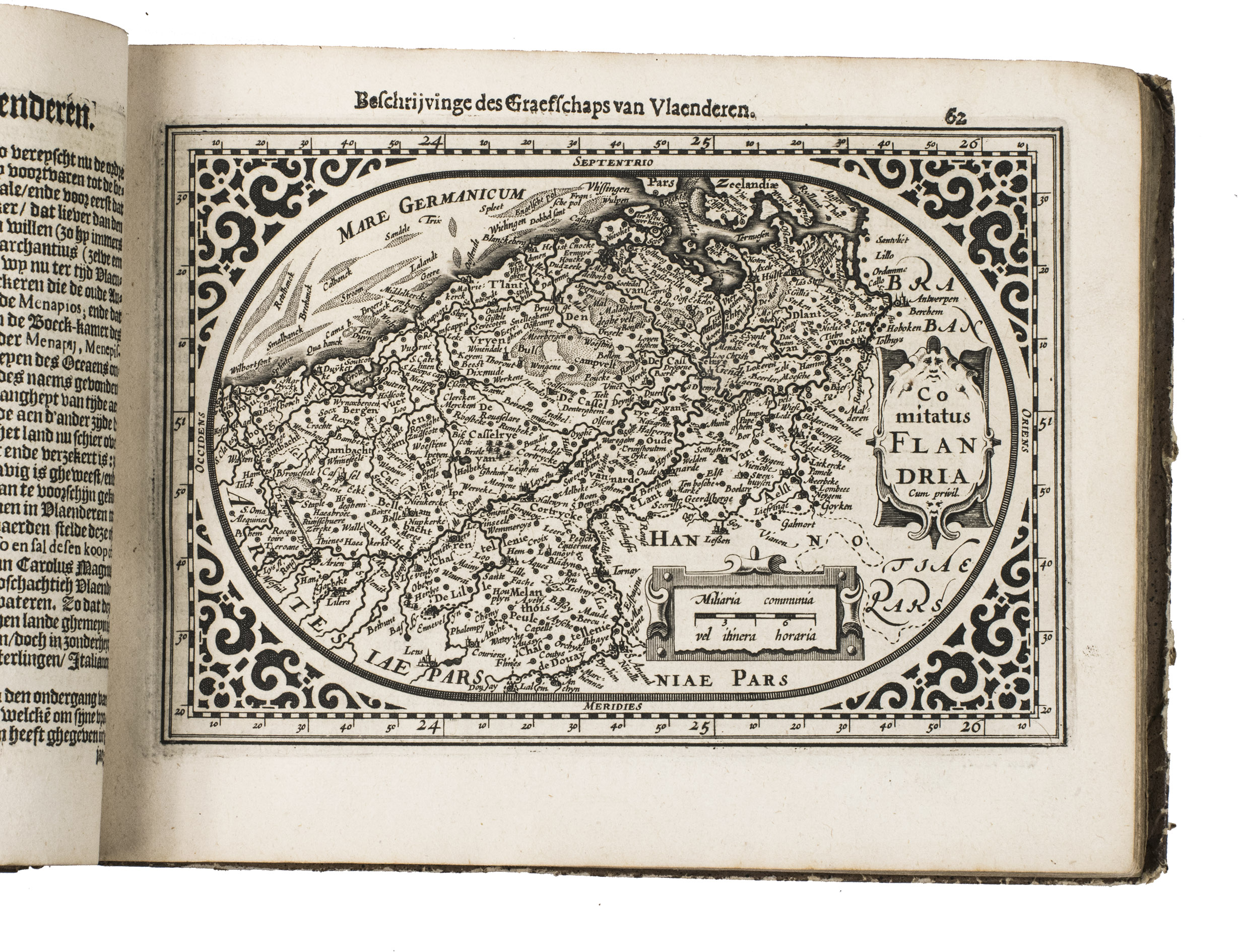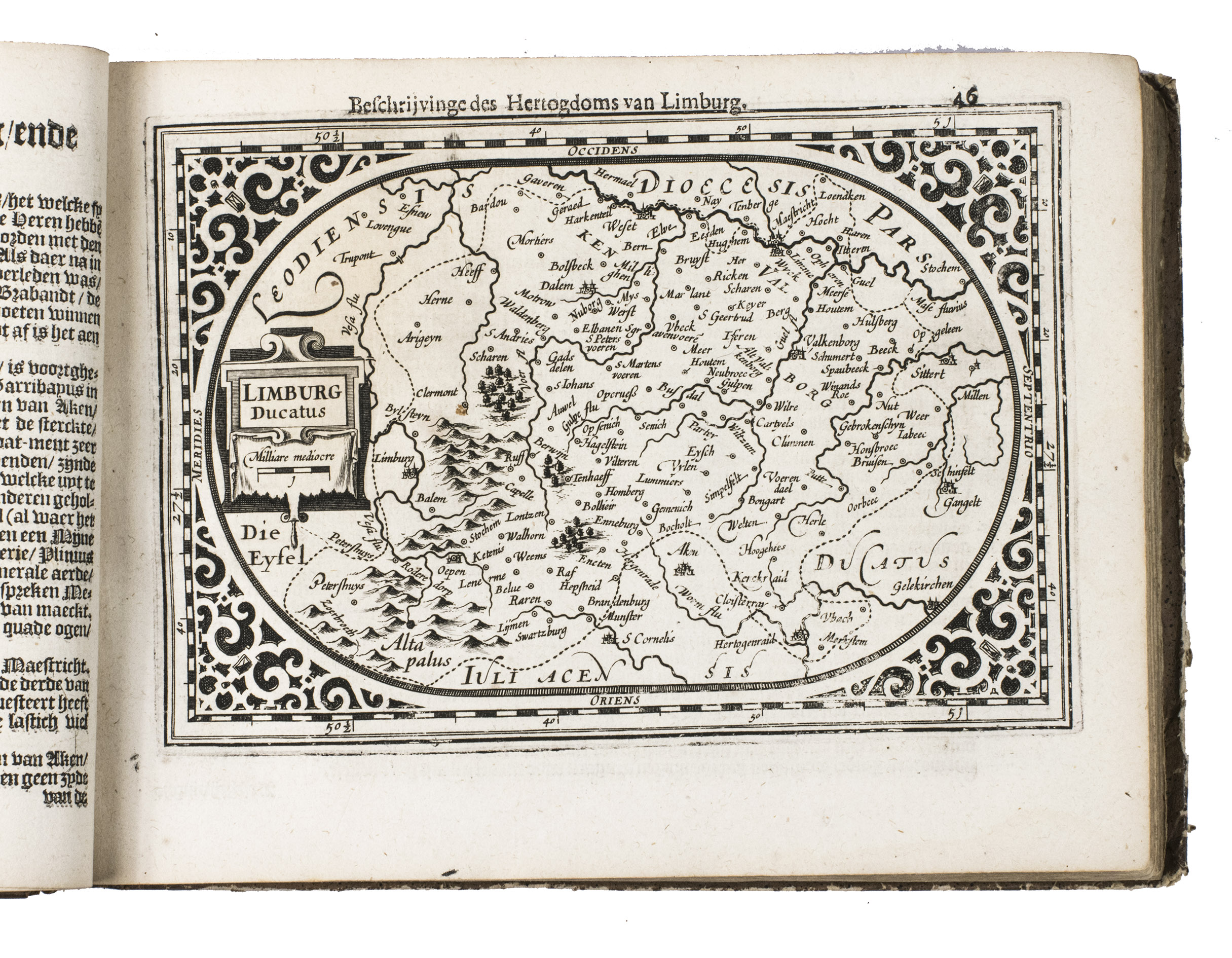 Amsterdam, Abraham Goos in de Kalverstraet, [1616]. Oblong 4to (ca. 16 x 21 cm). With an engraved title page (signed by P.S[erwouter] scul. (bottom right) after D.V[inck] B[oons] (bottom left)), 23 full page maps, several decorated woodcut initials and woodcut tailpieces. 19th-century quarter calf. [7], "305" [=294], [2], [1 blank] pp.