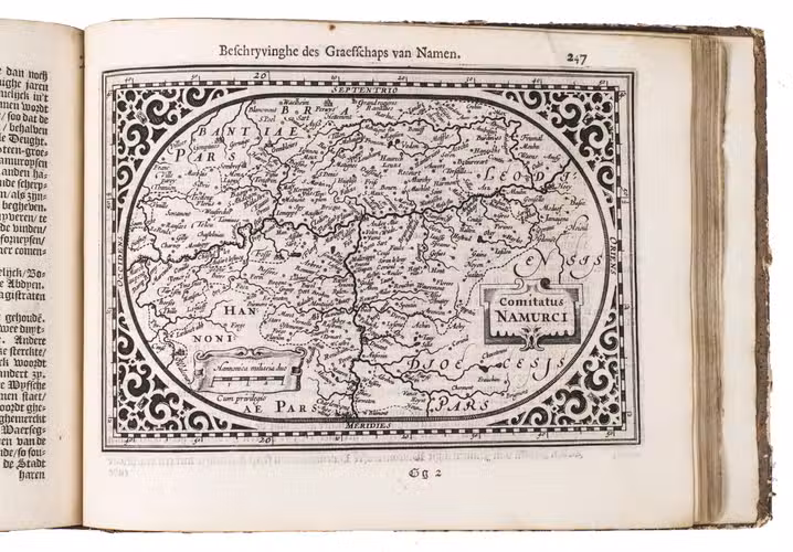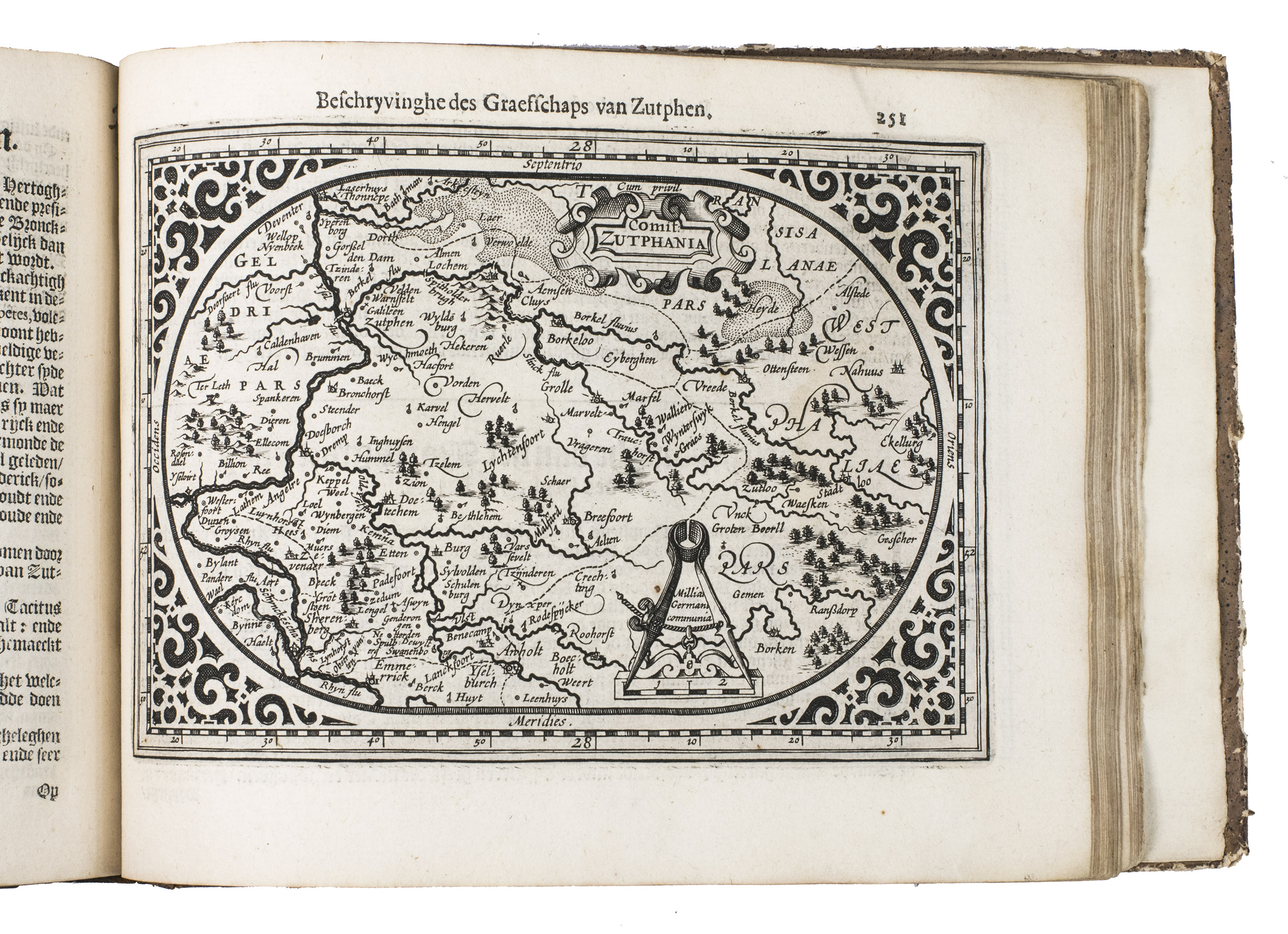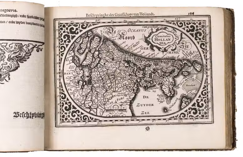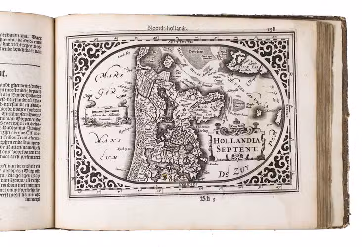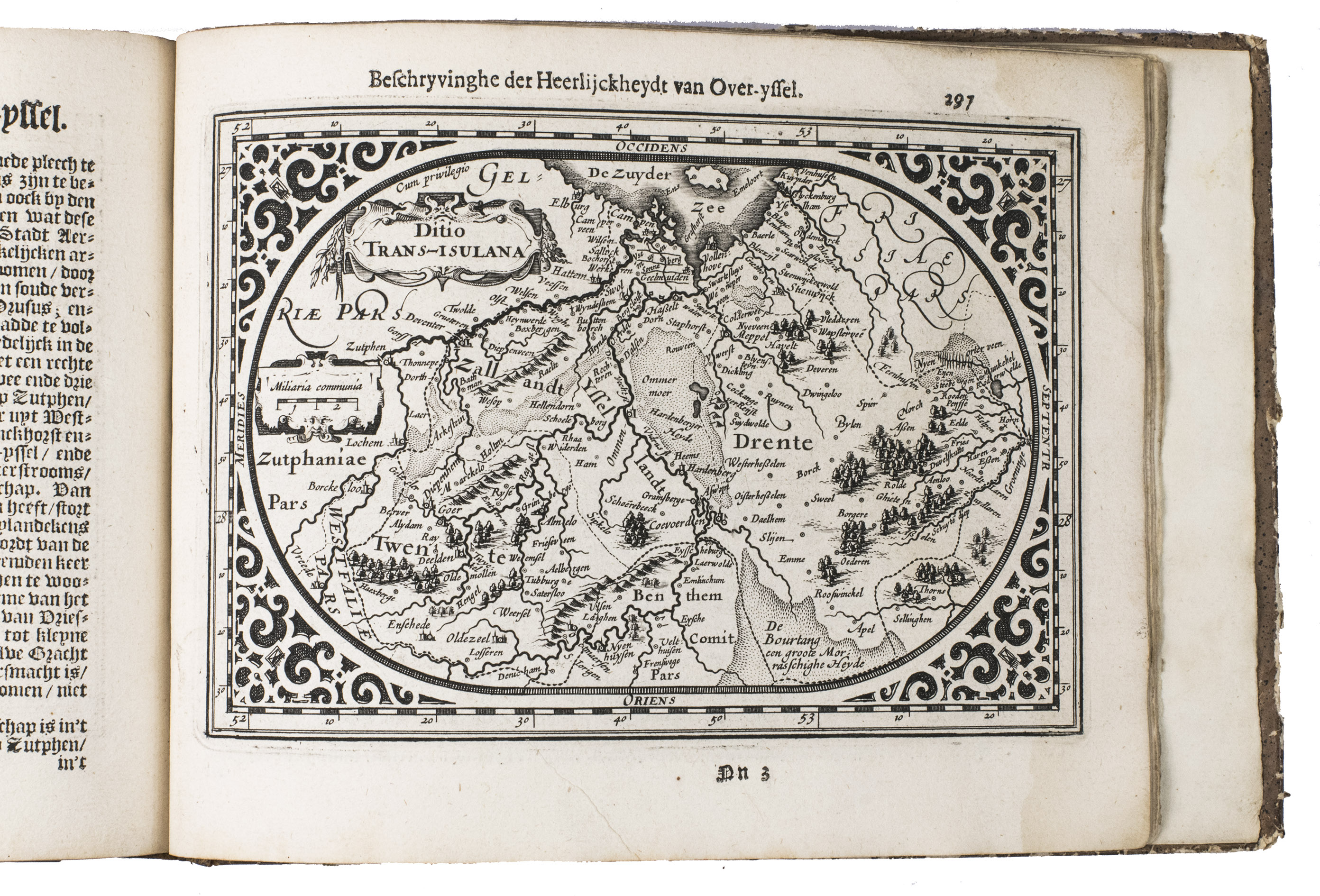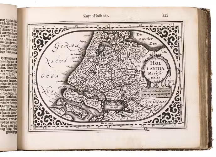 Rare first edition of one of the first atlases of the Low Countries, with 23 very detailed maps. It is the only atlas published by the mapmaker, Abraham Goos, himself. At the time the present atlas was published, the Seven United provinces (The Northern Netherlands) were still together with the 10 provinces of the Spanish or Habsburg Low Countries. The atlas includes two maps of the Low Countries as a whole, one map of each of the seventeen provinces (except Drenthe, which is included in the map of Overijssel), four additional maps of Holland, and one additional map of Brabant. Gooss maps were also used for the Atlas Minor, published by Johannes Janssonius in 1628.